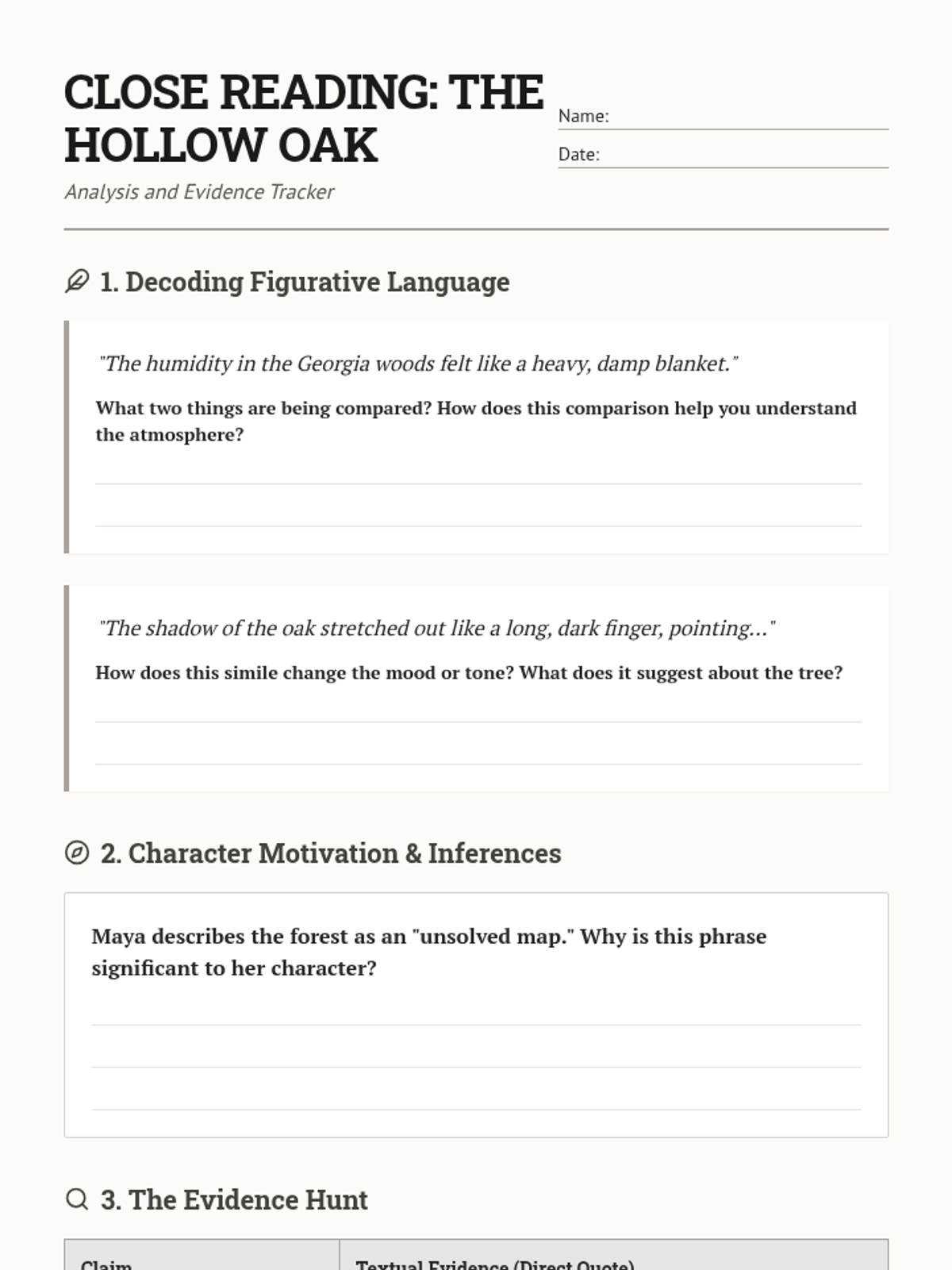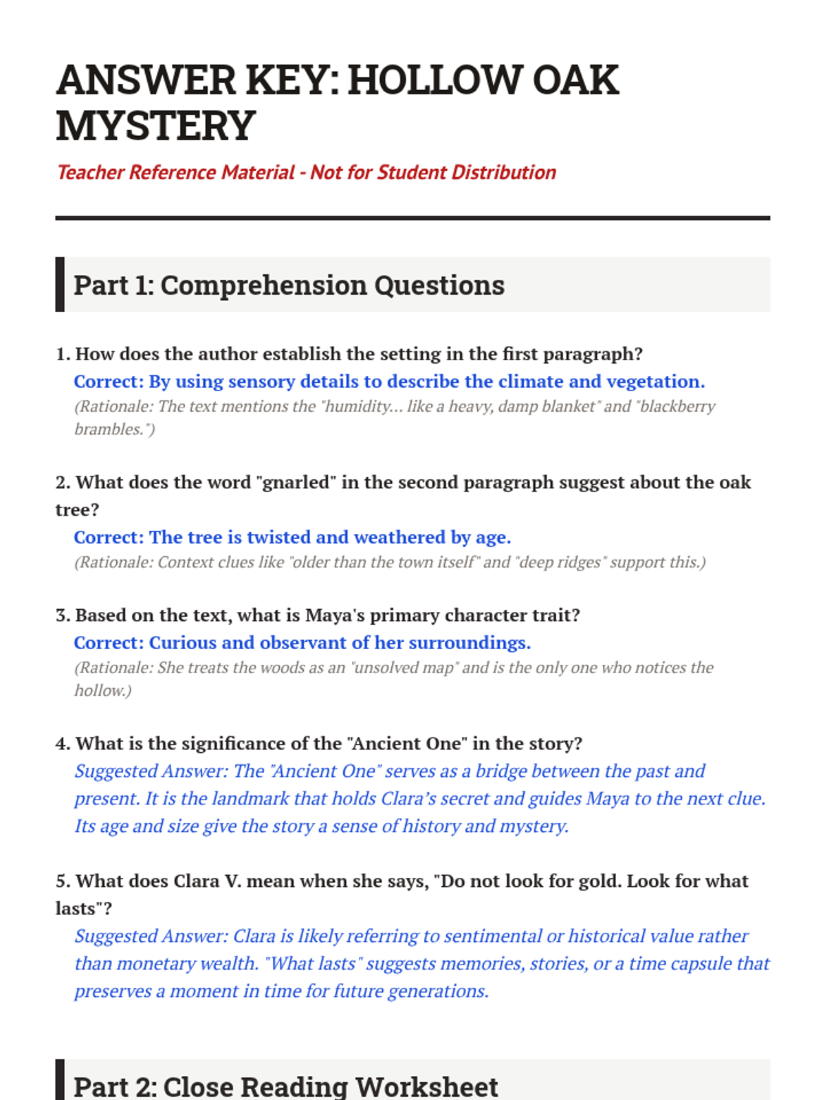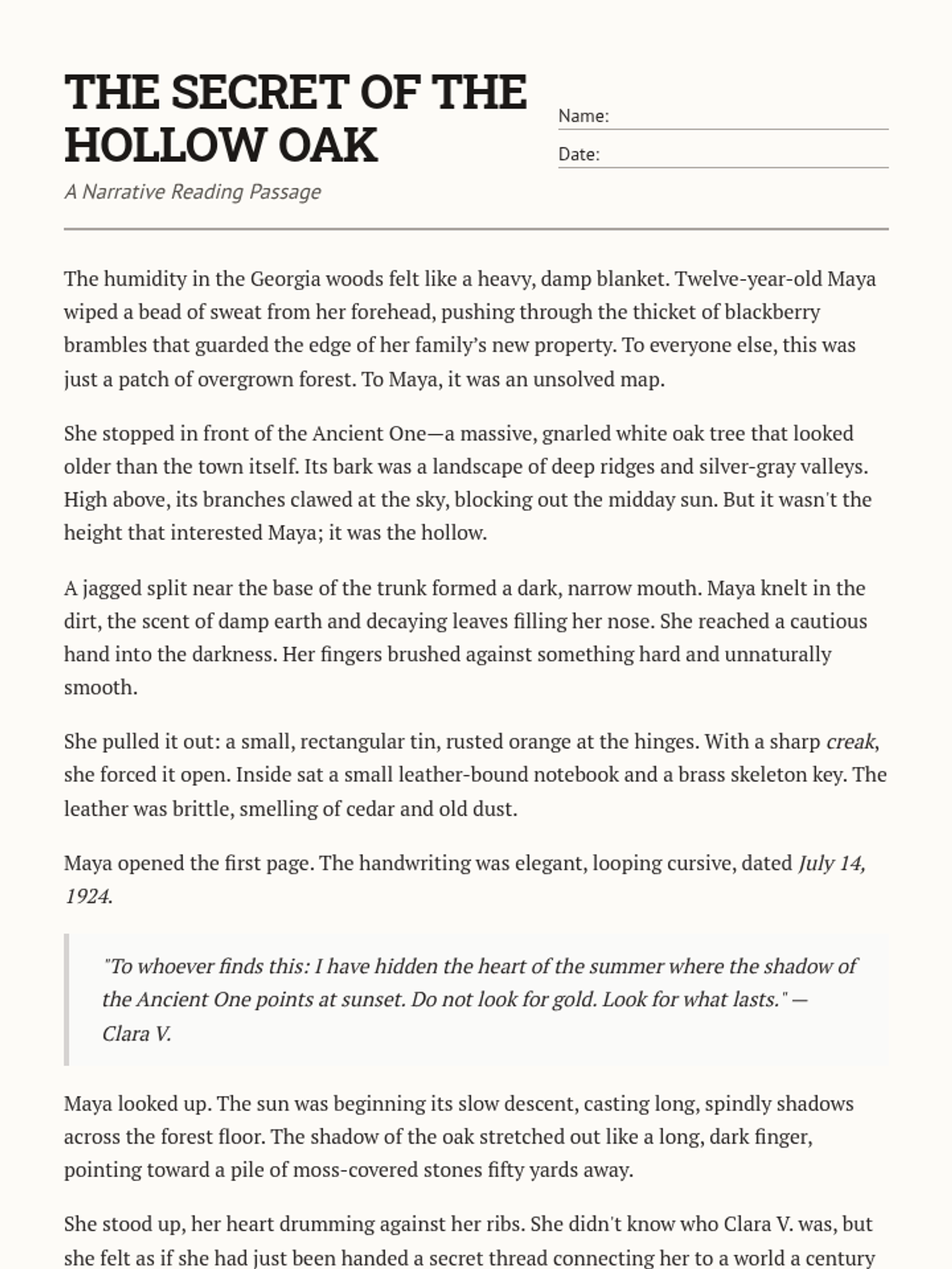 A 7th-grade narrative reading unit focused on 'The Secret of the Hollow Oak,' featuring a passage with comprehension questions and a close reading activity to build analysis skills.