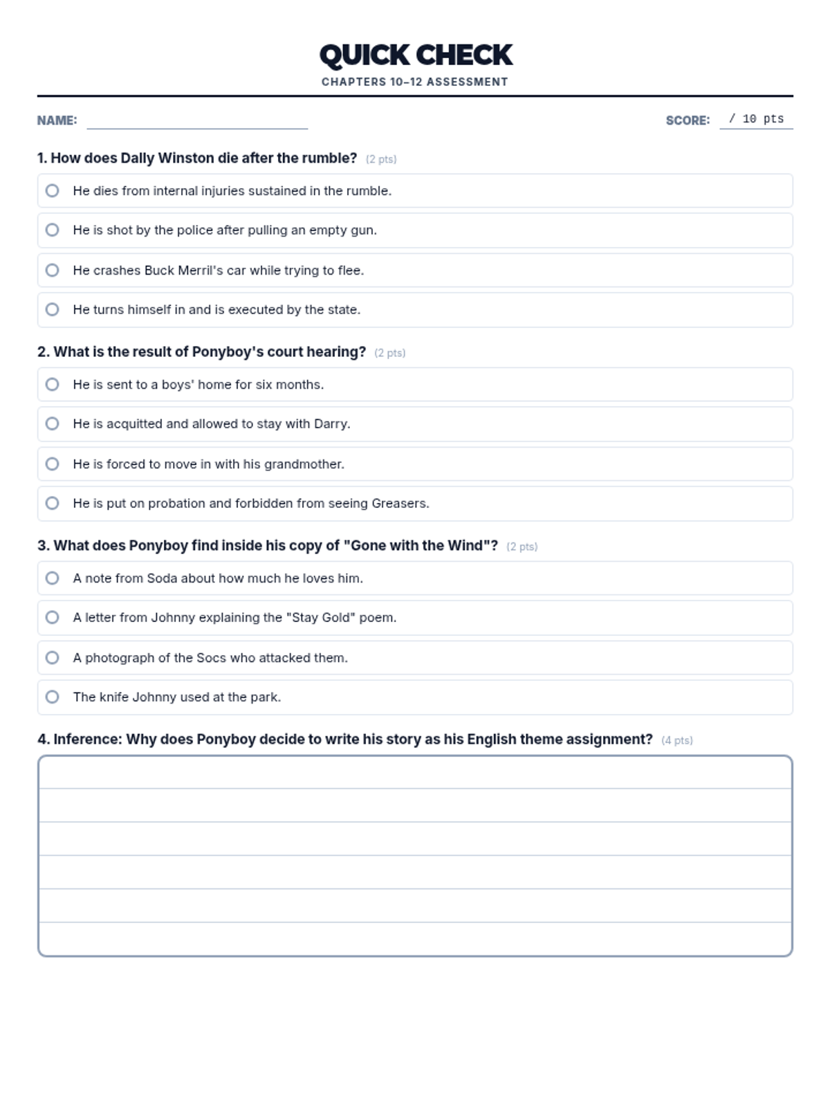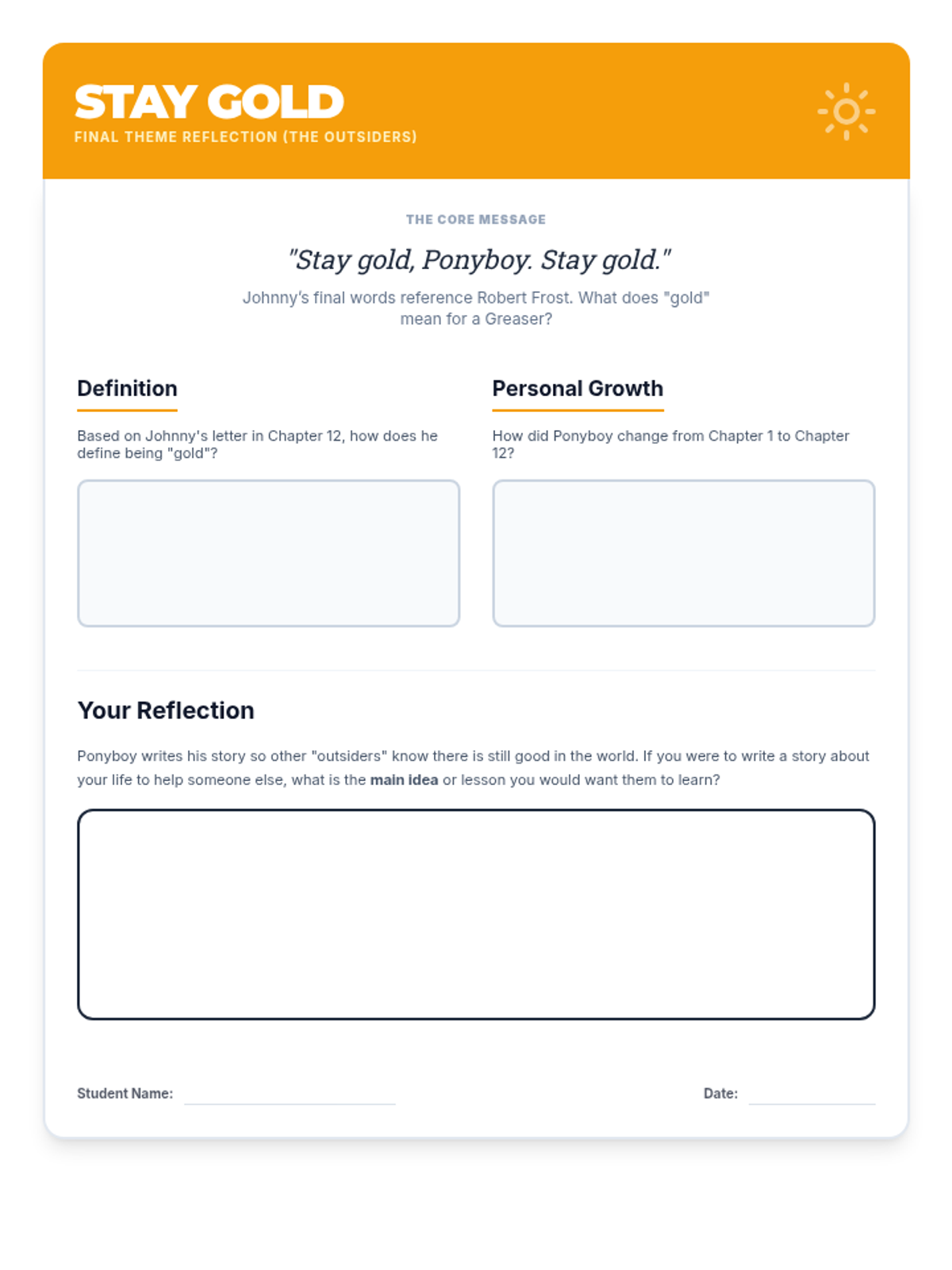 Concludes the novel with Ponyboy's recovery and the realization behind his English theme. Students synthesize themes of identity and 'staying gold' through final reflections.