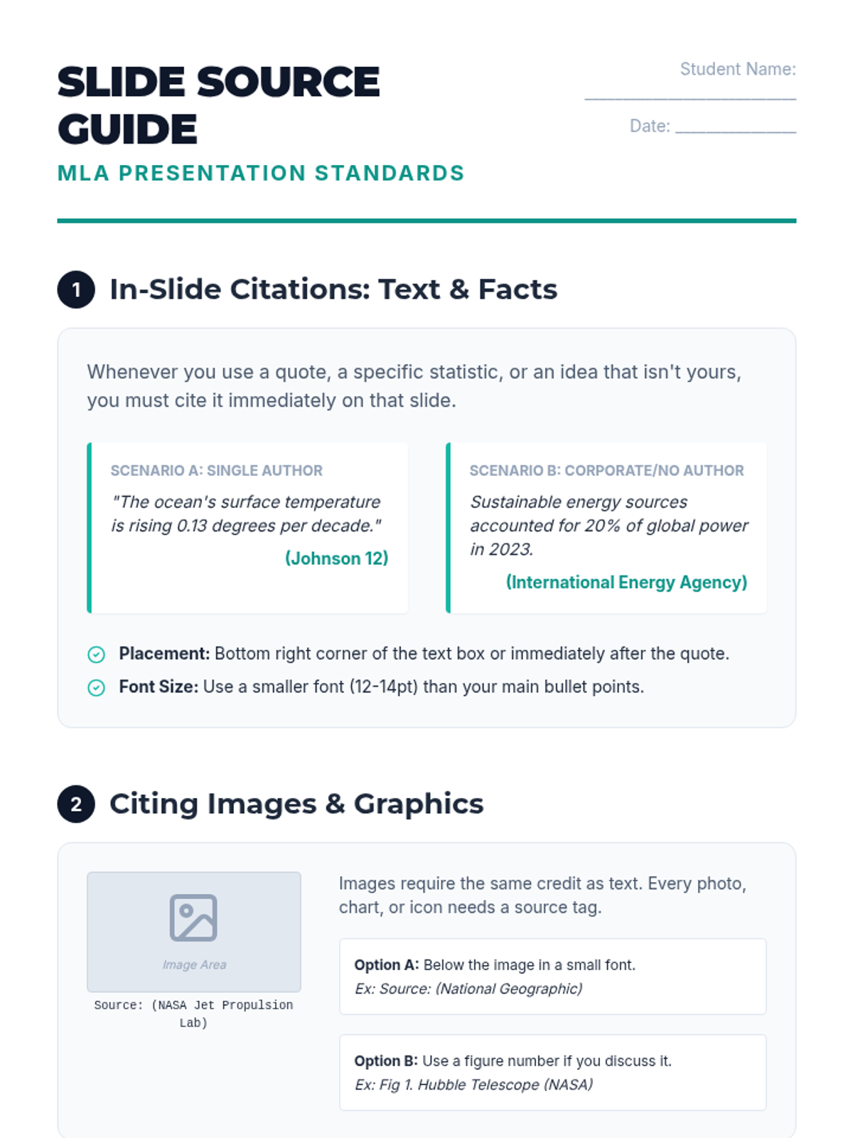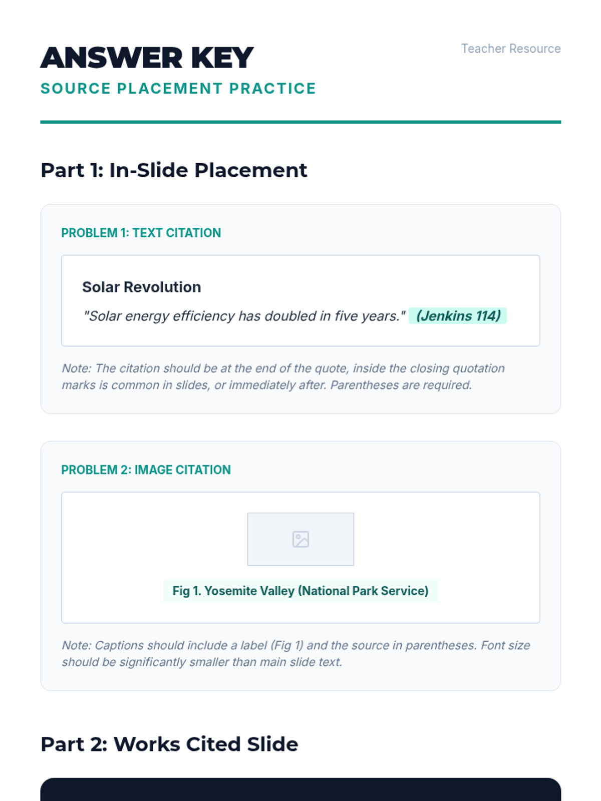 A comprehensive lesson on correctly formatting MLA citations within PowerPoint presentations, covering in-slide citations and Works Cited slides.