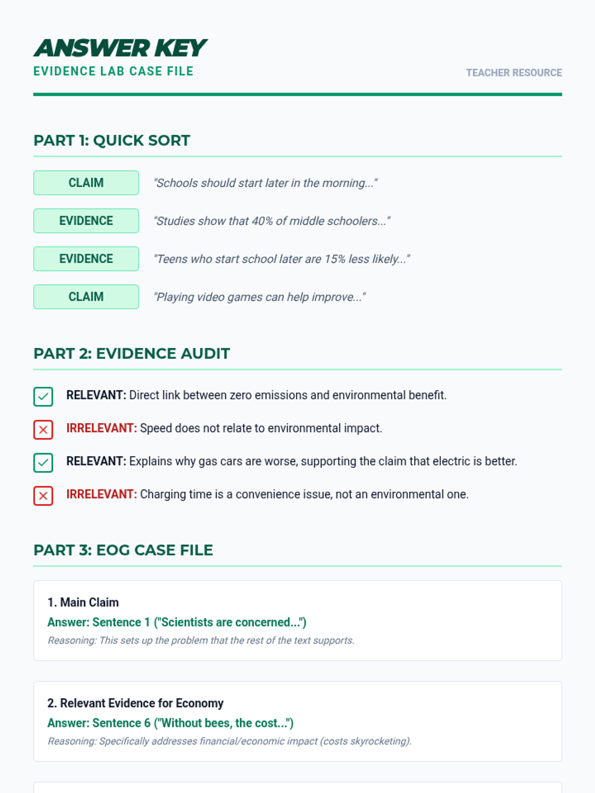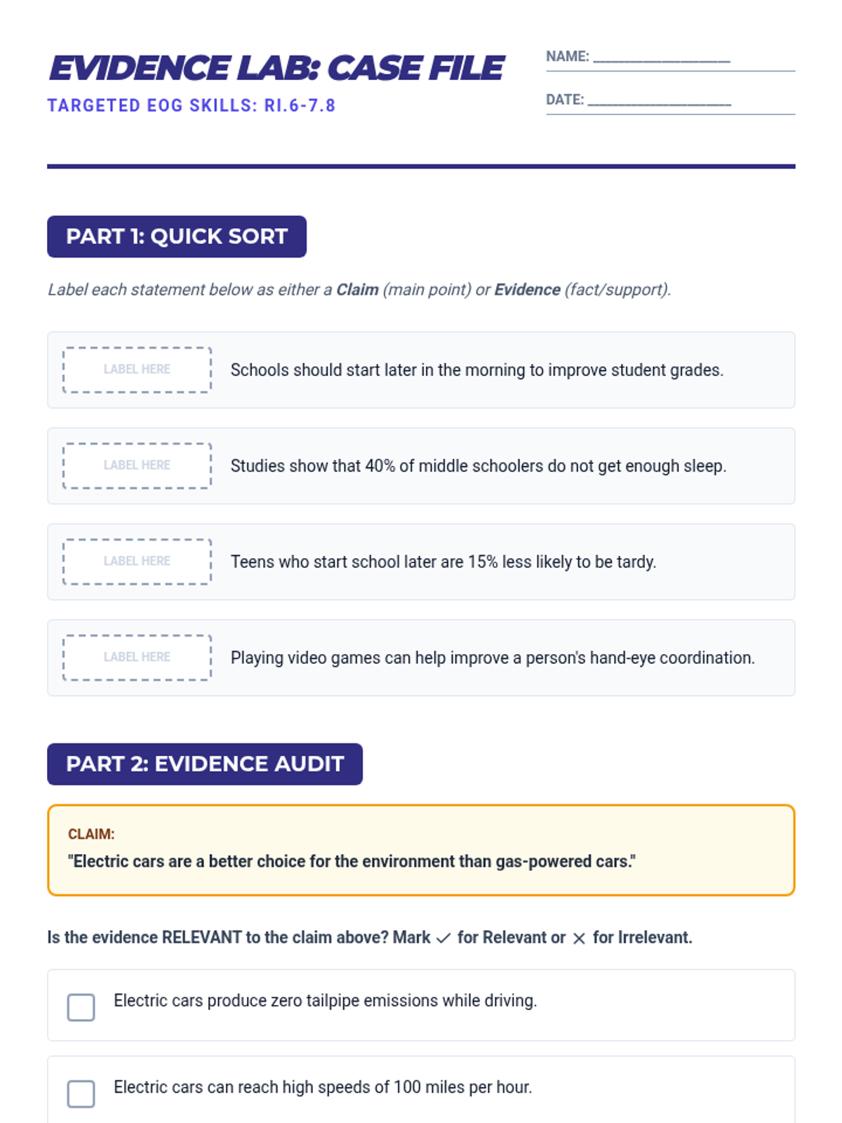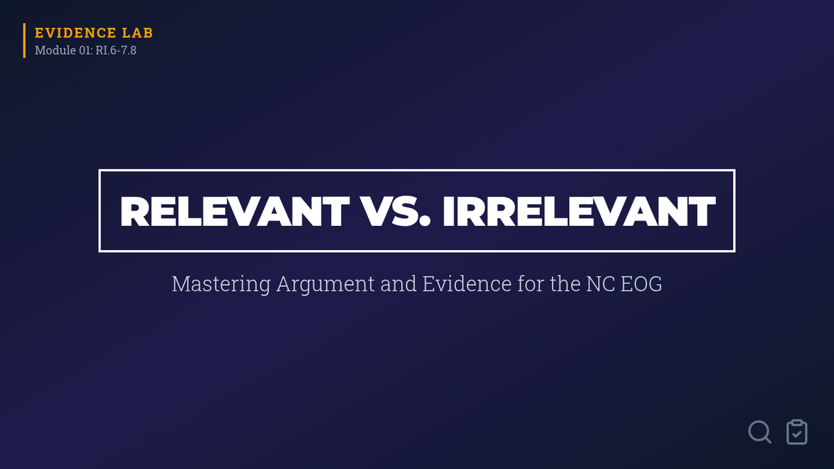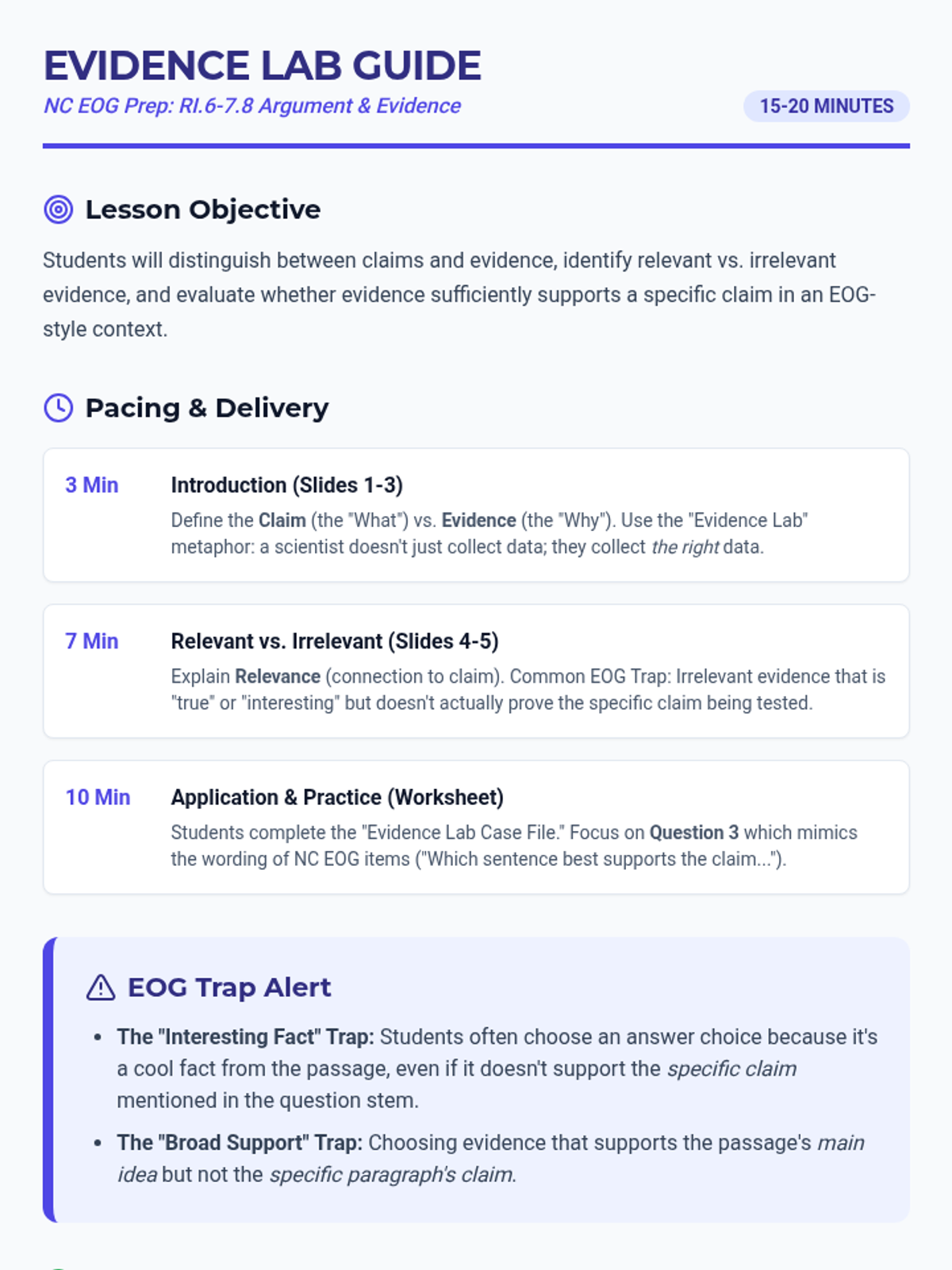A 15-20 minute targeted mini-lesson for NC EOG Prep focusing on tracing and evaluating arguments, specifically distinguishing relevant from irrelevant evidence in grades 6-7.