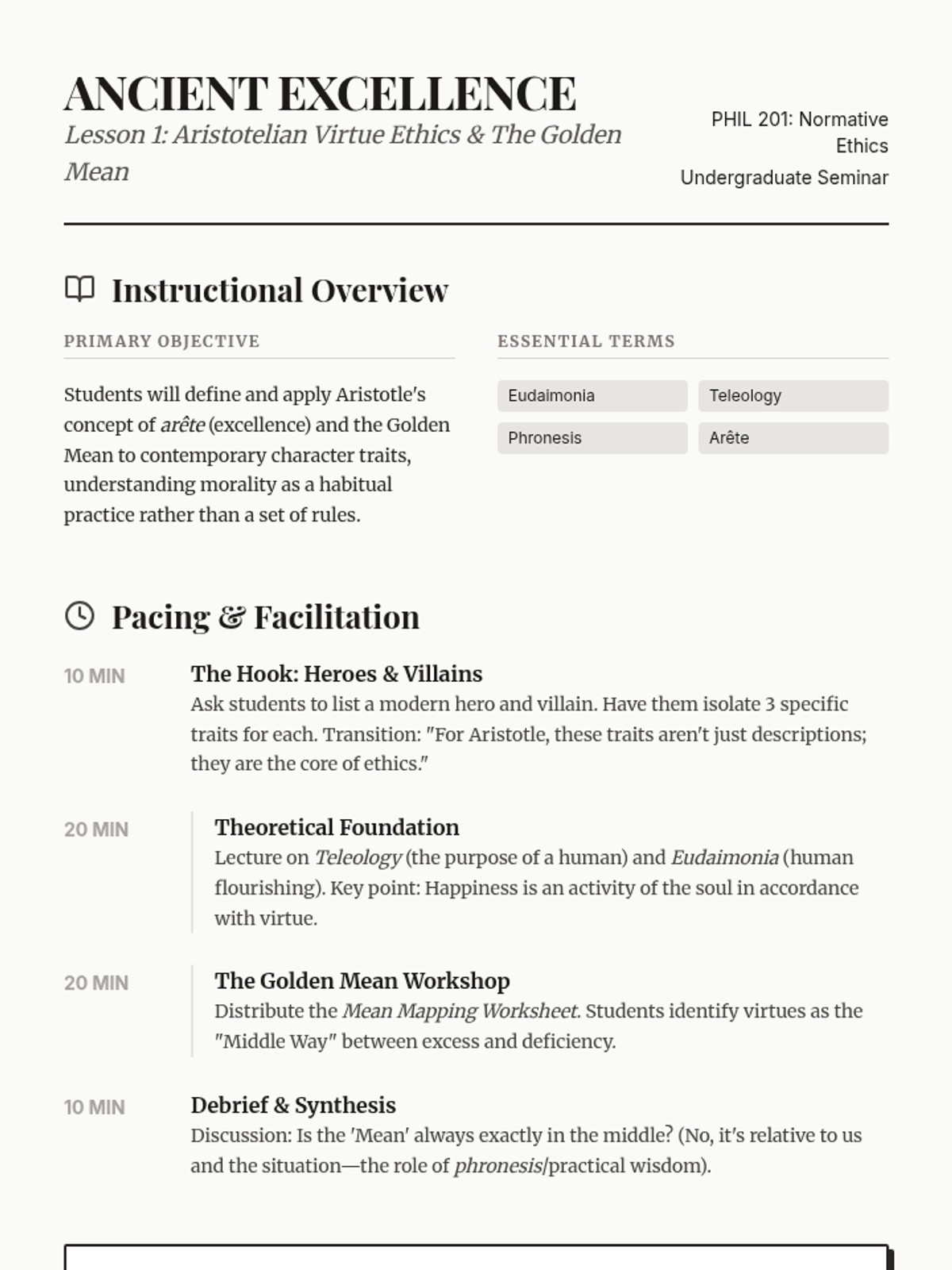 Examine Aristotle's Nicomachean Ethics, focusing on the concepts of eudaimonia, teleology, and the Golden Mean as a framework for character development.