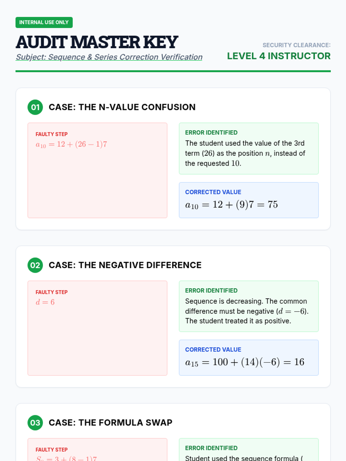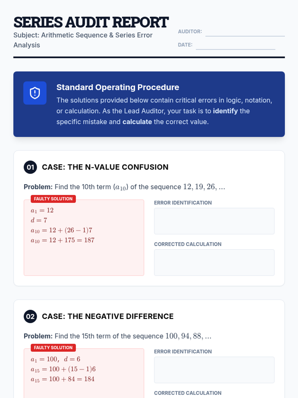 Students practice precision and accuracy in arithmetic sequences and series by identifying and correcting common mathematical errors, inspired by a real-time self-correction in a formula derivation video.
