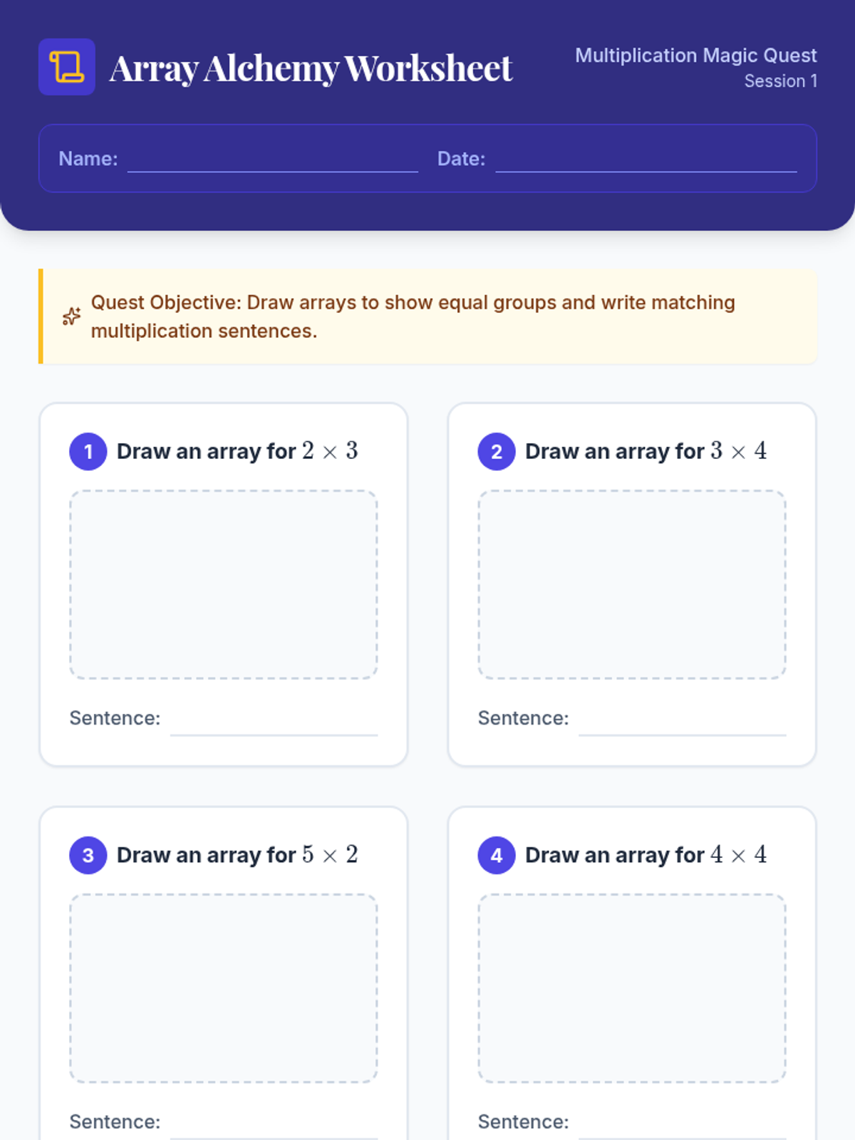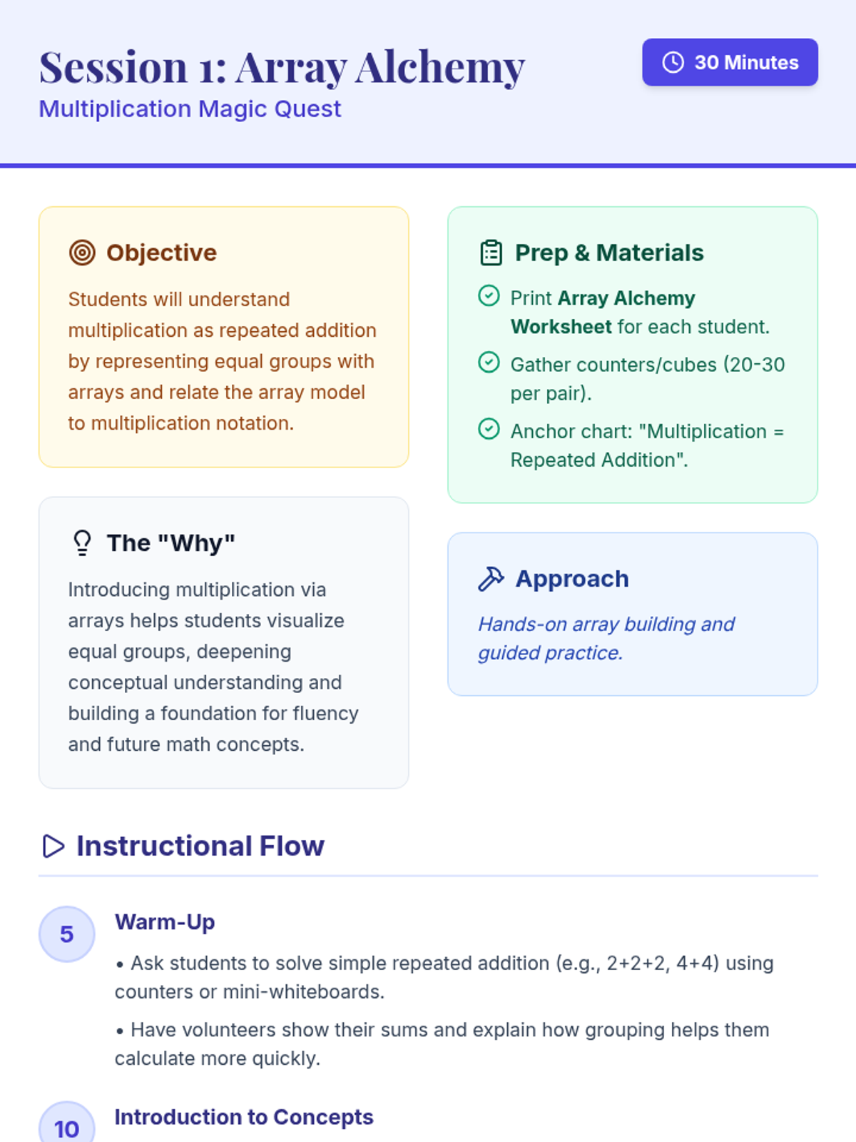 Introduction to multiplication using arrays to visualize equal groups and relate them to multiplication notation.