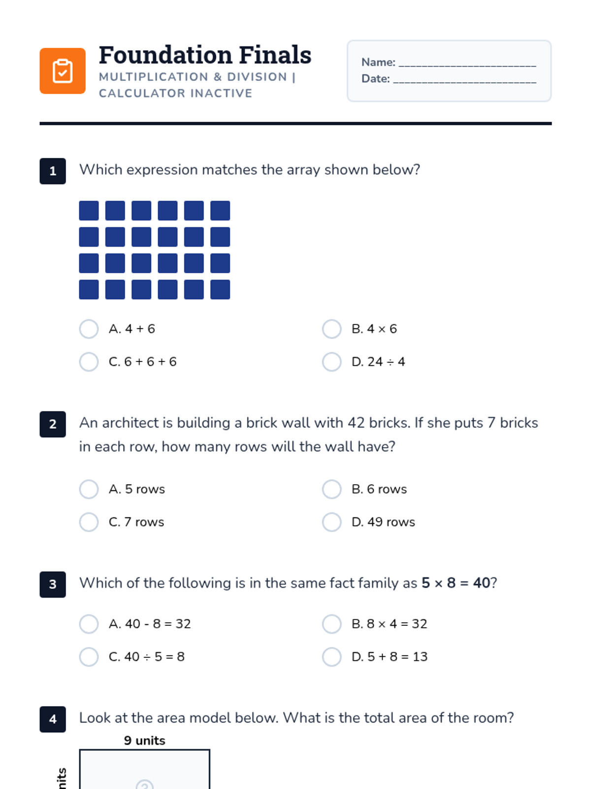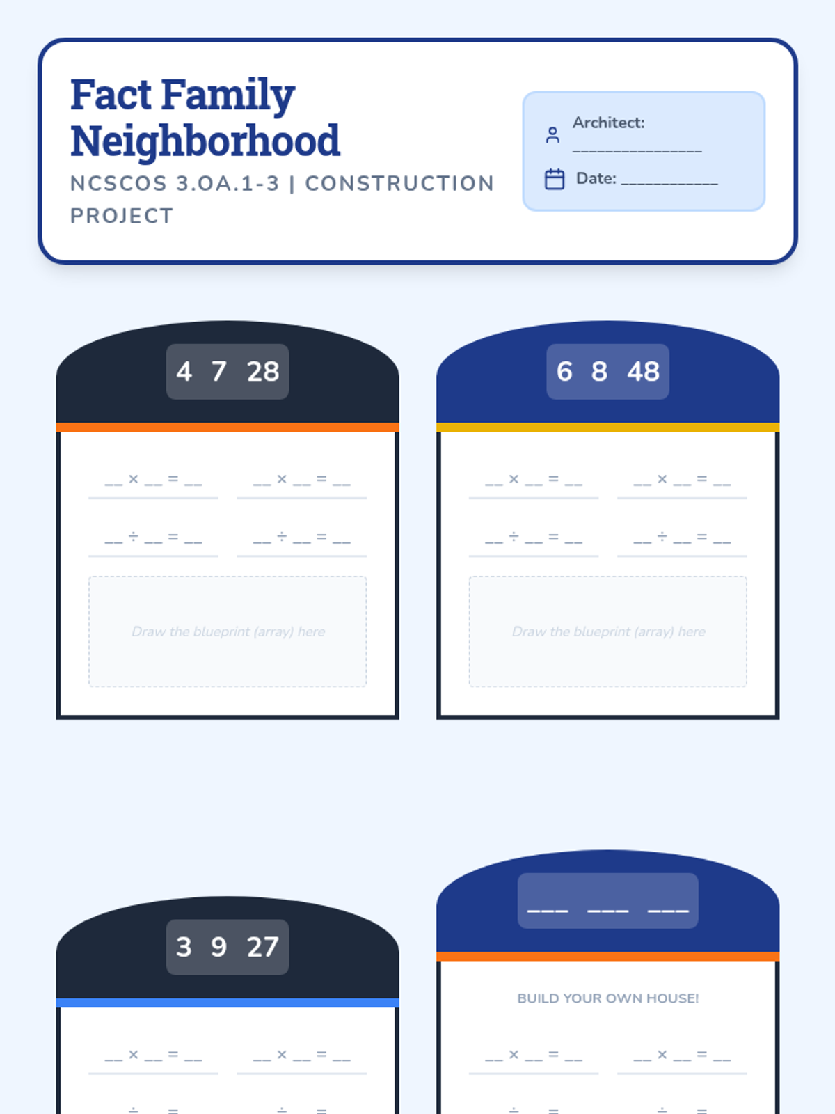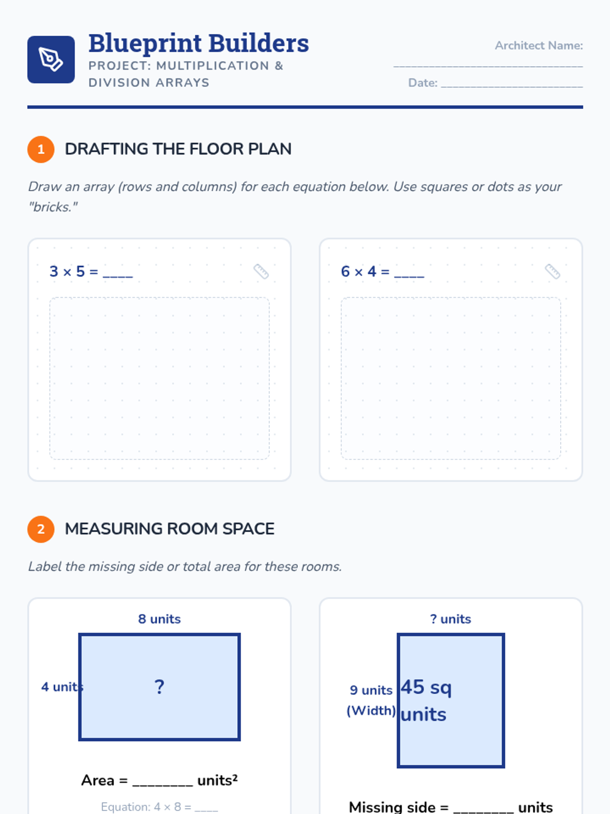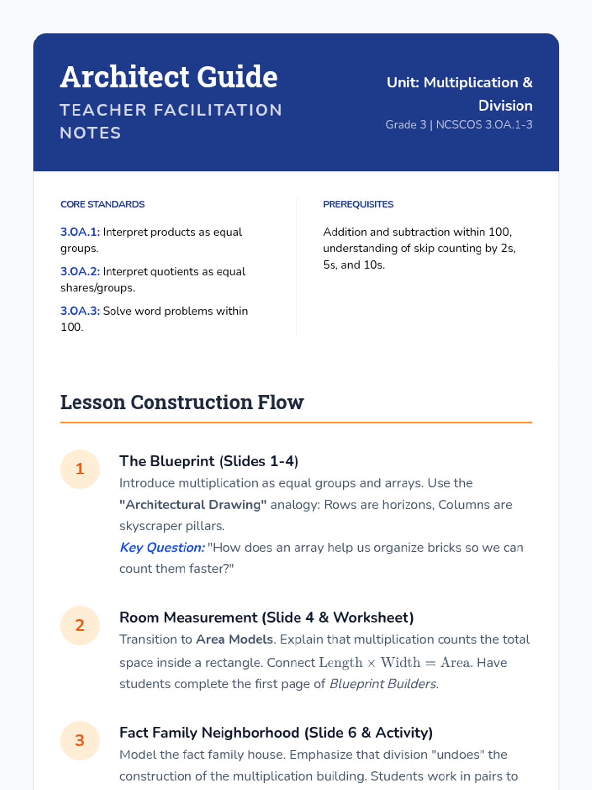 A hands-on exploration of multiplication and division using arrays, area models, and equal groups. Students act as architects to design 'buildings' while mastering fact families and word problems aligned to NC standards.