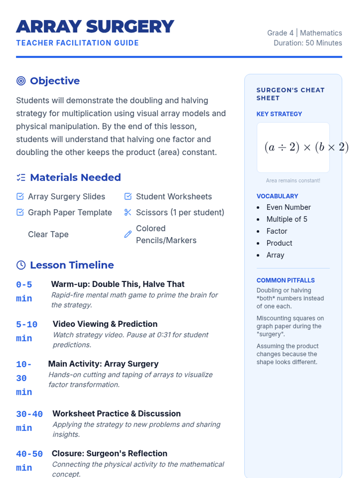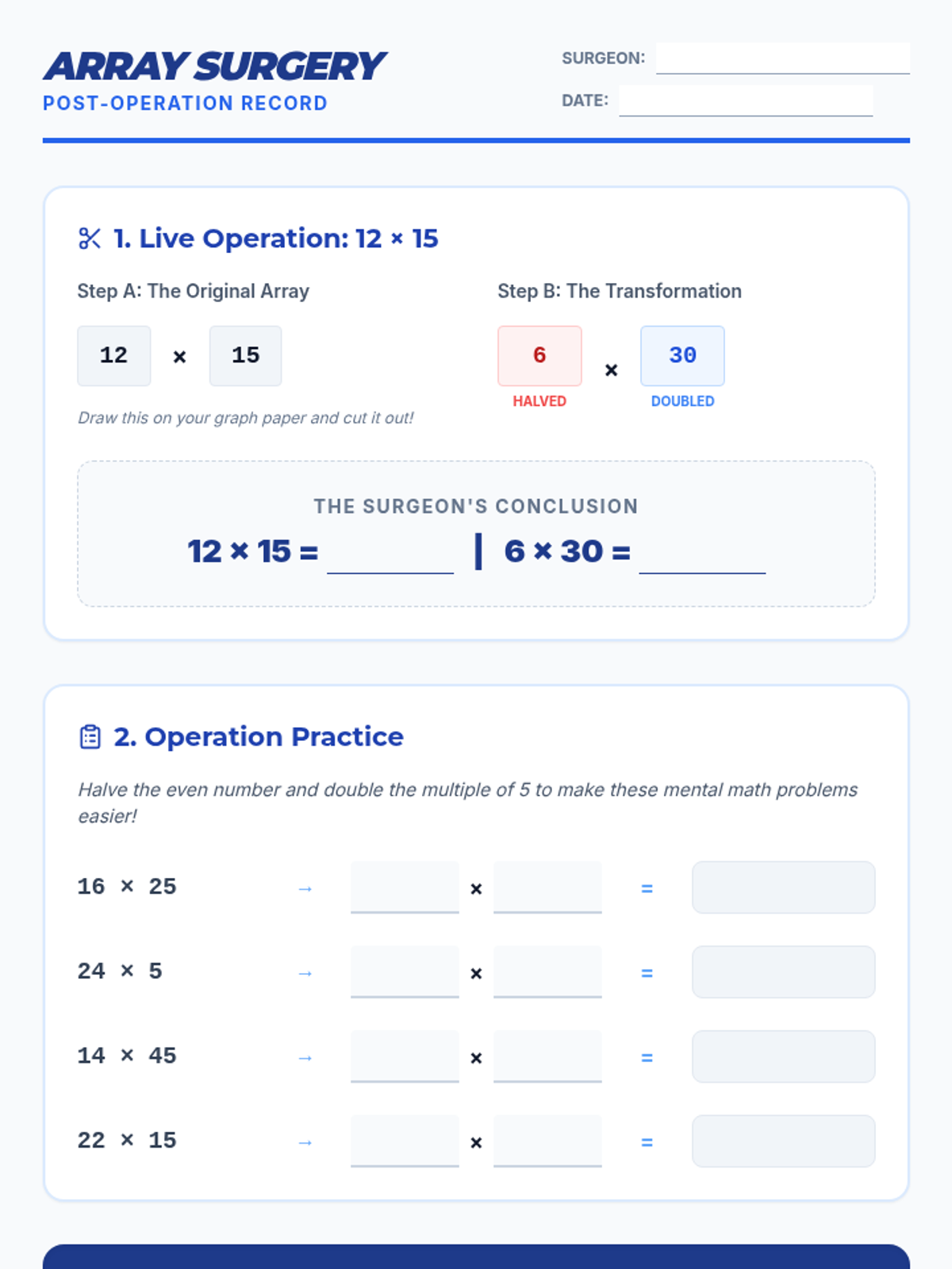 A hands-on multiplication lesson for 4th graders where they use 'Array Surgery' to physically prove how doubling one factor and halving the other maintains the same product.