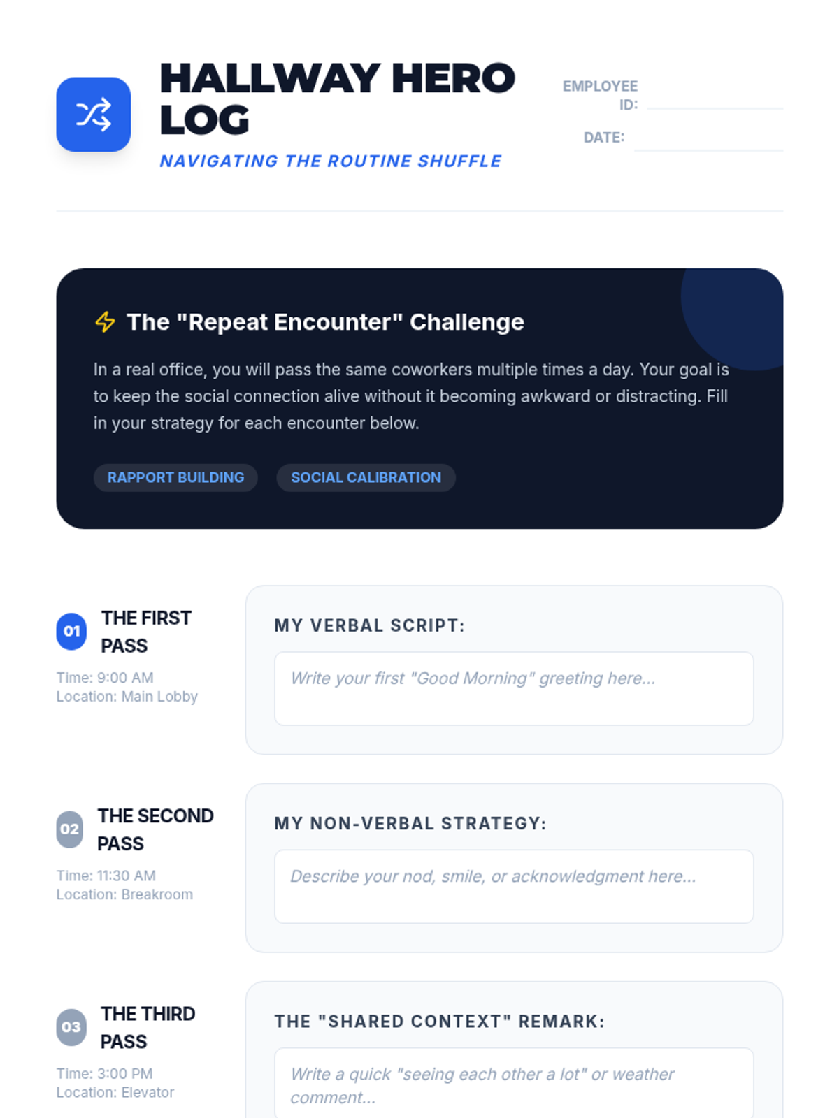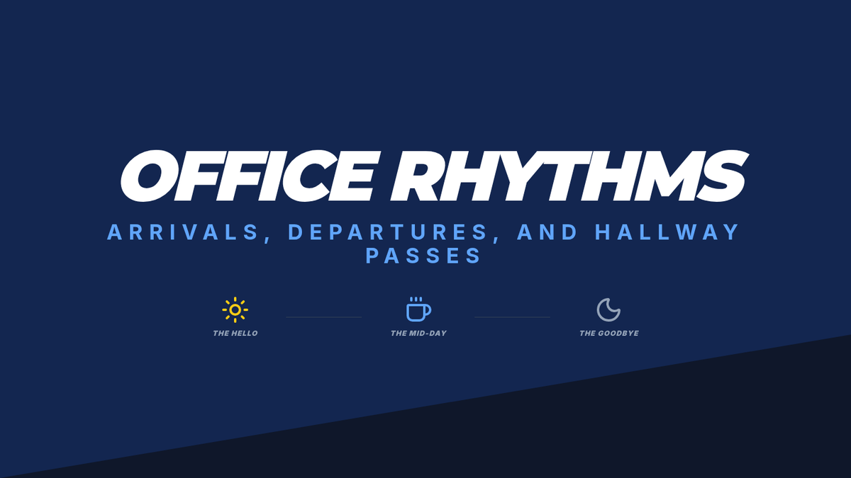 Addresses the routine nature of workplace greetings—saying hello in the breakroom, hallway acknowledgments, and saying goodbye.
