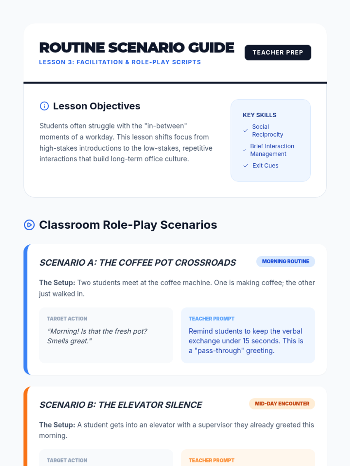 A lesson focused on developing practical problem-solving skills for the workplace, including a reference guide for decision-making and scenario-based practice.