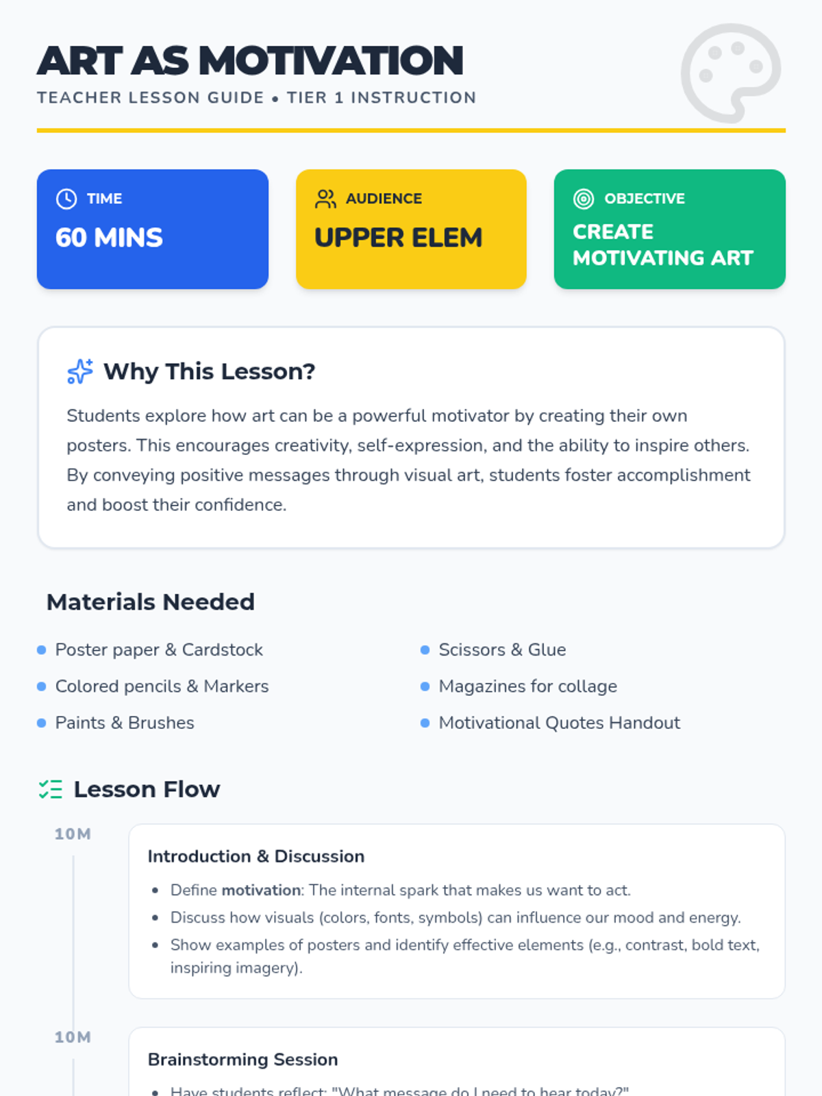 A creative lesson where students explore the intersection of art and motivation, culminating in the creation of original motivational posters using various techniques.