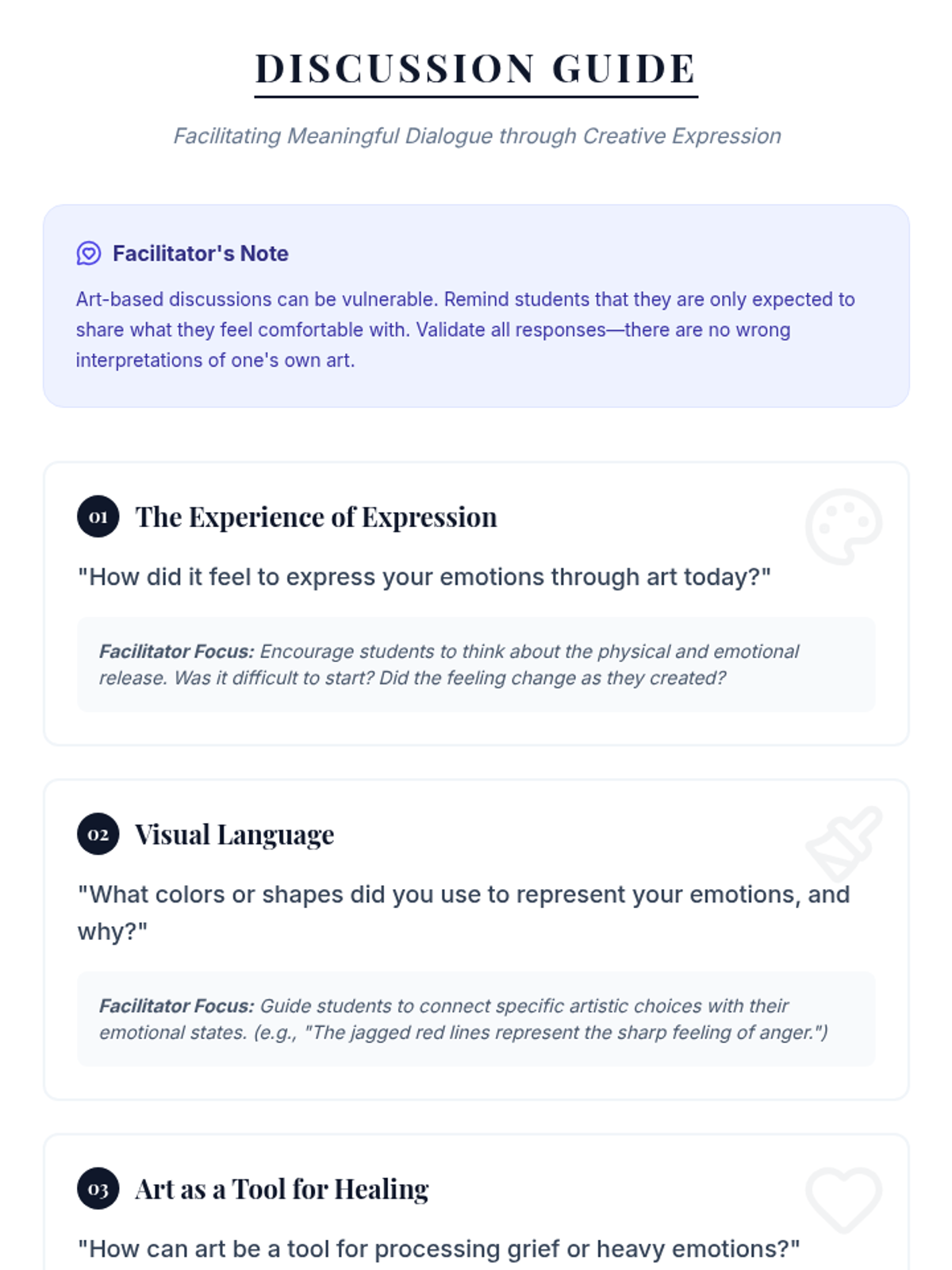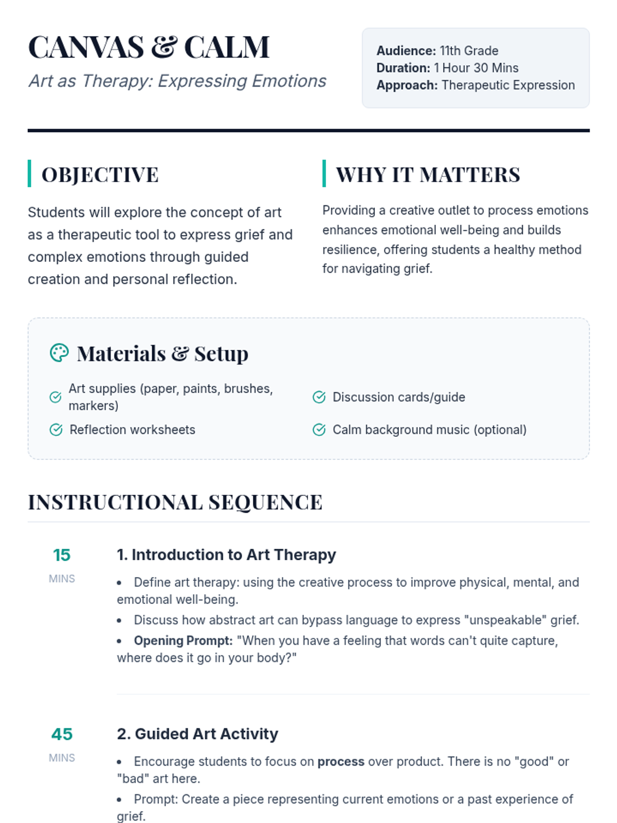 In this lesson, 11th-grade students explore art as a therapeutic tool for expressing grief and emotions. Through guided creative sessions and reflection, they develop healthy emotional processing skills and resilience.