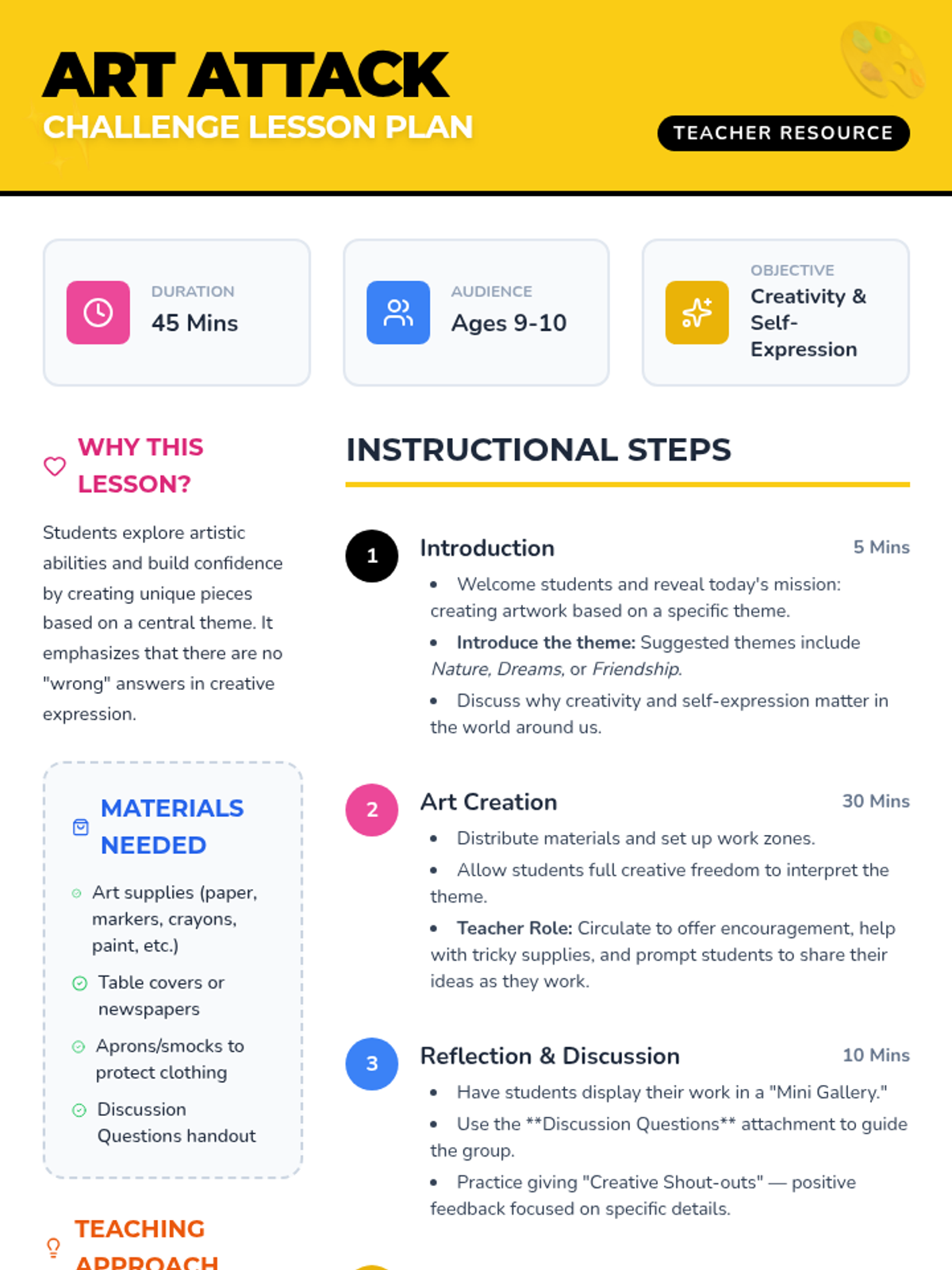 A high-energy art lesson where students explore creativity and self-expression by creating unique pieces of art based on a central theme.