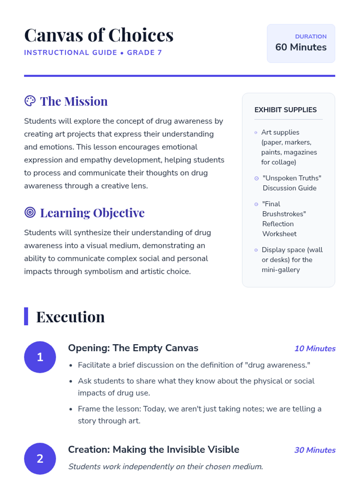 A 7th-grade lesson using creative art to explore the emotional and social impacts of drug use and the power of making informed choices.