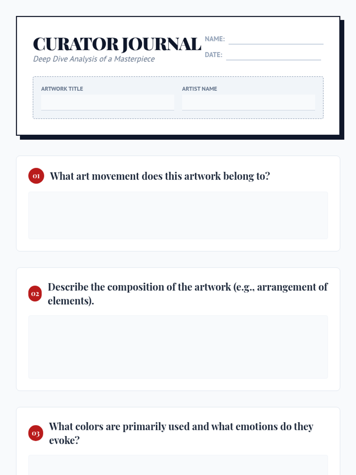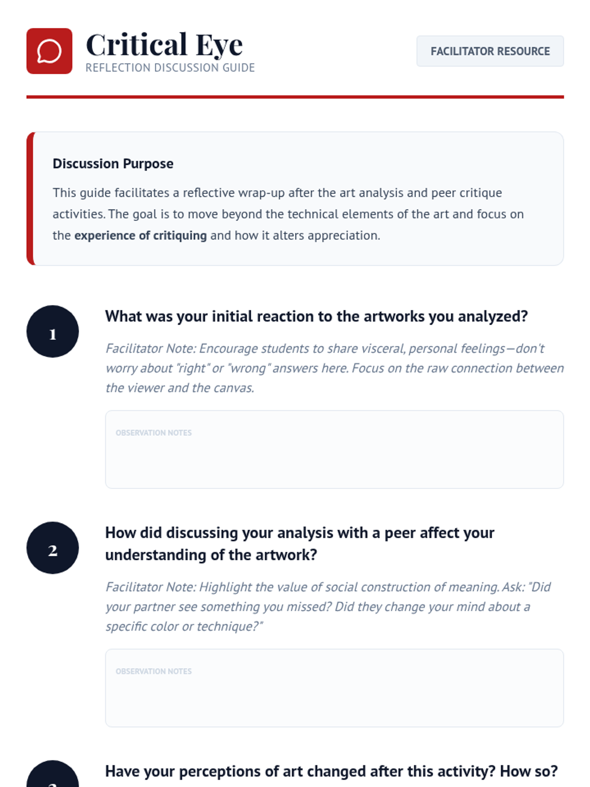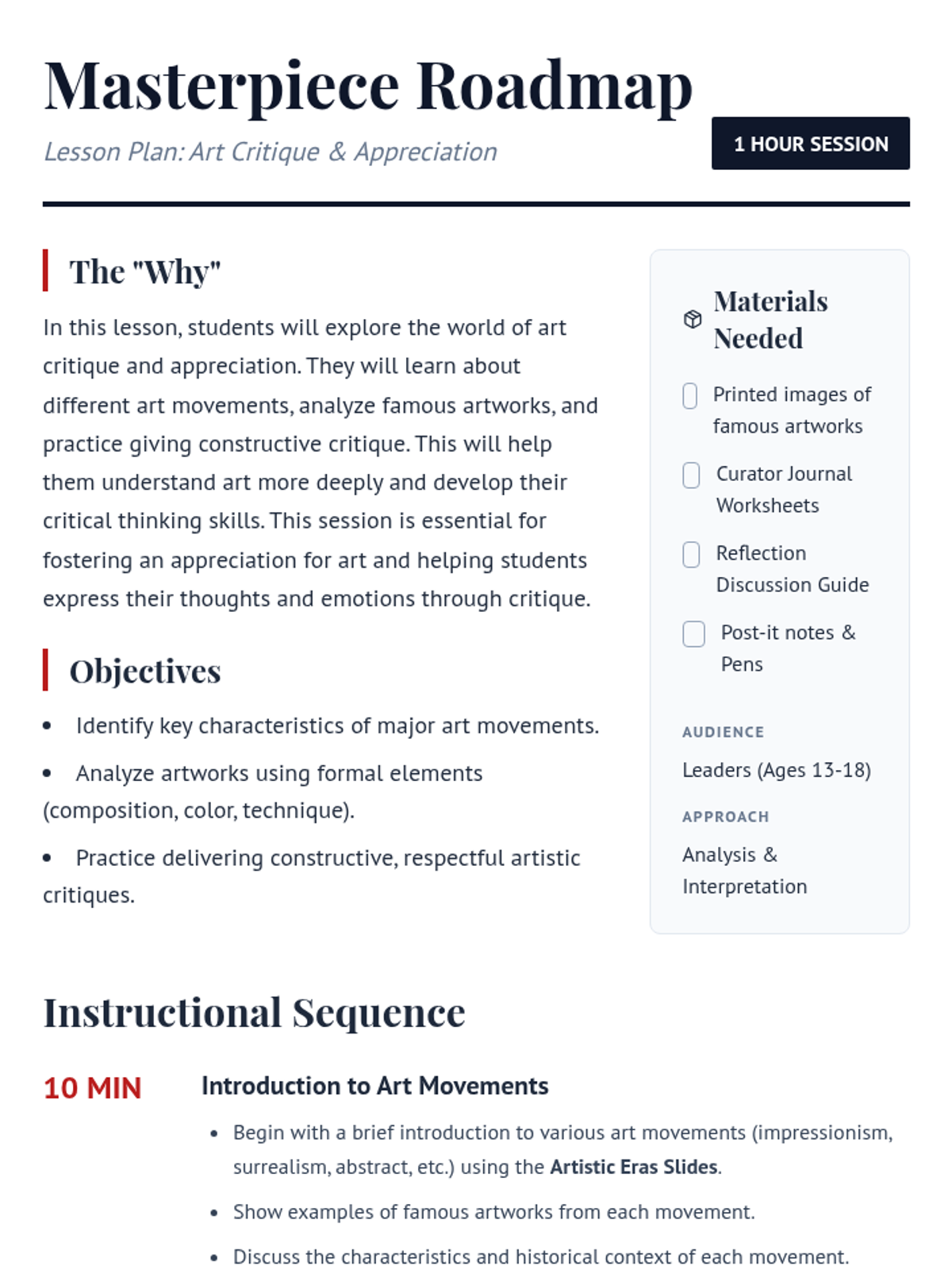 A comprehensive lesson where students explore art movements, analyze famous works, and develop critical thinking skills through constructive critique.