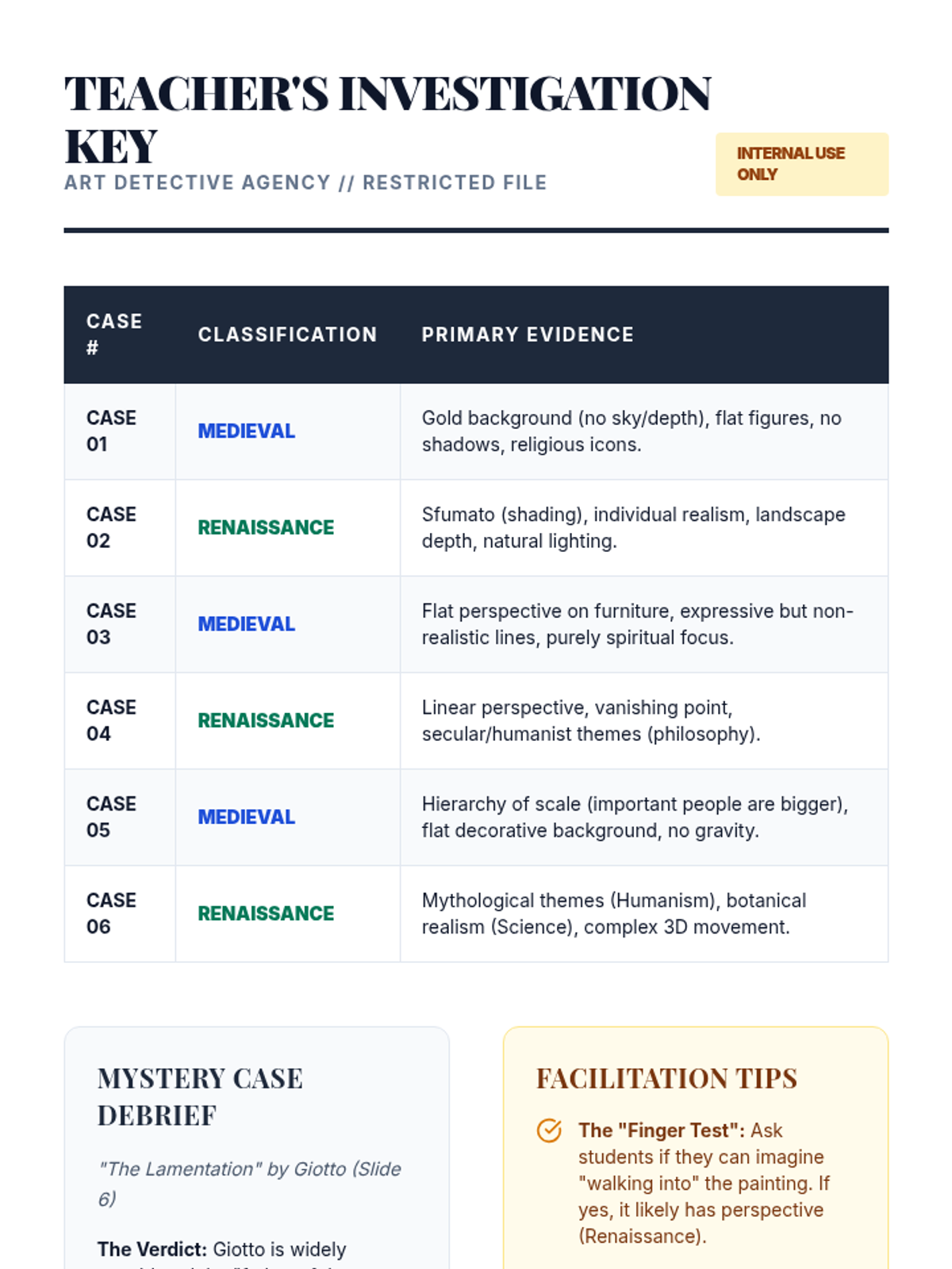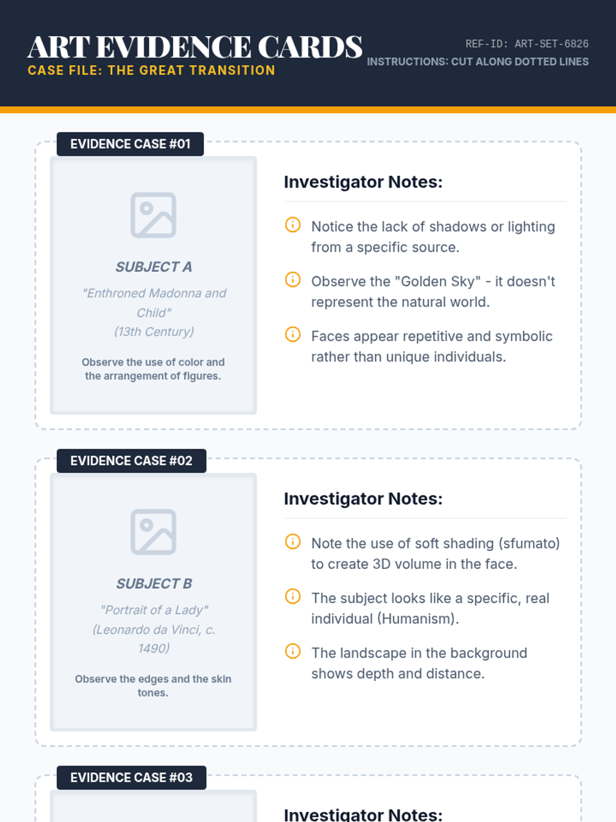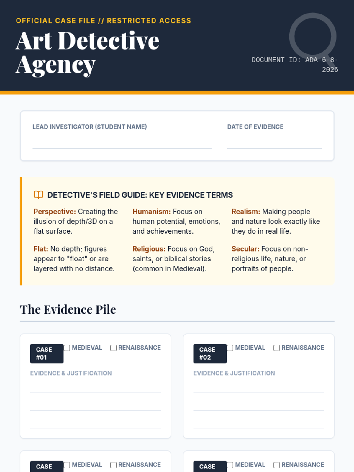 Students become art detectives to investigate the shift from Medieval to Renaissance styles, focusing on perspective, realism, and humanism through a video-based inquiry and image sorting activity.