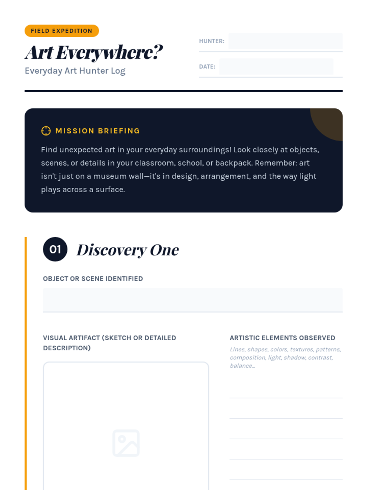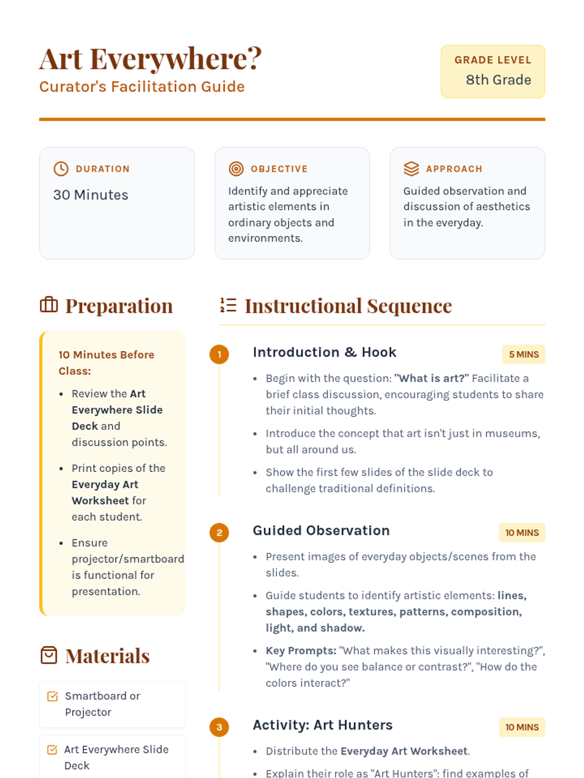 This lesson challenges 8th-grade students to discover the art hidden in their everyday surroundings, fostering keen observation skills and appreciation for aesthetics. It's a single 30-minute session.