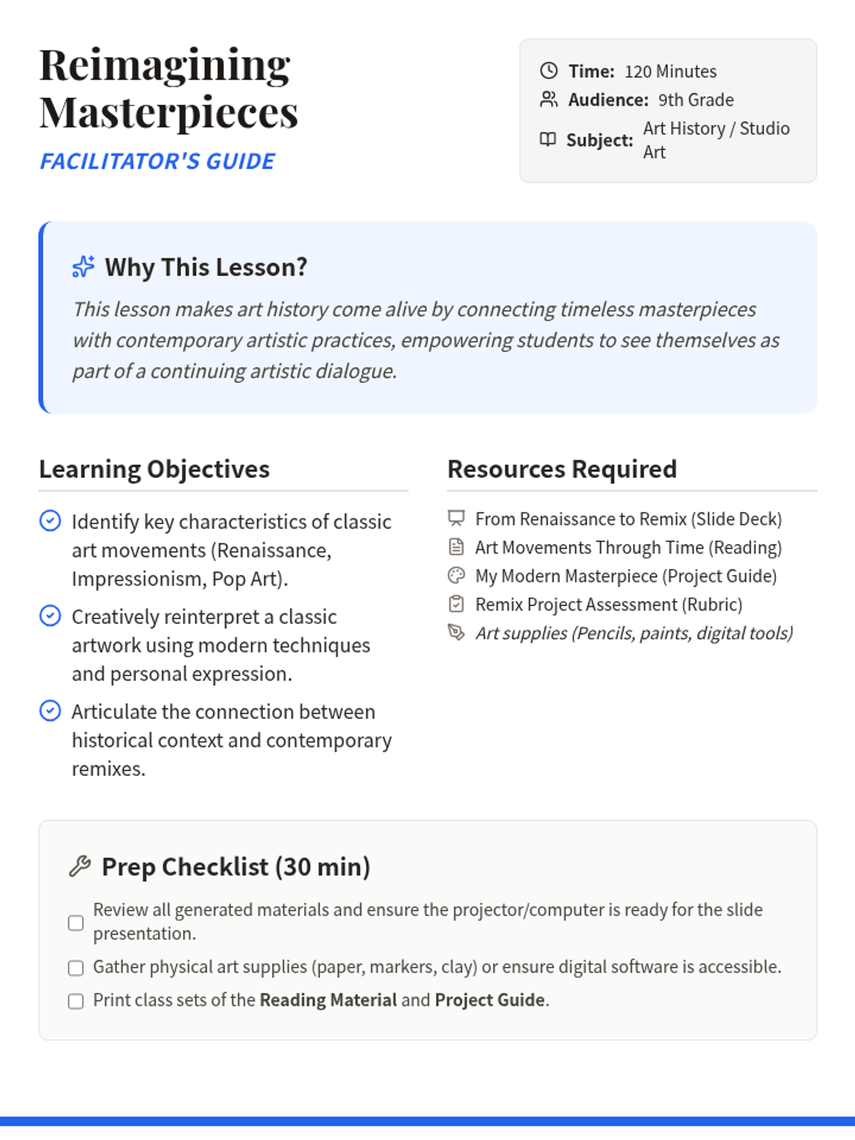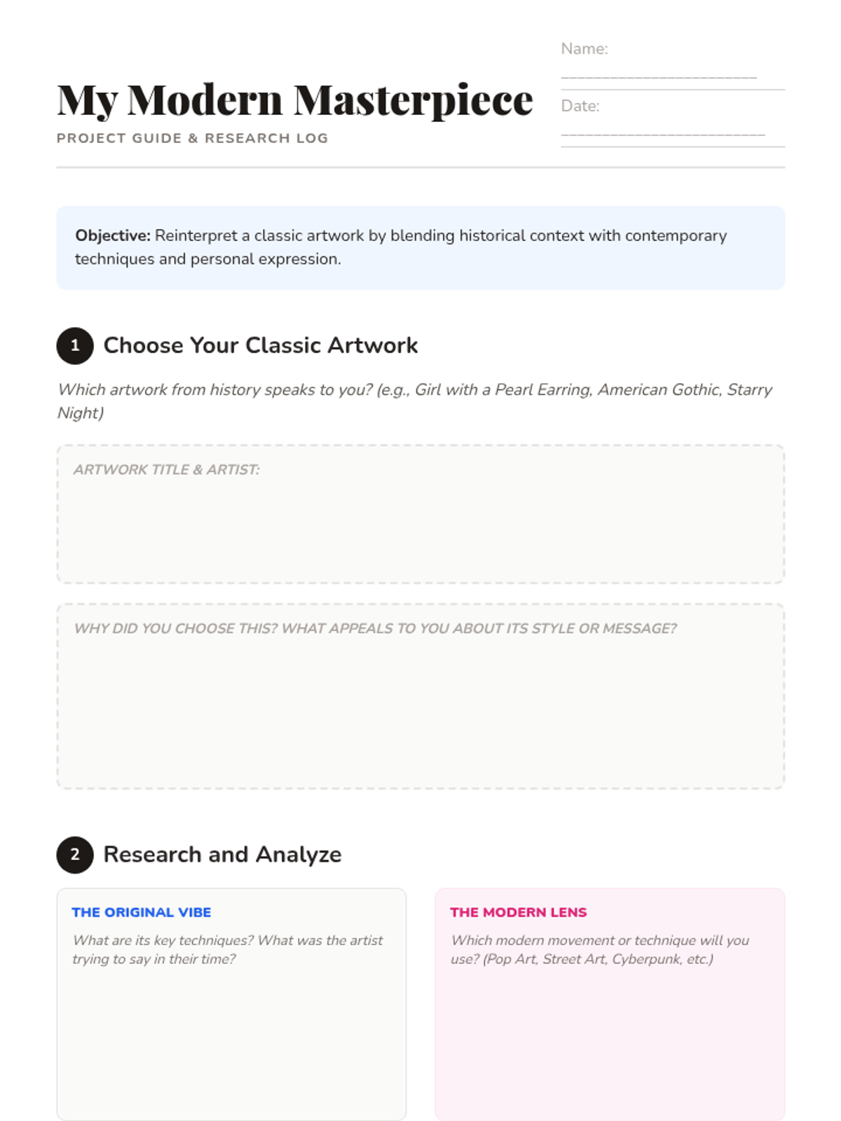 Students will learn to reinterpret classic artworks through a modern, creative lens, blending historical context with contemporary artistic techniques. This lesson makes art history relevant and inspires innovative artistic responses for 9th-grade students.