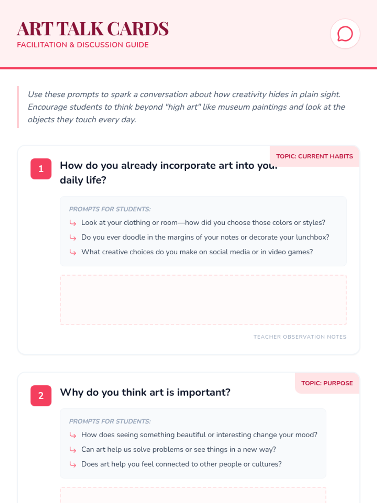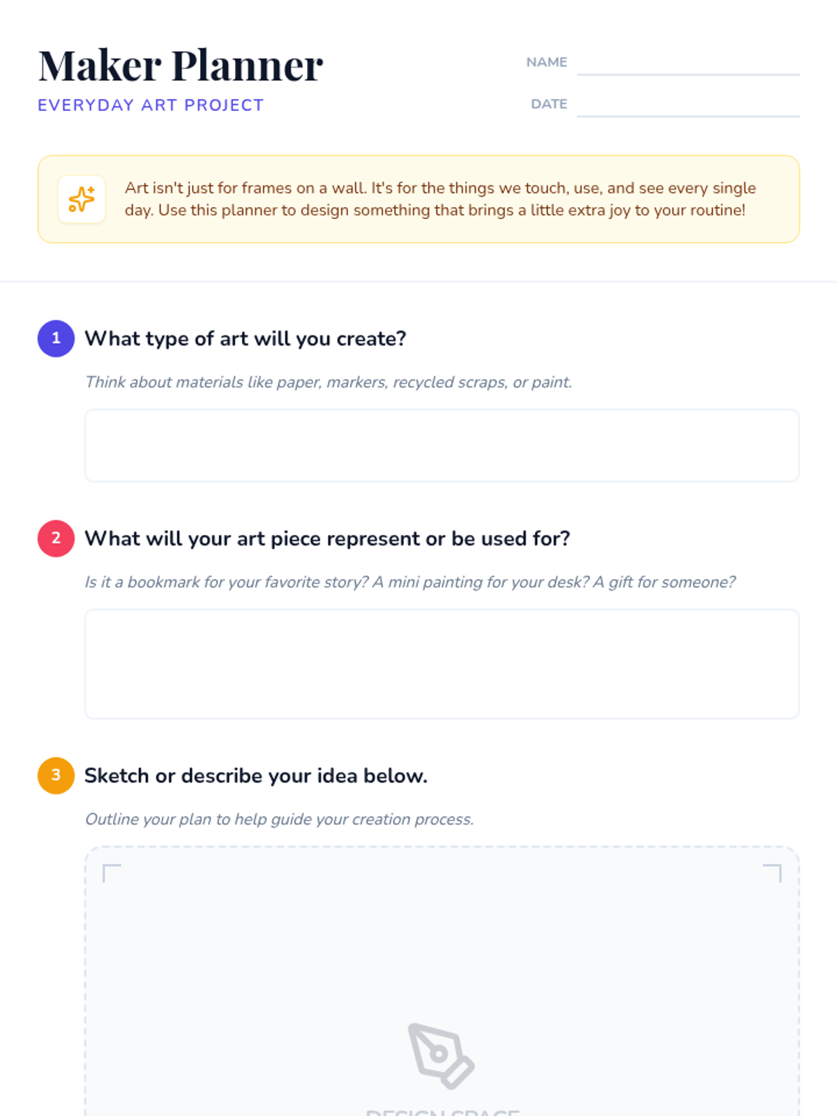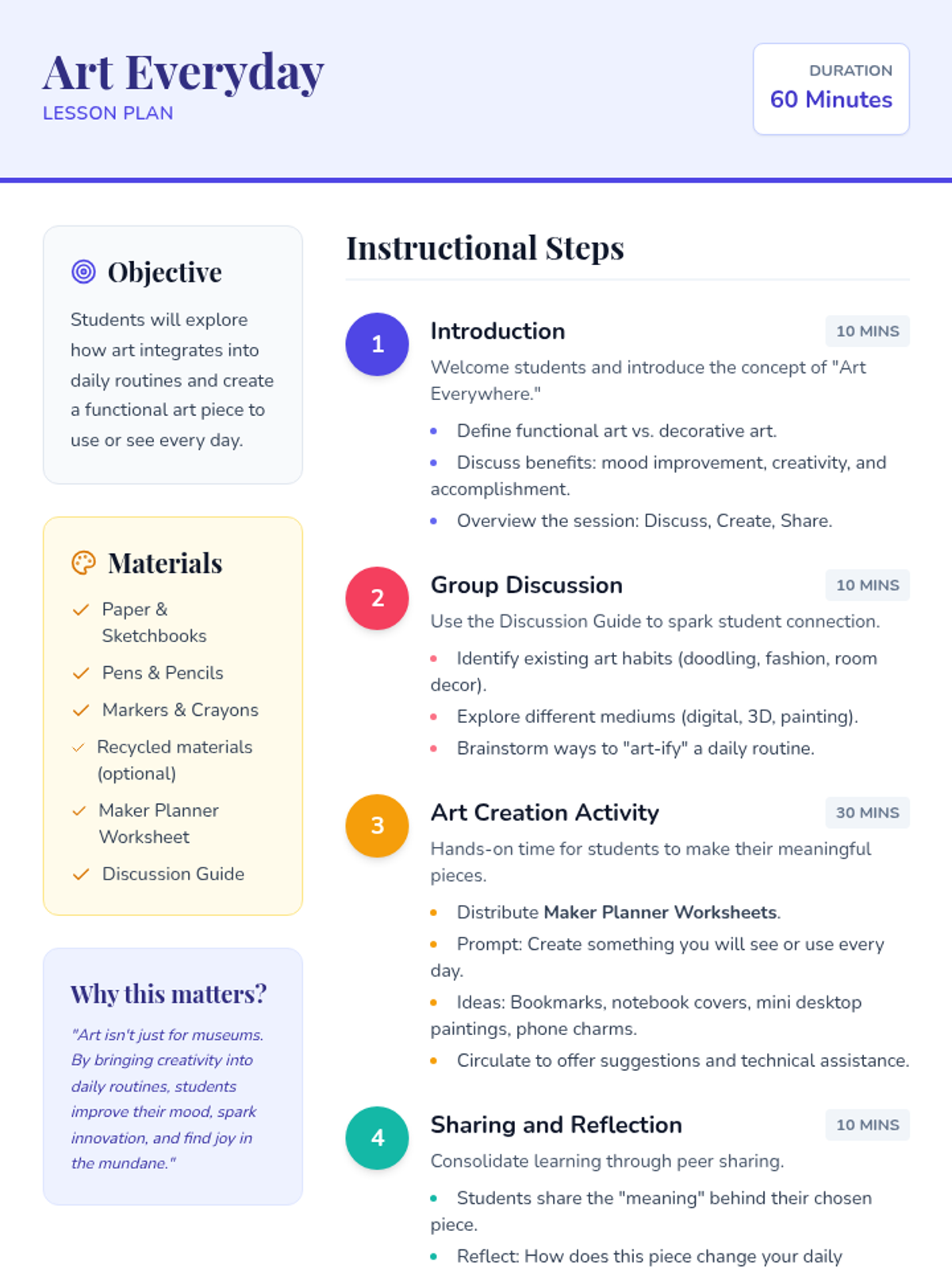 Students explore how art surrounds them and create a meaningful, functional art piece for their daily lives.