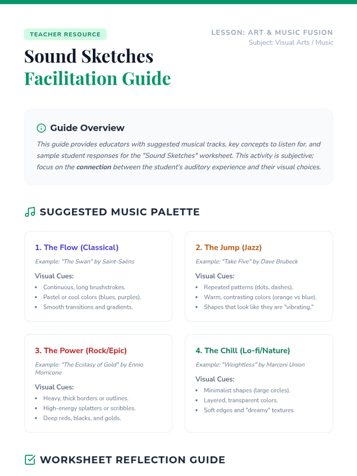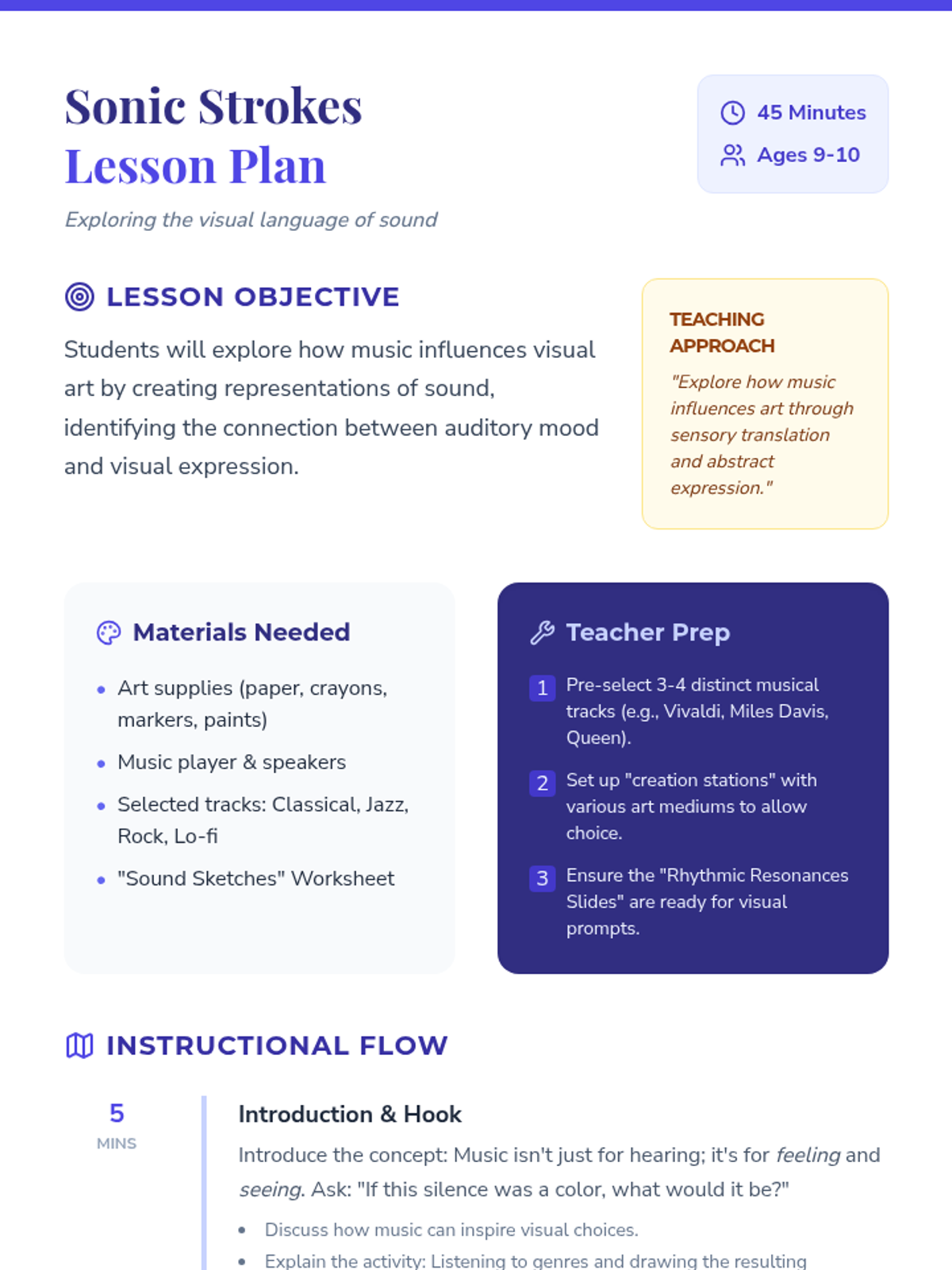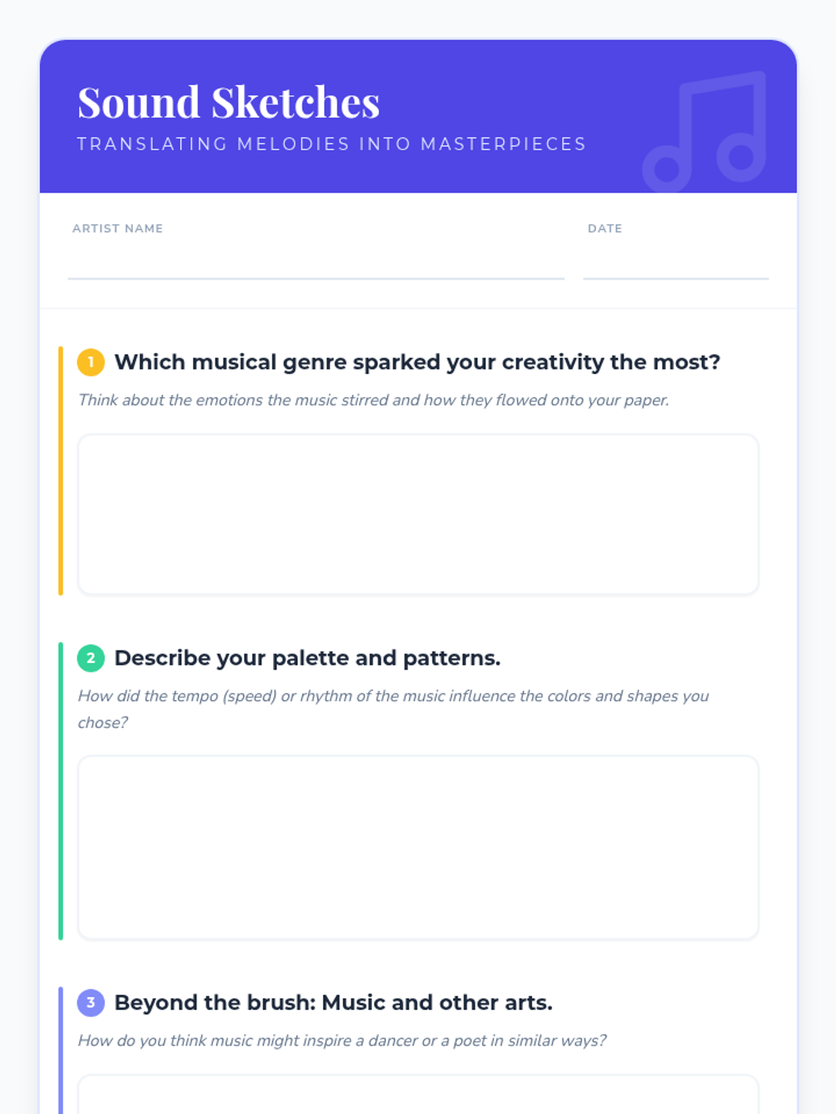 Students explore the intersection of auditory and visual arts by creating original artwork inspired by various musical genres, reflecting on how rhythm, tempo, and mood translate into color and form.
