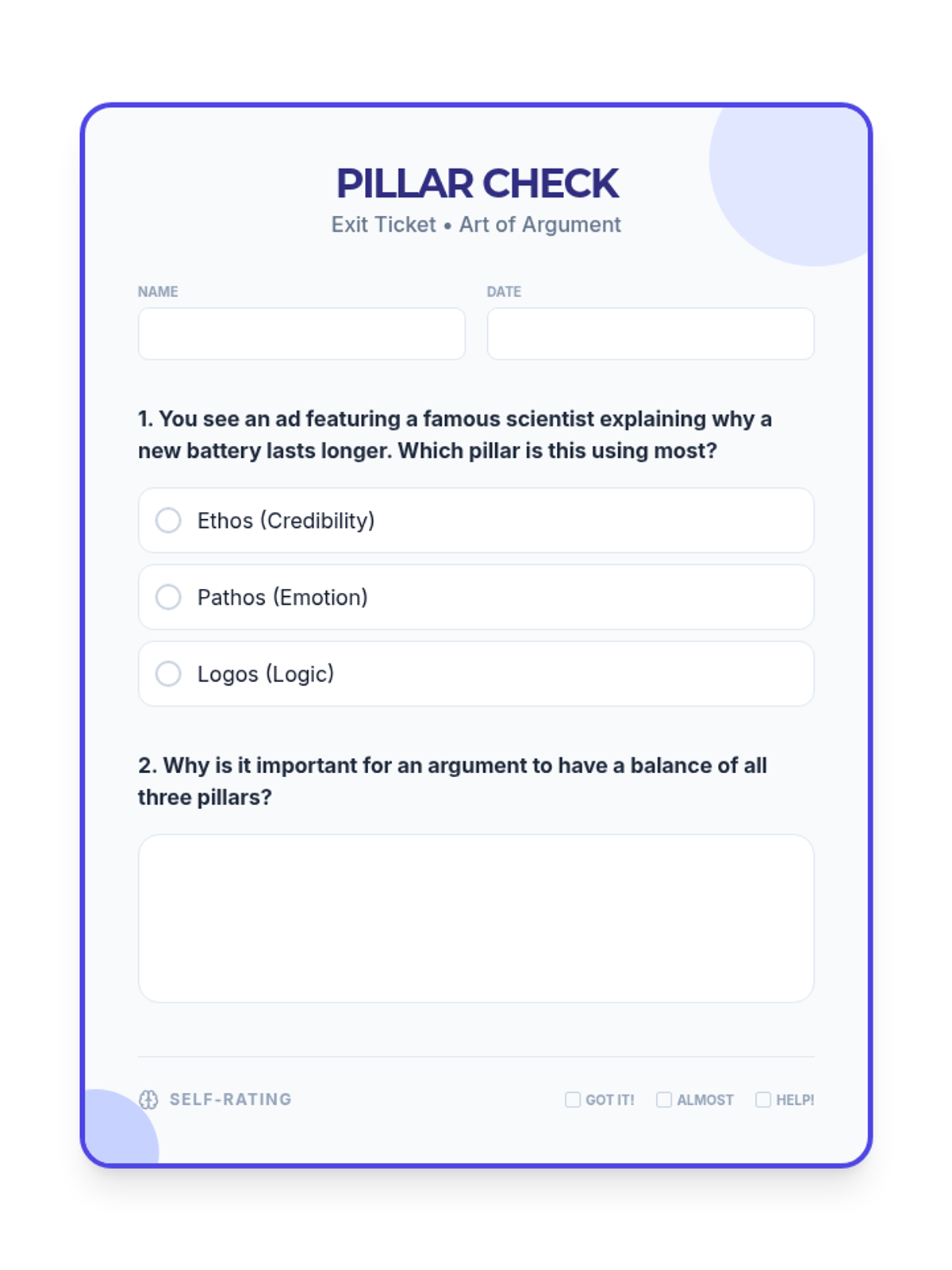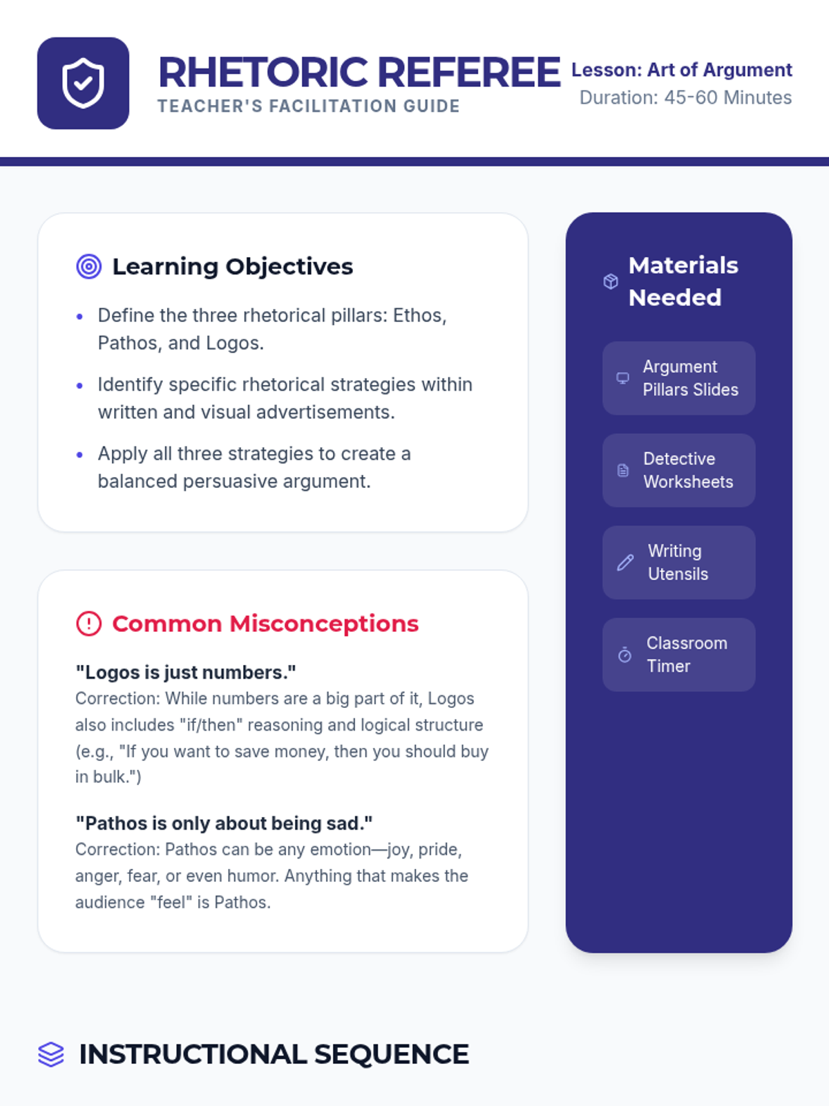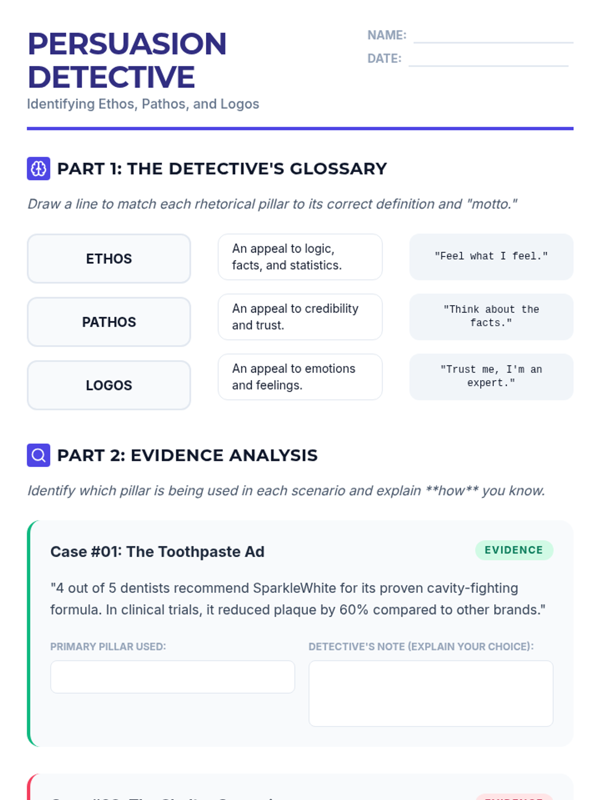 Students will learn the three pillars of persuasion—Ethos, Pathos, and Logos—and how to identify them in real-world examples. This lesson provides a comprehensive introduction to rhetorical strategies through visual instruction and guided practice.