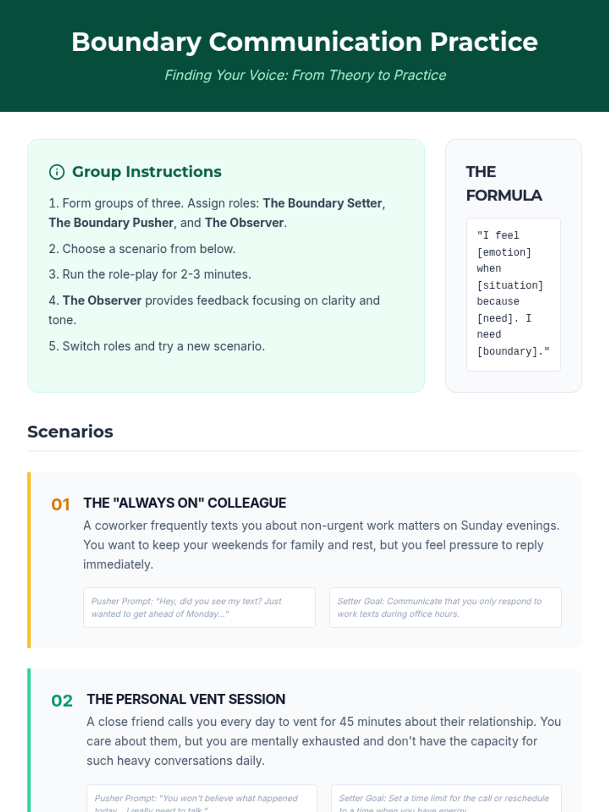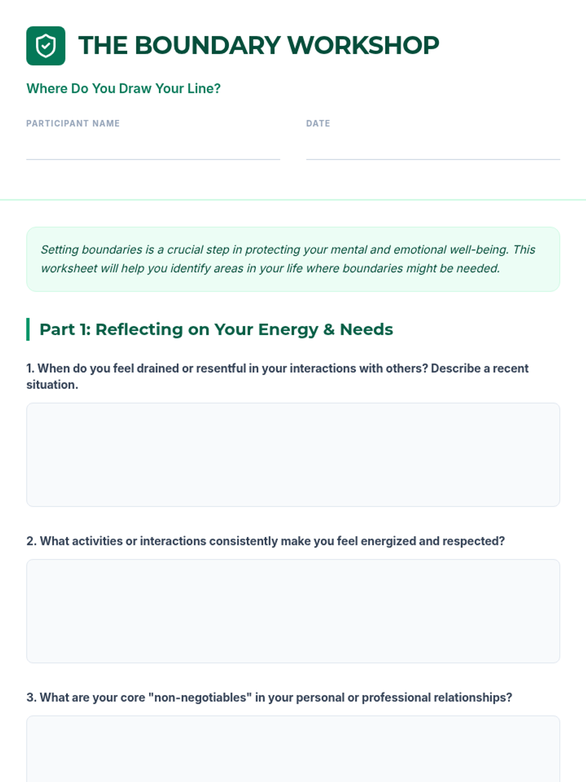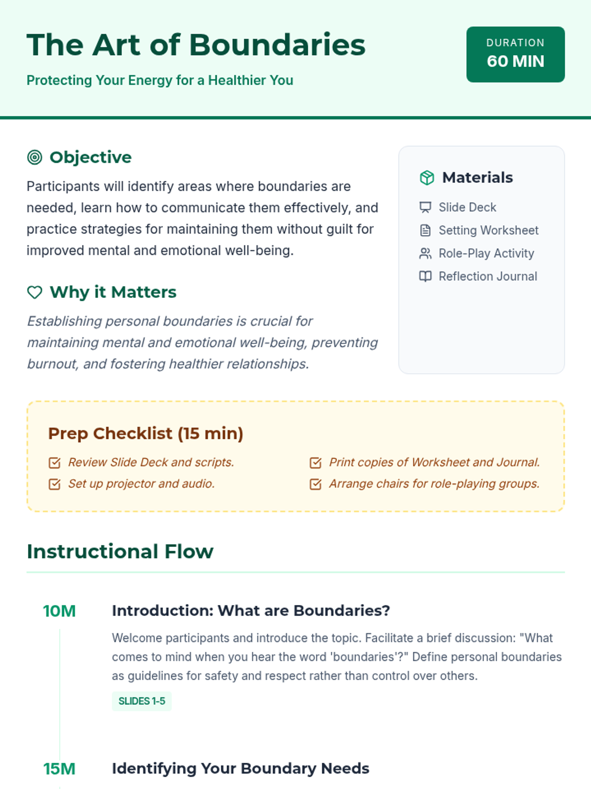 An interactive 60-minute lesson for adult learners on identifying, communicating, and maintaining personal boundaries to improve mental and emotional well-being.