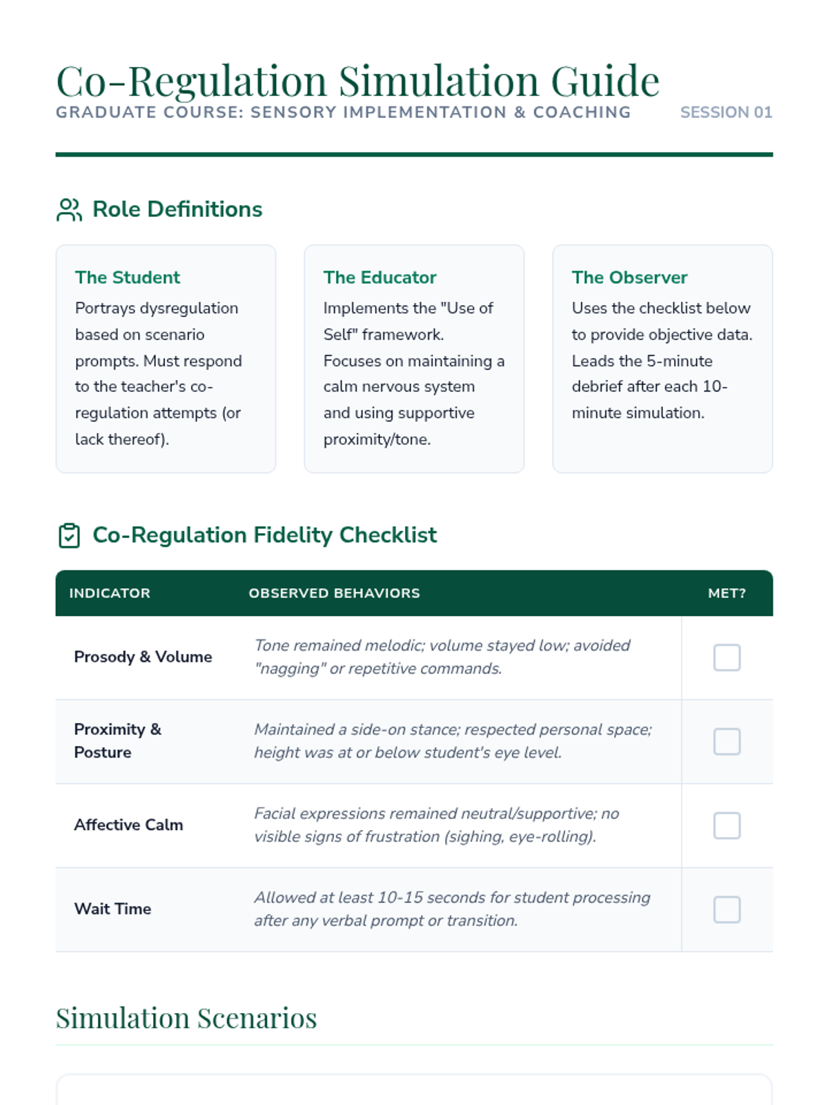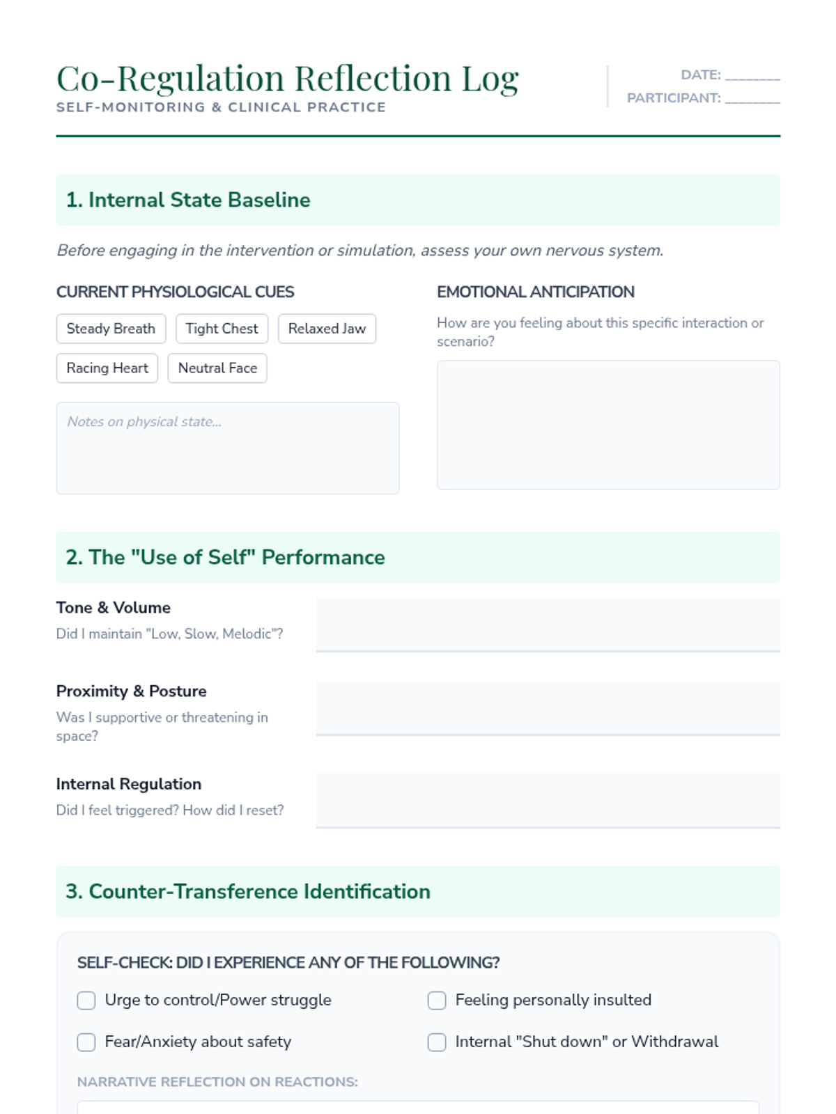 Explore the 'use of self' as a therapeutic tool, focusing on personal demeanor, tone, and managing counter-transference during student dysregulation.