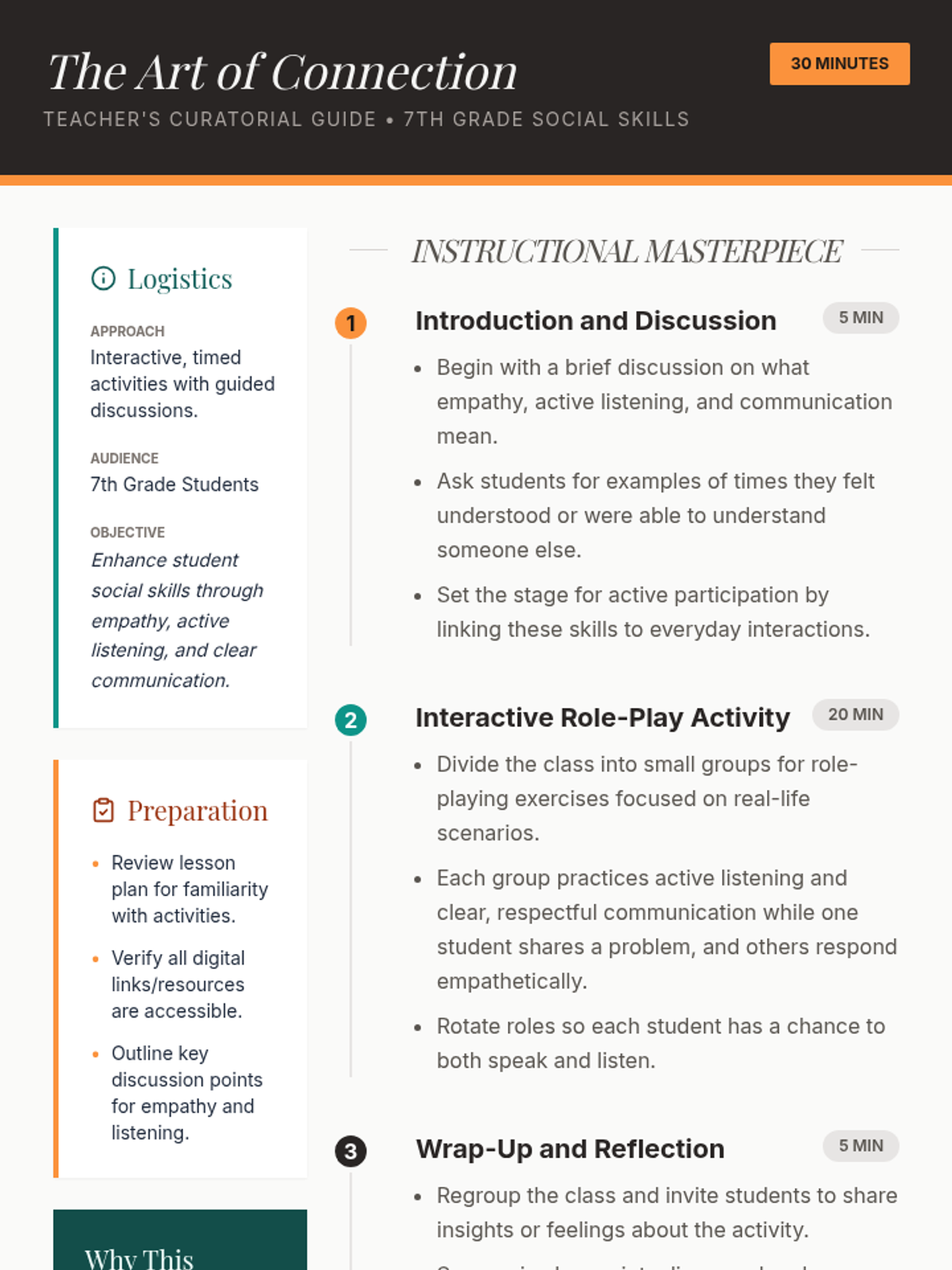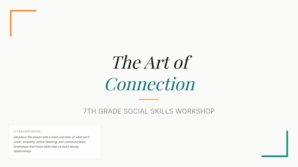 This lesson focuses on teaching 7th-grade students essential social skills like empathy and active listening to enhance their ability to connect with others. Students engage in interactive role-plays to practice these connection-building tools.