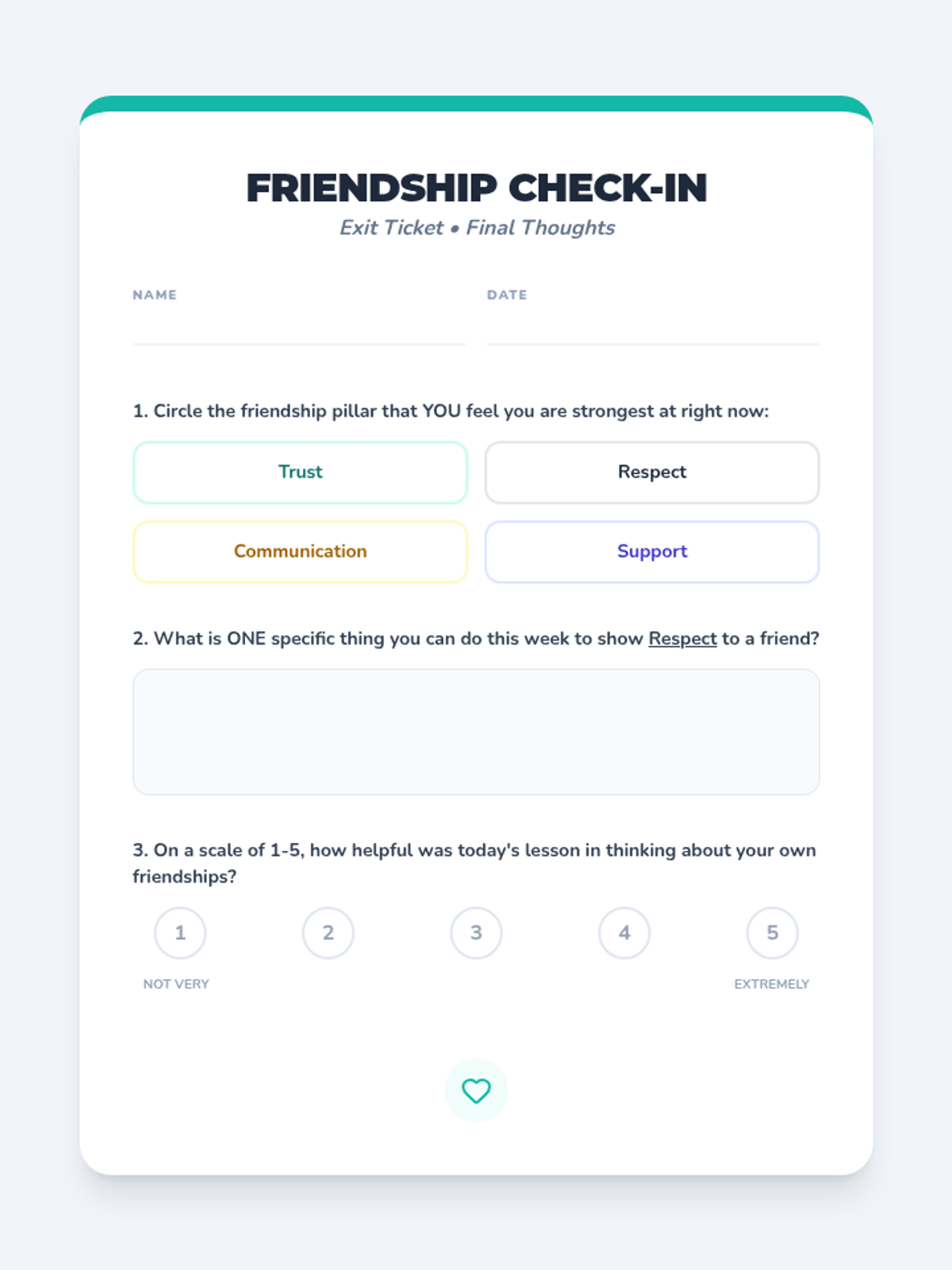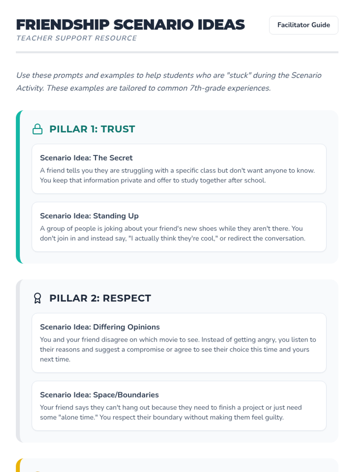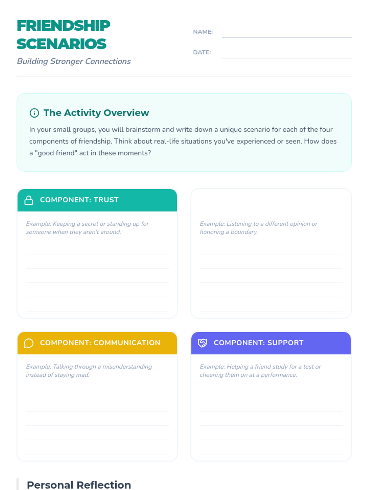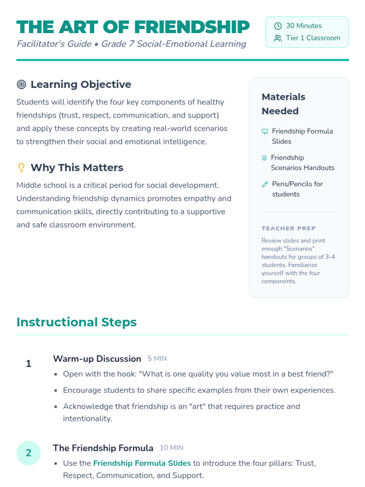 This 30-minute lesson for 7th graders explores the essential components of healthy friendships—trust, respect, communication, and support—through interactive group scenarios and reflection.
