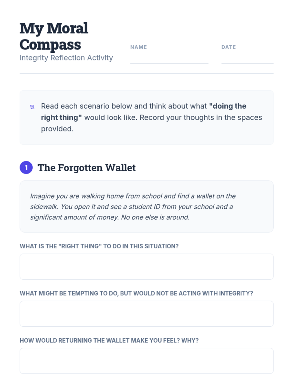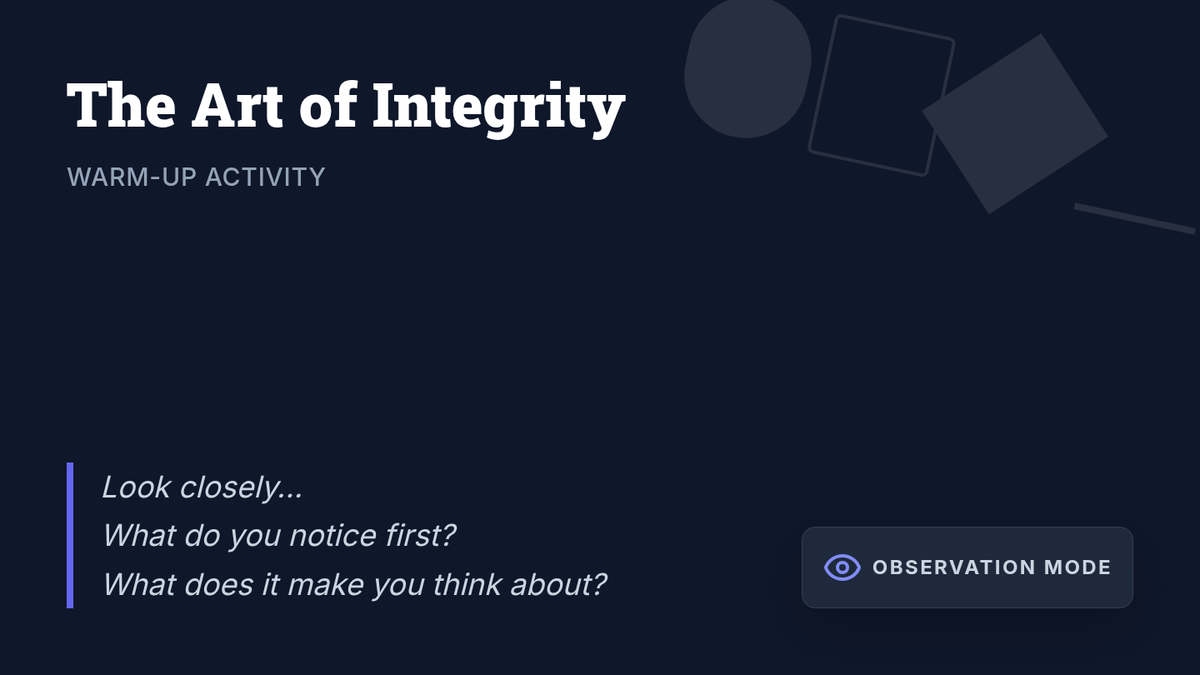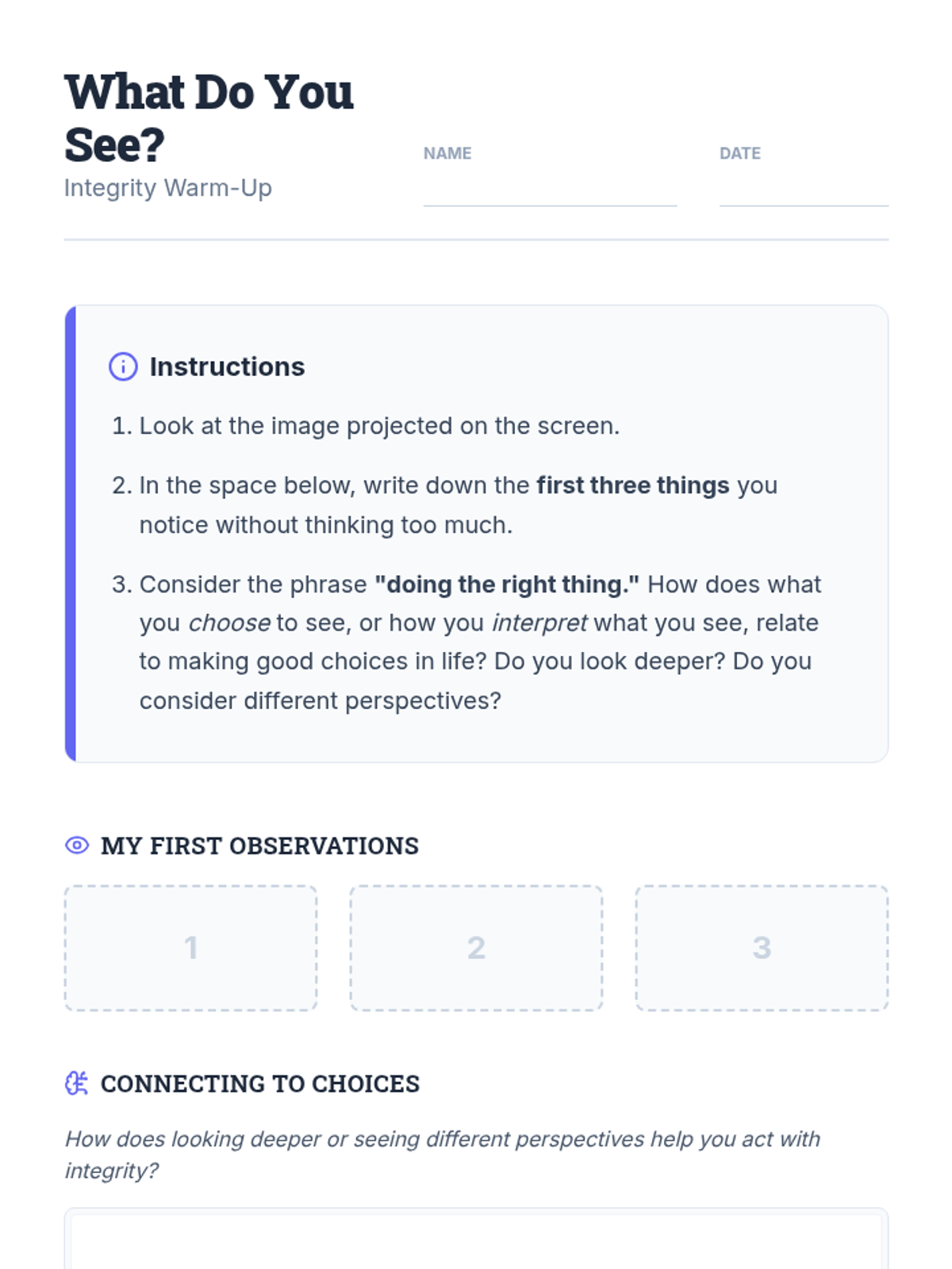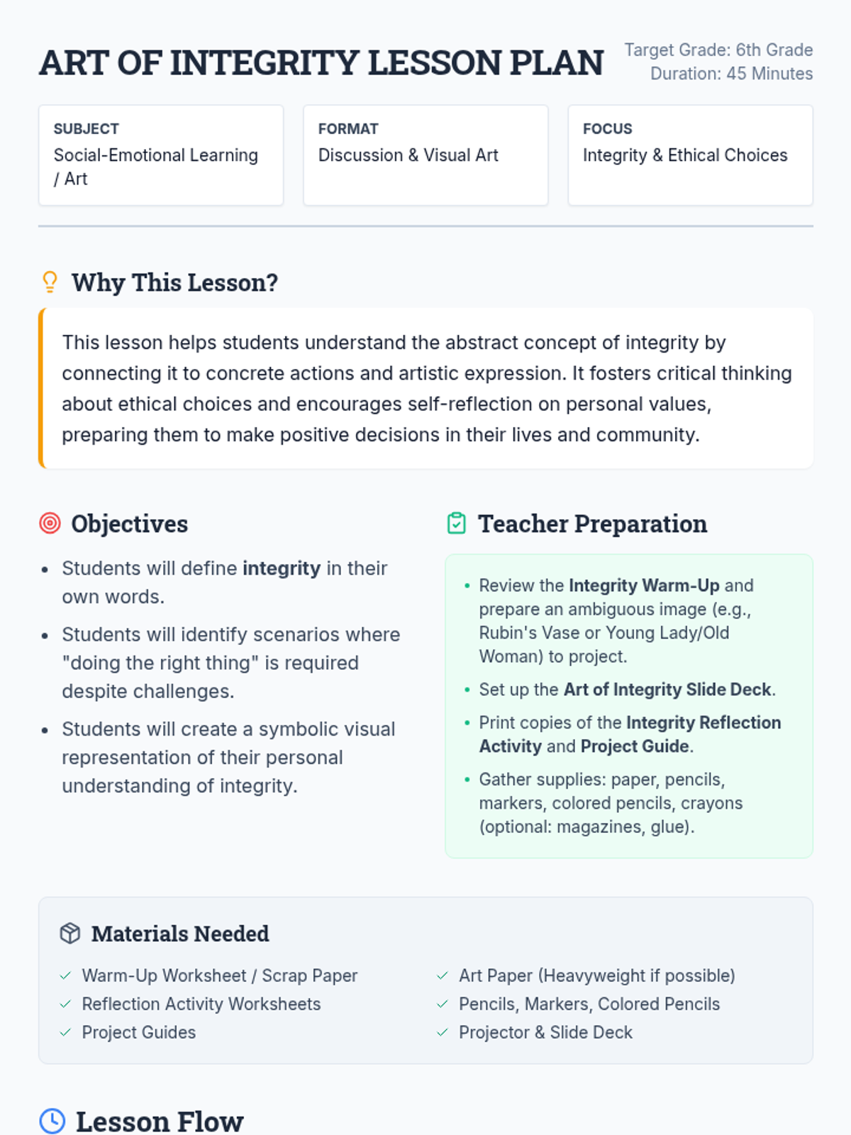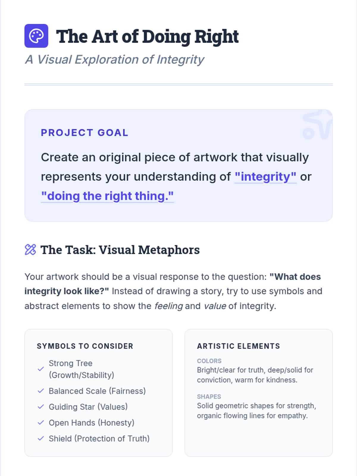 This lesson uses visual arts to explore the concept of integrity and doing the right thing. Students will create a symbolic artwork reflecting their understanding of ethical choices, connecting abstract moral concepts to tangible creative expression.