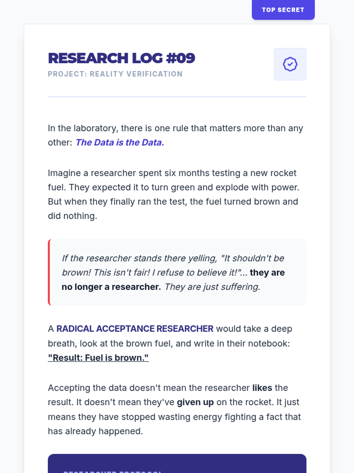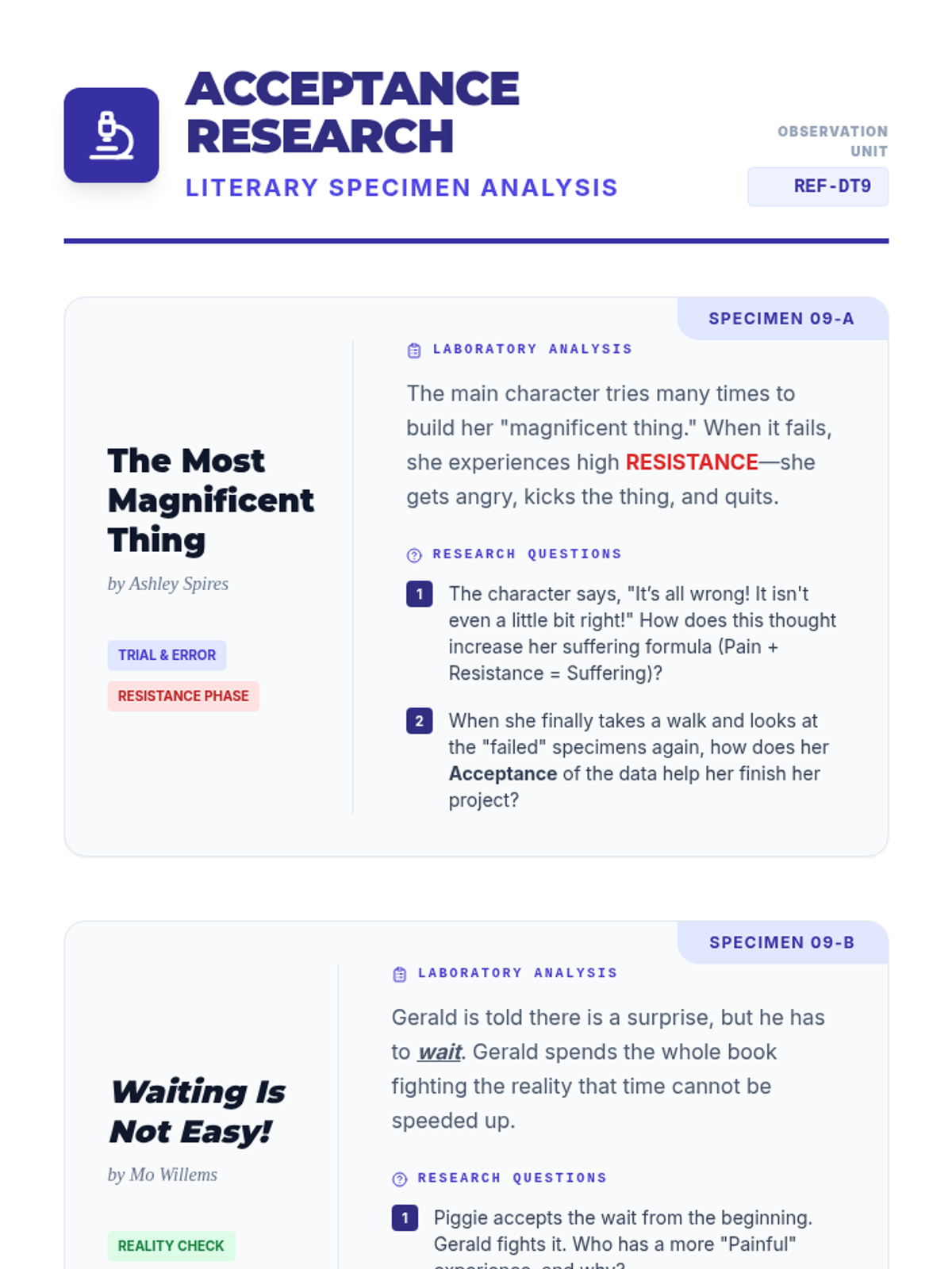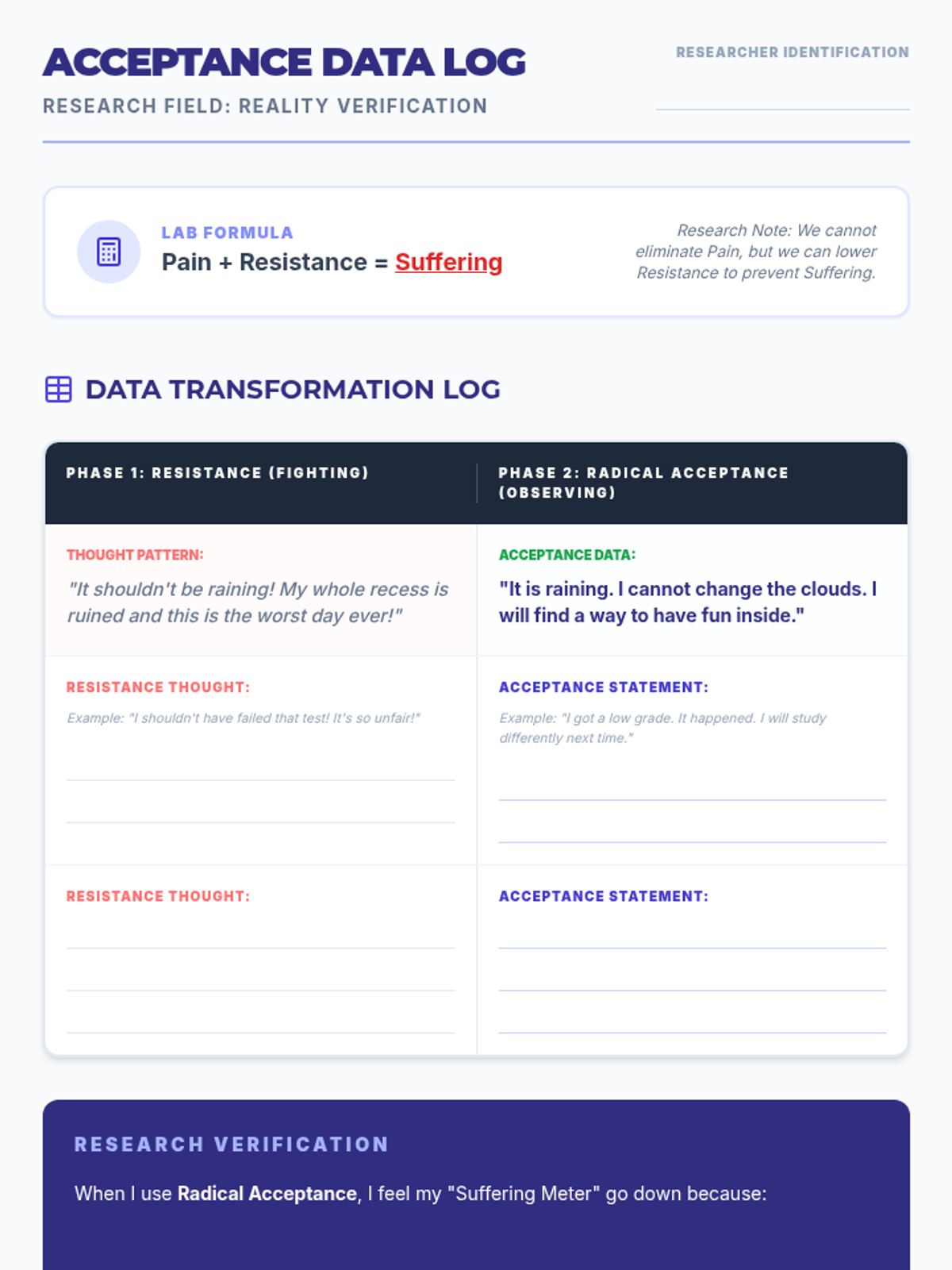 A lesson for grades 3-5 focused on the concept of Radical Acceptance, called the 'Acceptance Lab,' where students learn to accept reality as it is to reduce suffering and move toward problem-solving.