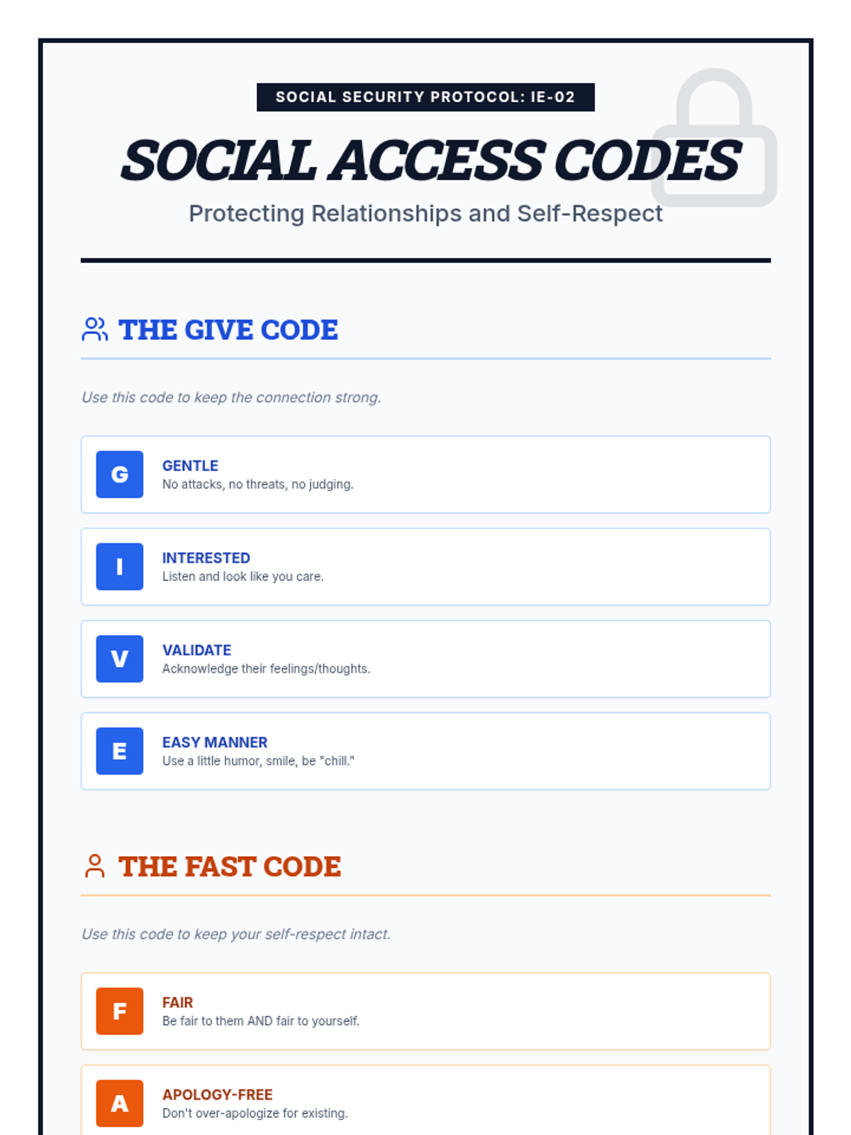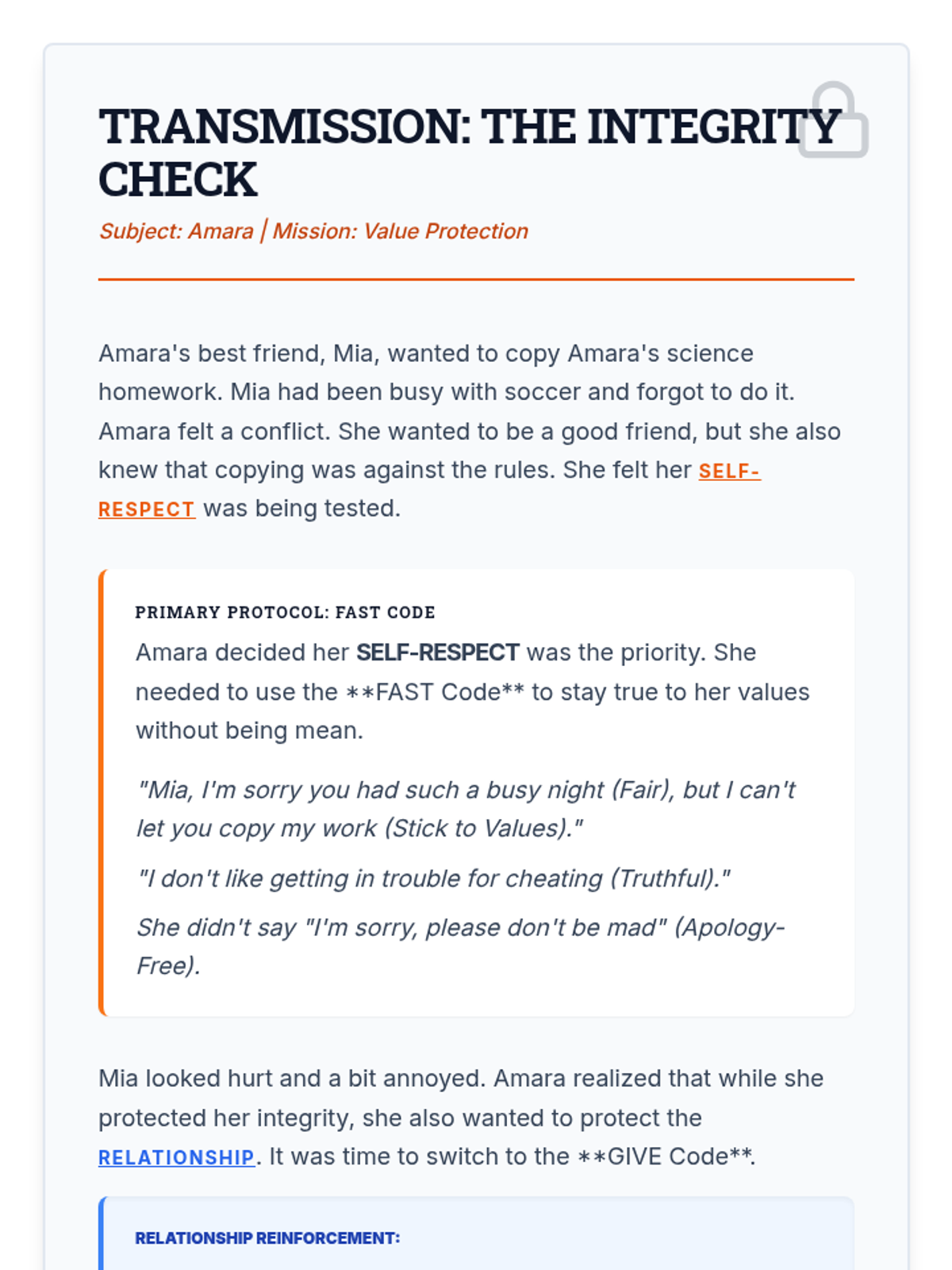 The final lesson of the 3-5 curriculum, teaching the FAST skill. This skill focuses on building and maintaining self-respect in social interactions by being fair, avoiding over-apologizing, sticking to one's values, and being honest.
