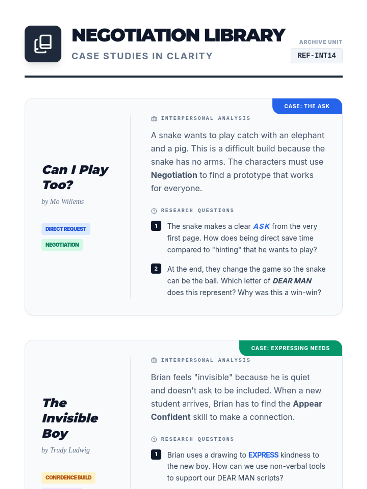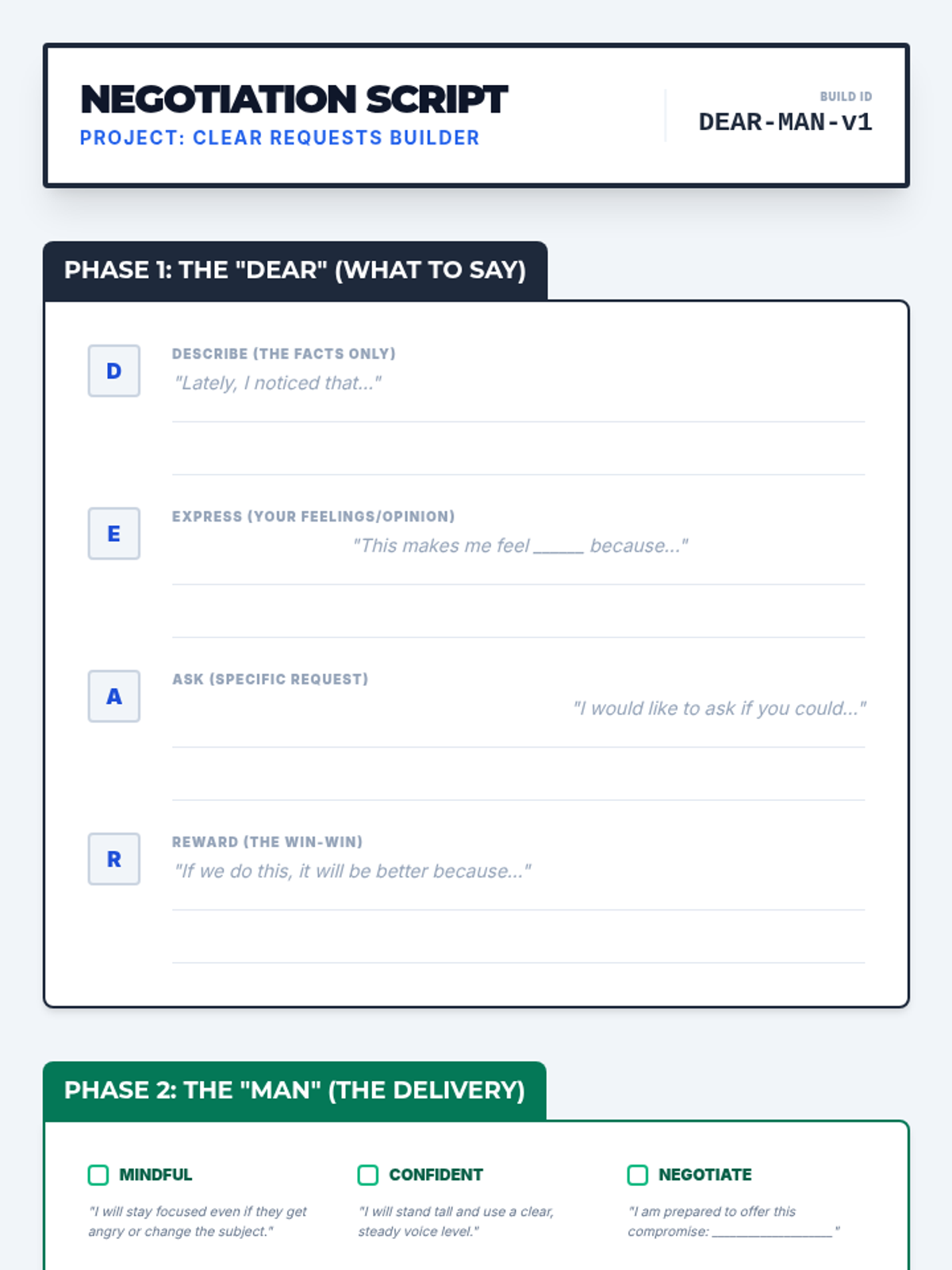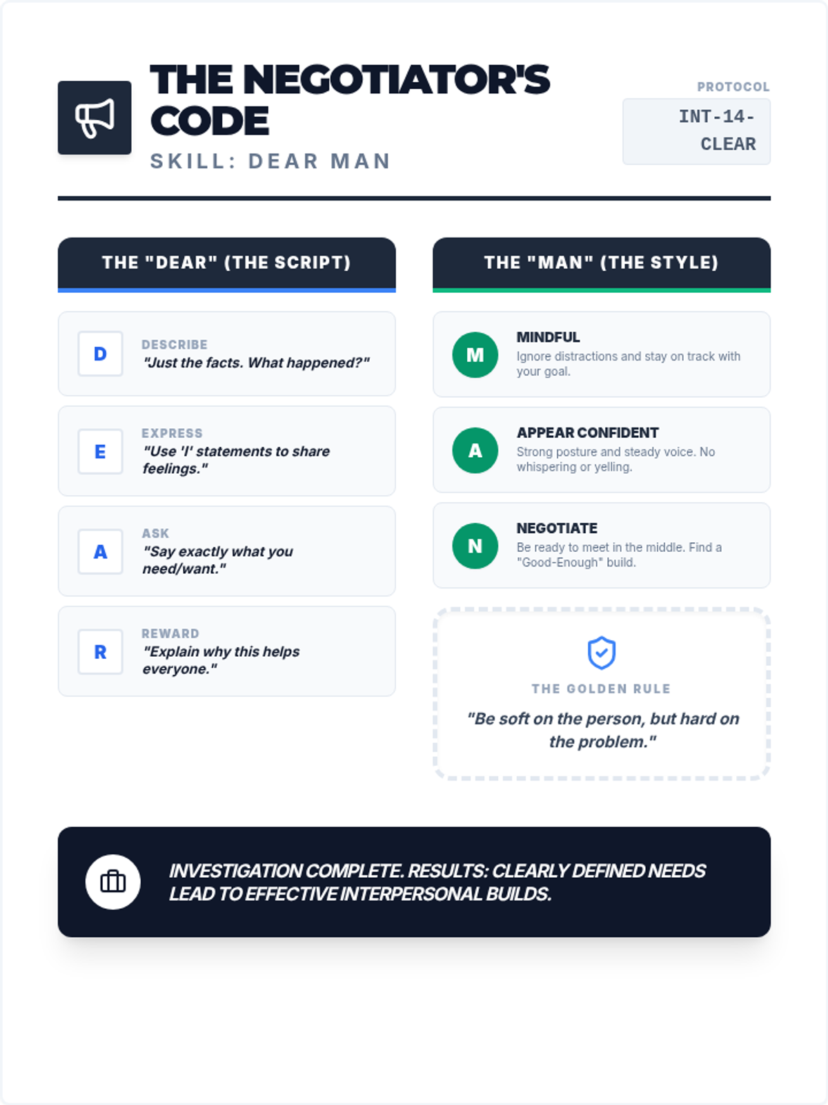 An Interpersonal Effectiveness lesson for grades 3-5 teaching the DEAR MAN protocol for making effective requests and setting boundaries.
