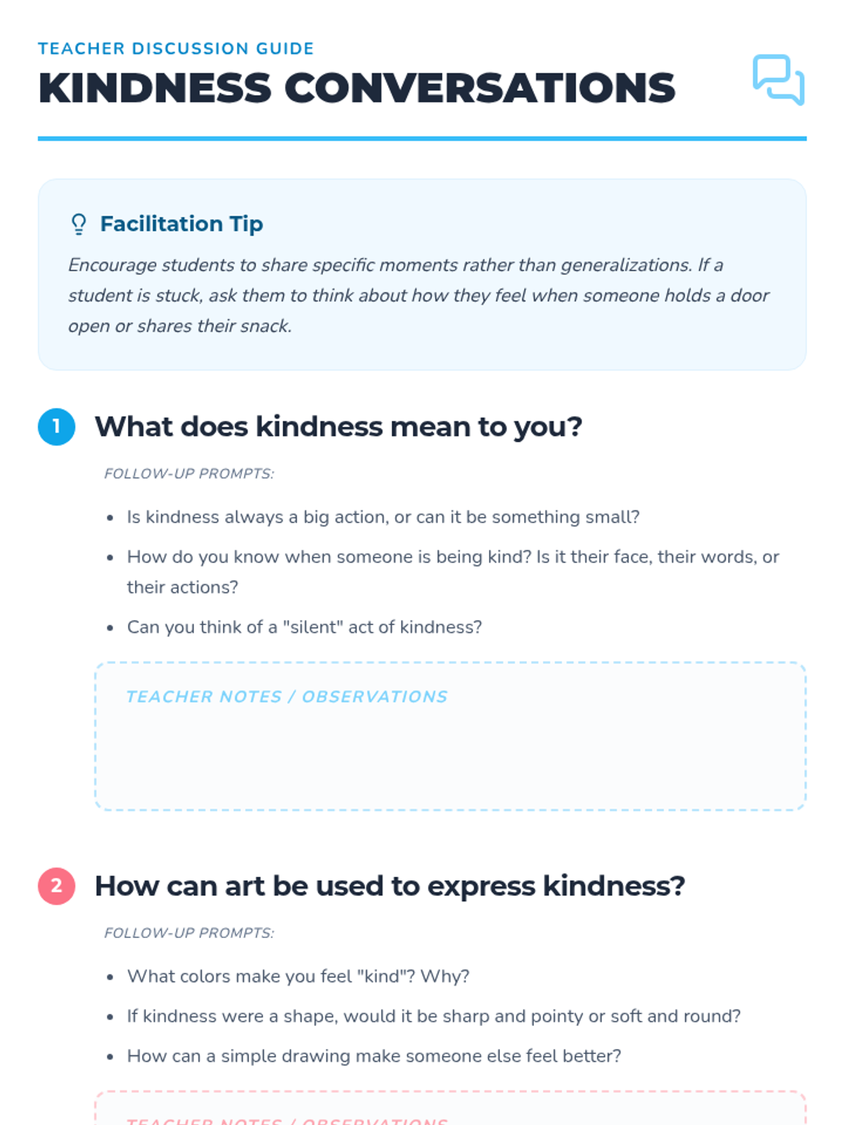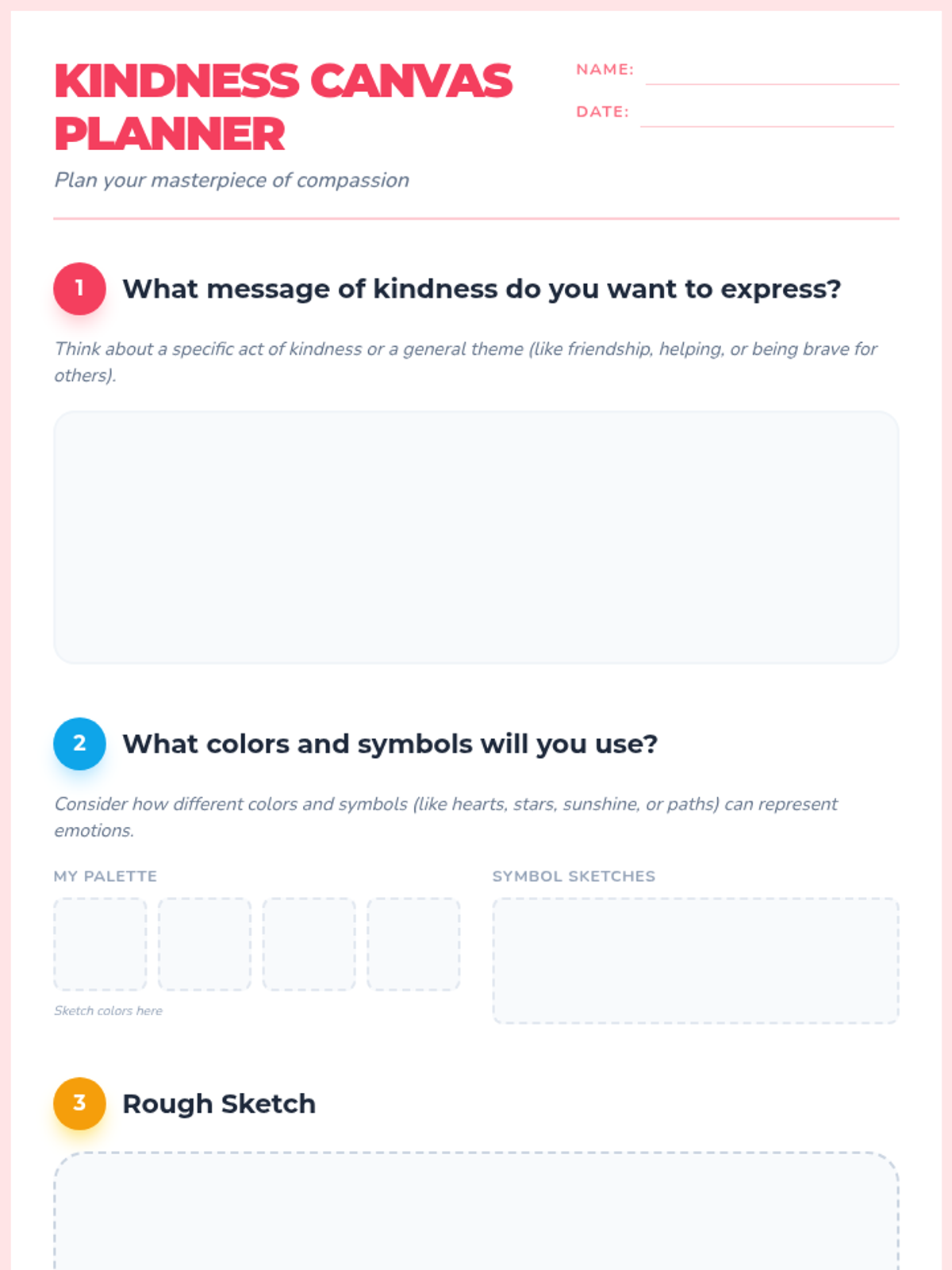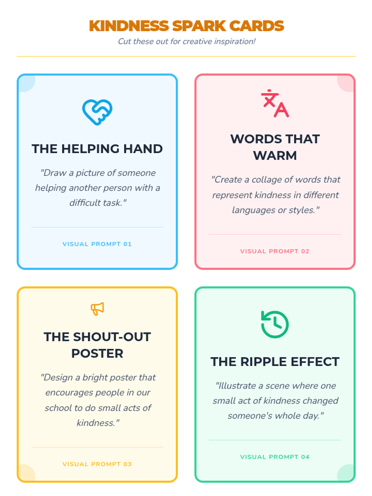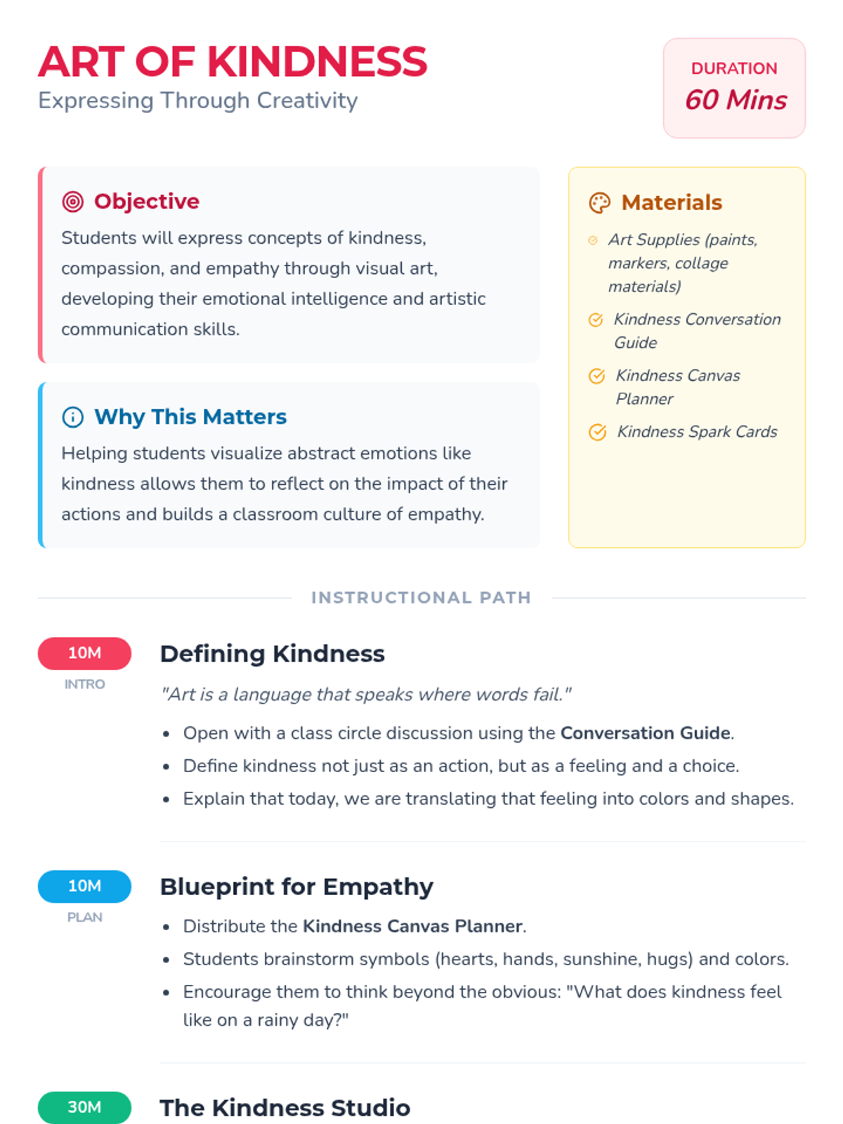 A creative arts lesson for 4th graders exploring kindness through visual expression and collaborative projects. Students will brainstorm, plan, and create art that conveys empathy and compassion.