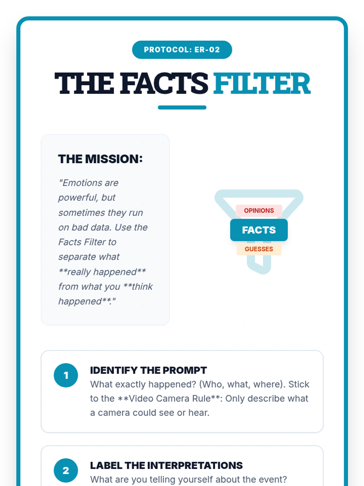 A lesson for grades 3-5 to teach the 'Check the Facts' skill. Students learn to use a 'Facts Filter' to determine if their emotional reaction matches the reality of a situation.