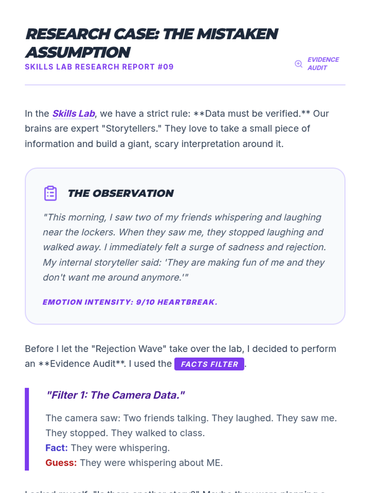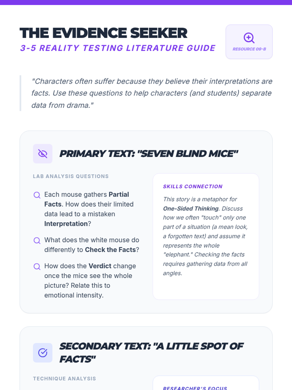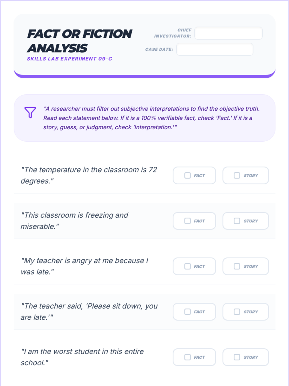 A lesson for grades 3-5 to introduce the 'Check the Facts' skill, where students act as investigators to determine if their emotional interpretations align with the objective evidence.
