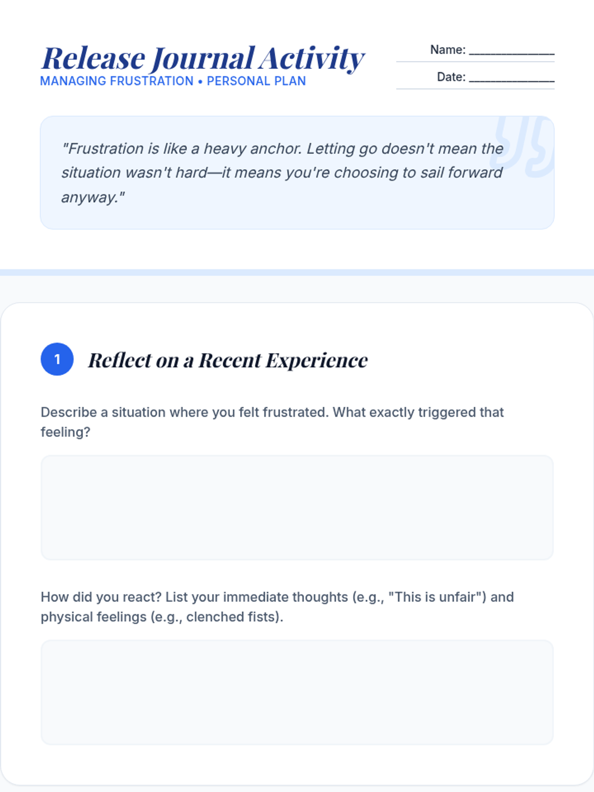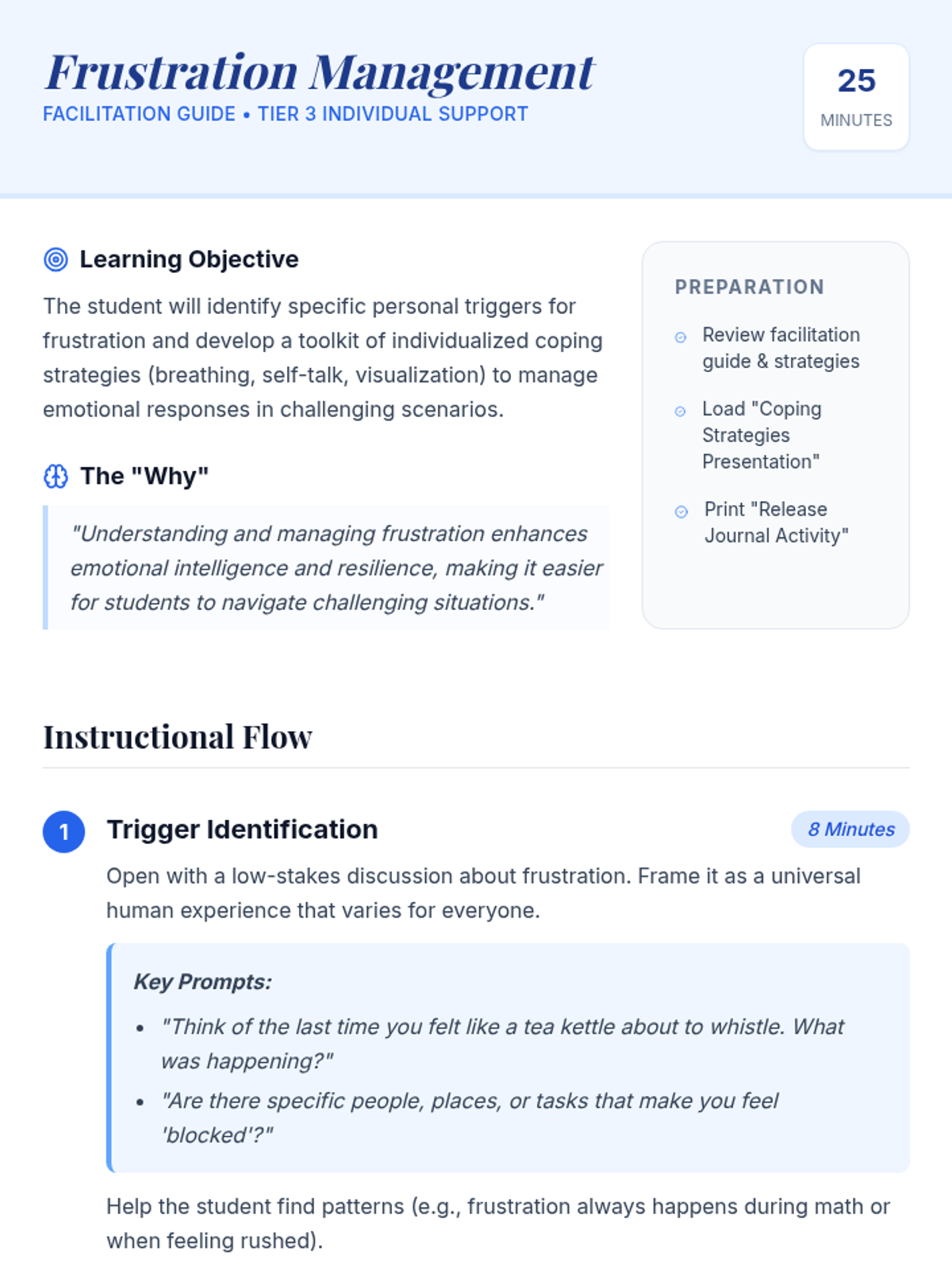 This Tier 3 individualized session helps students identify personal frustration triggers and develop tailored coping mechanisms like deep breathing and positive self-talk. It features a facilitation guide, an instructional slide deck, and a reflective journaling activity designed for one-on-one support.