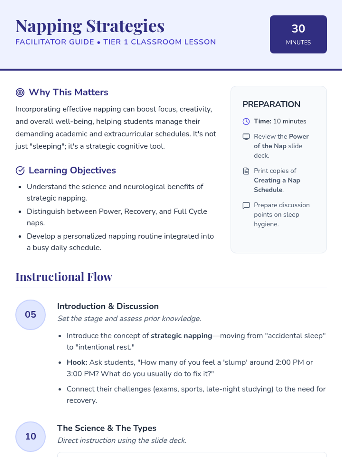A lesson designed for 10th-grade students to explore the science and practical application of strategic napping to improve focus and well-being.