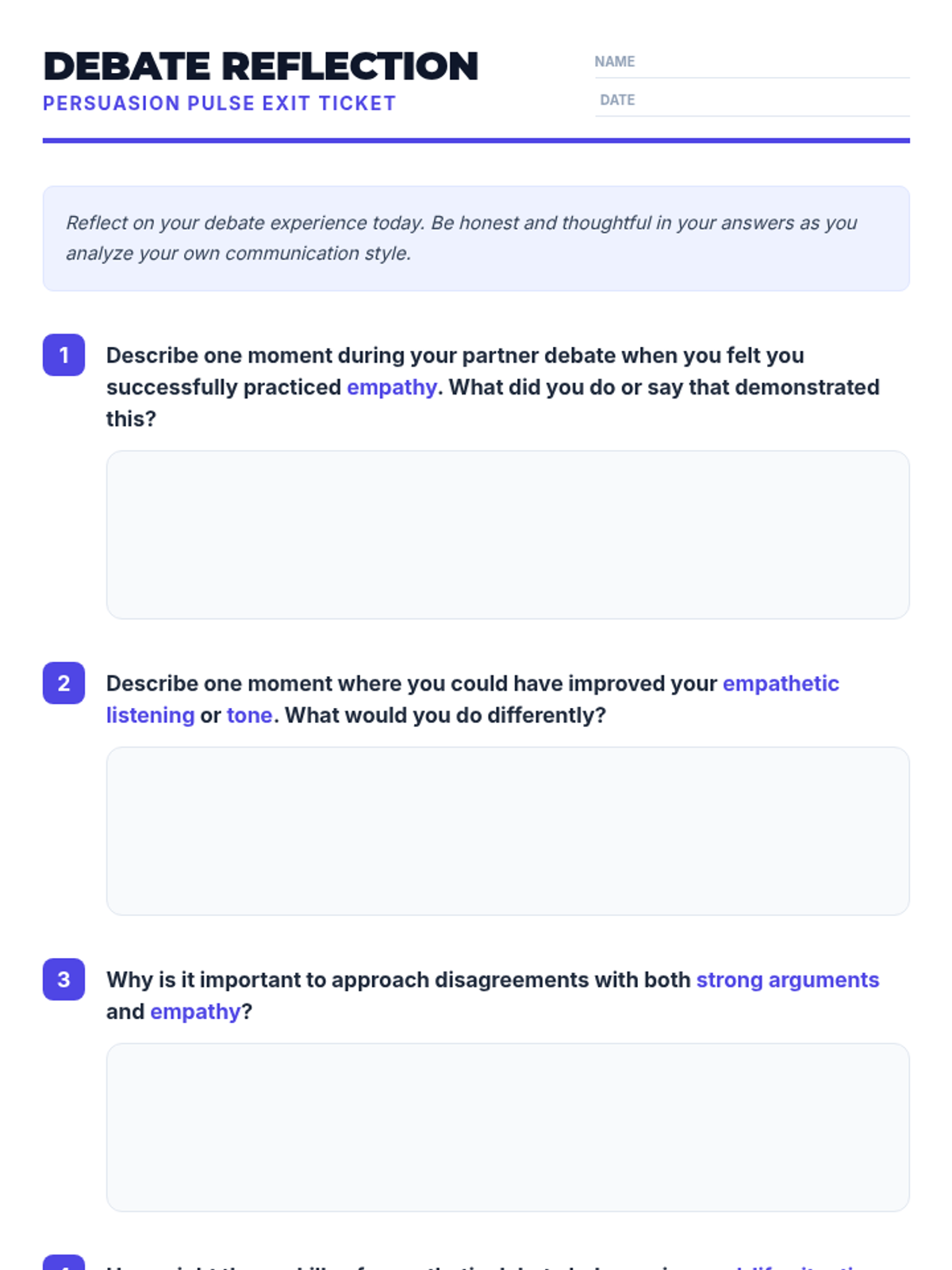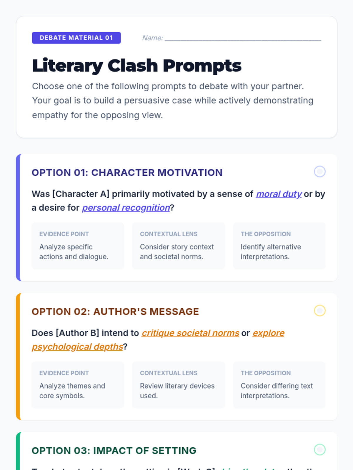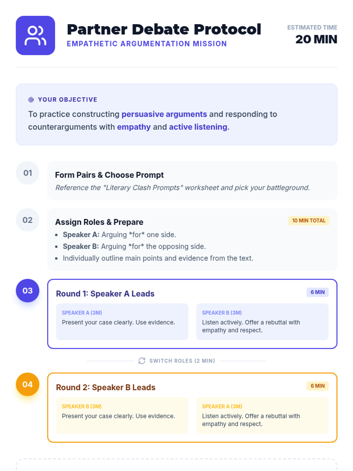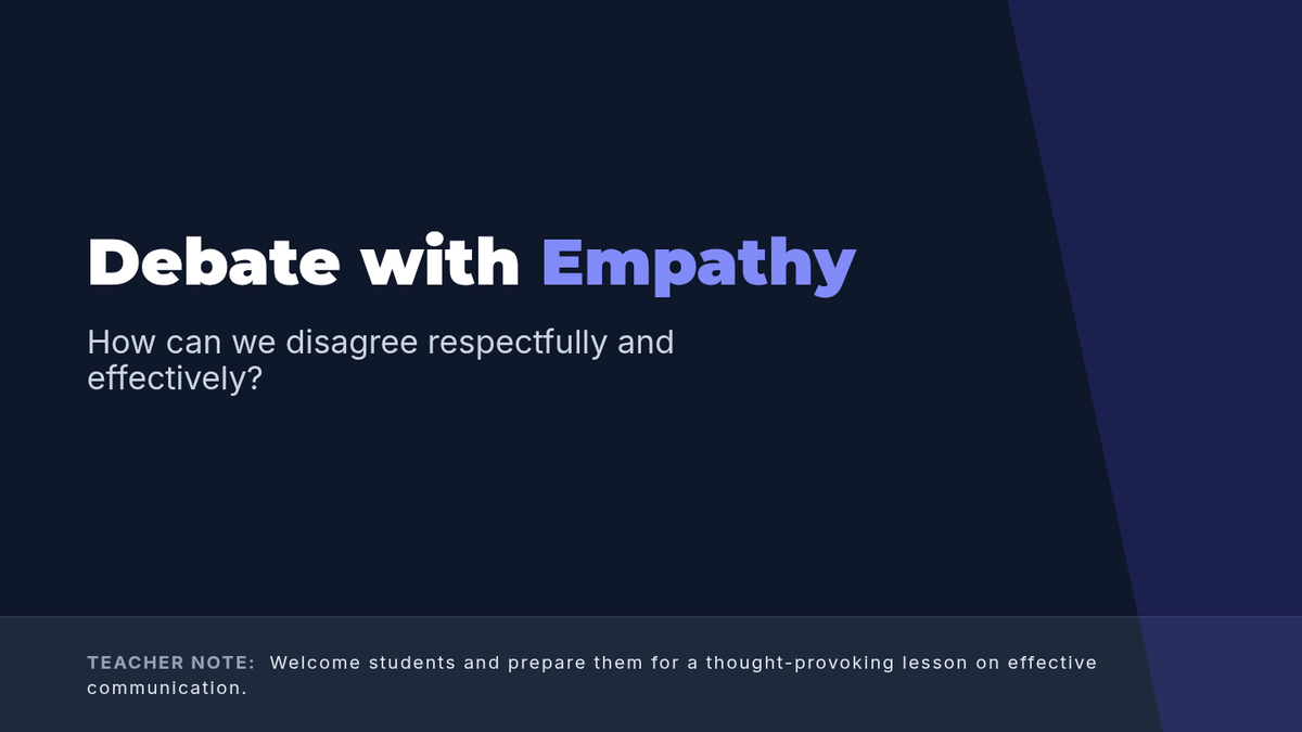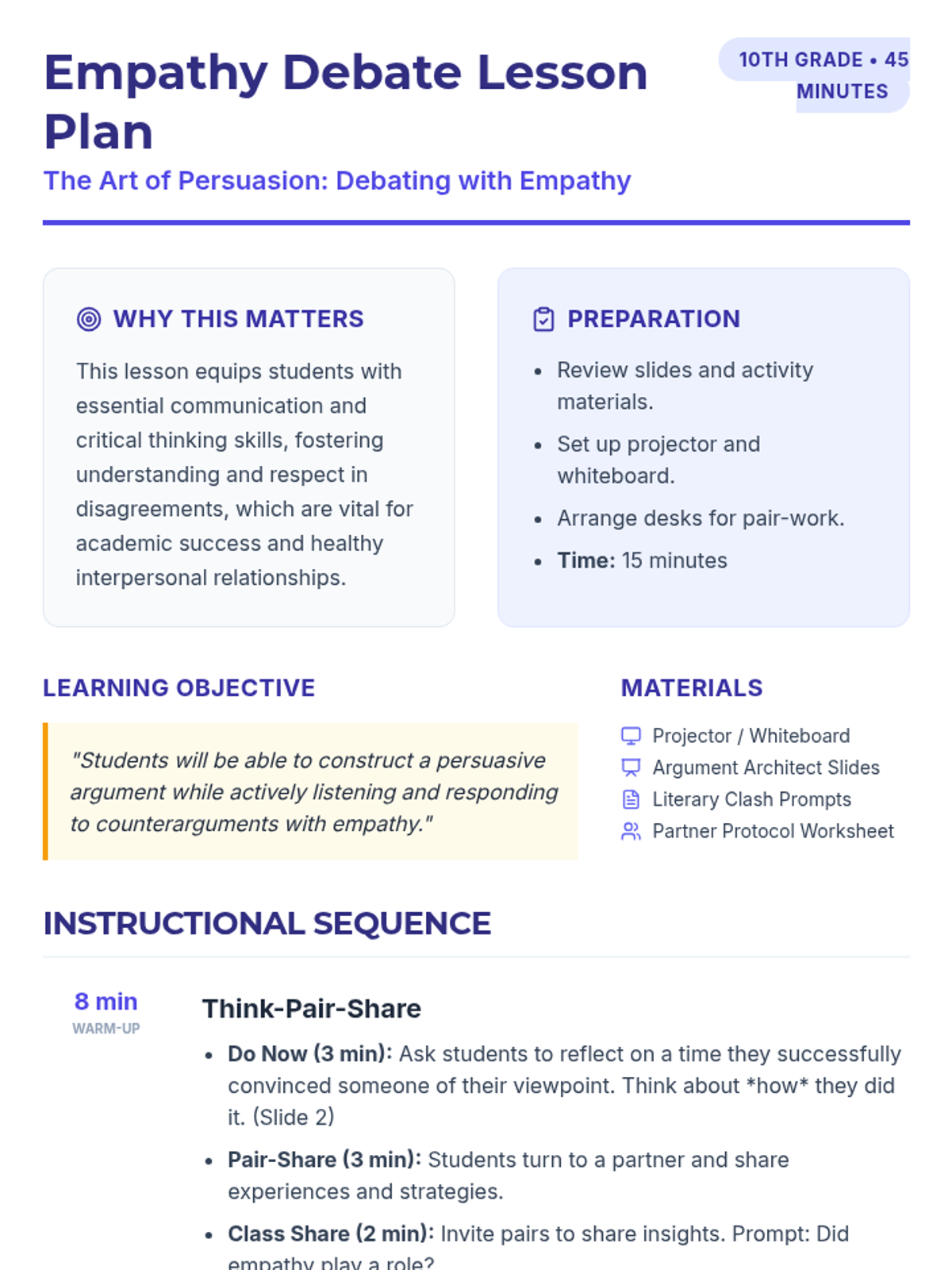 A 45-minute 10th-grade lesson focusing on the intersection of persuasive rhetoric and empathetic listening. Students learn to build strong arguments while maintaining respect and understanding for opposing viewpoints through a literary debate activity.