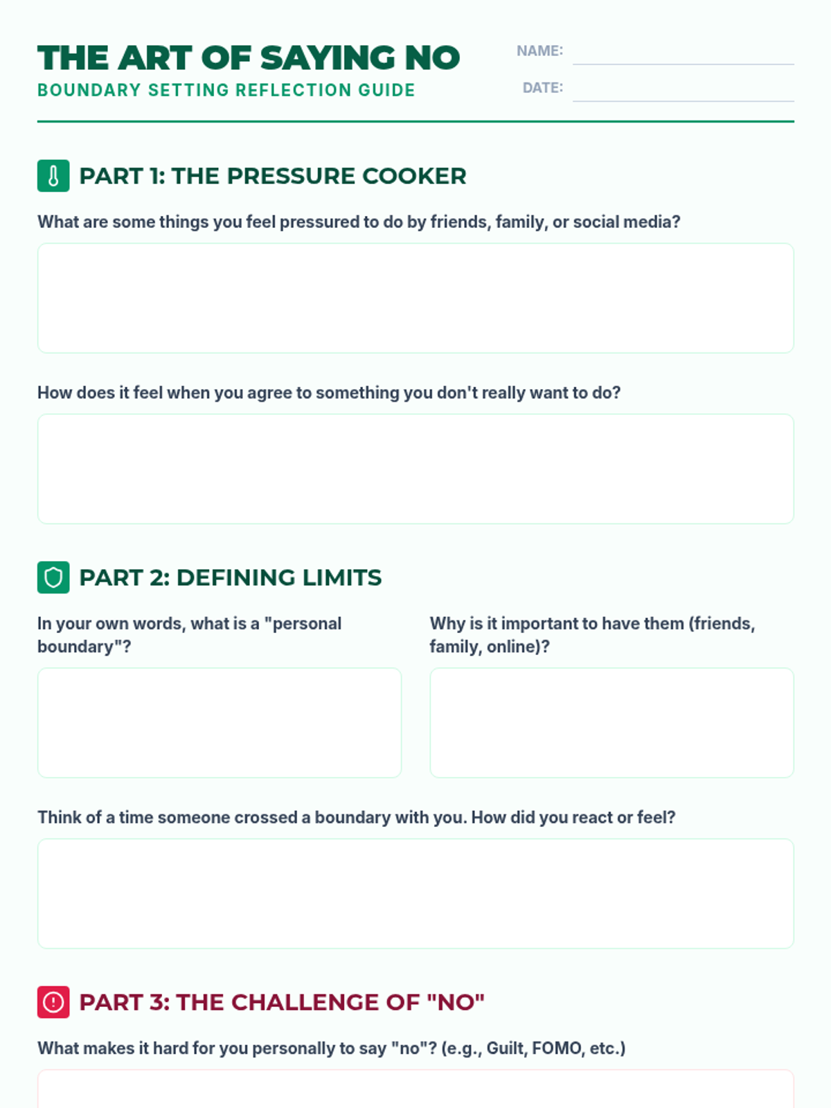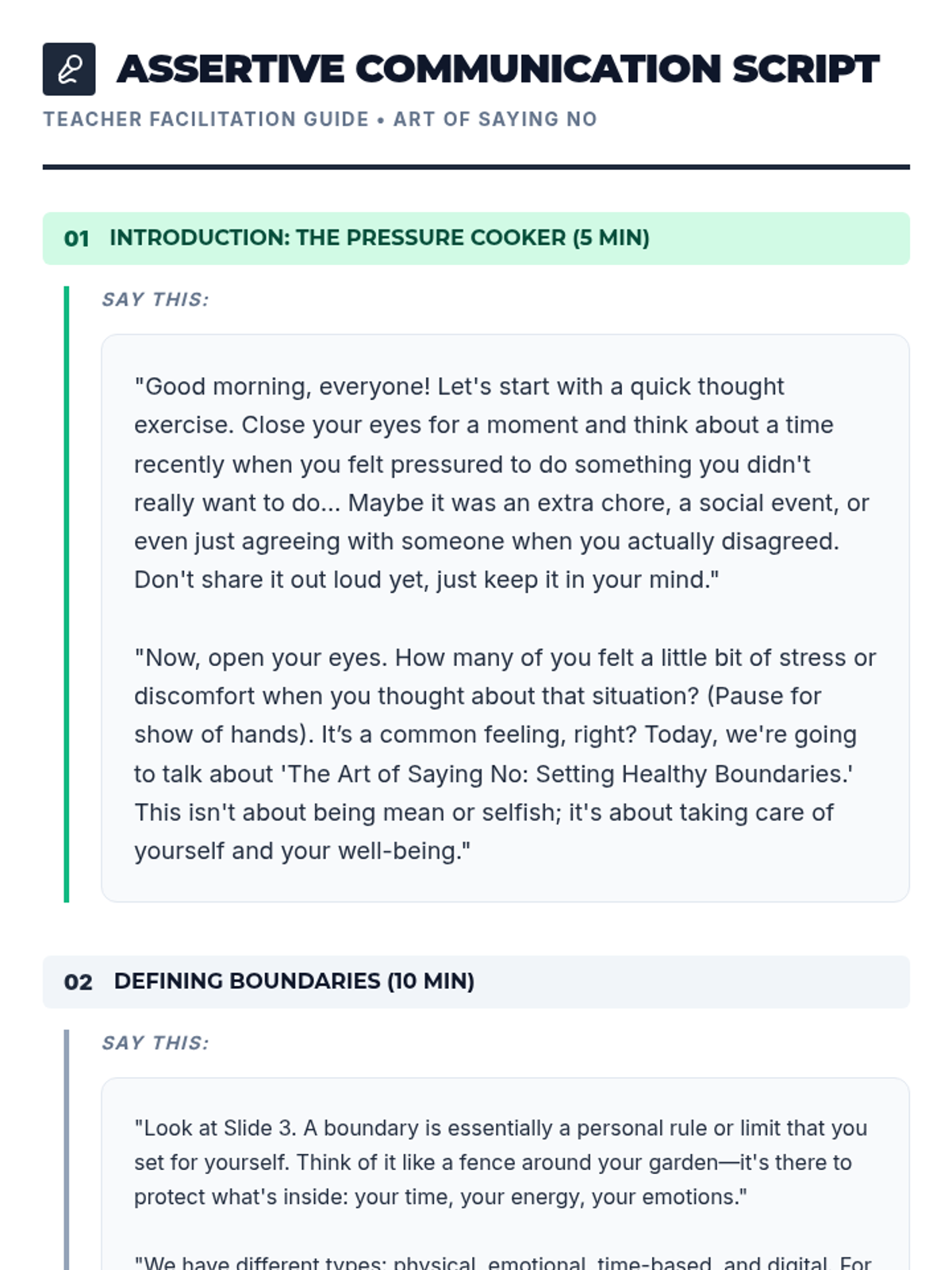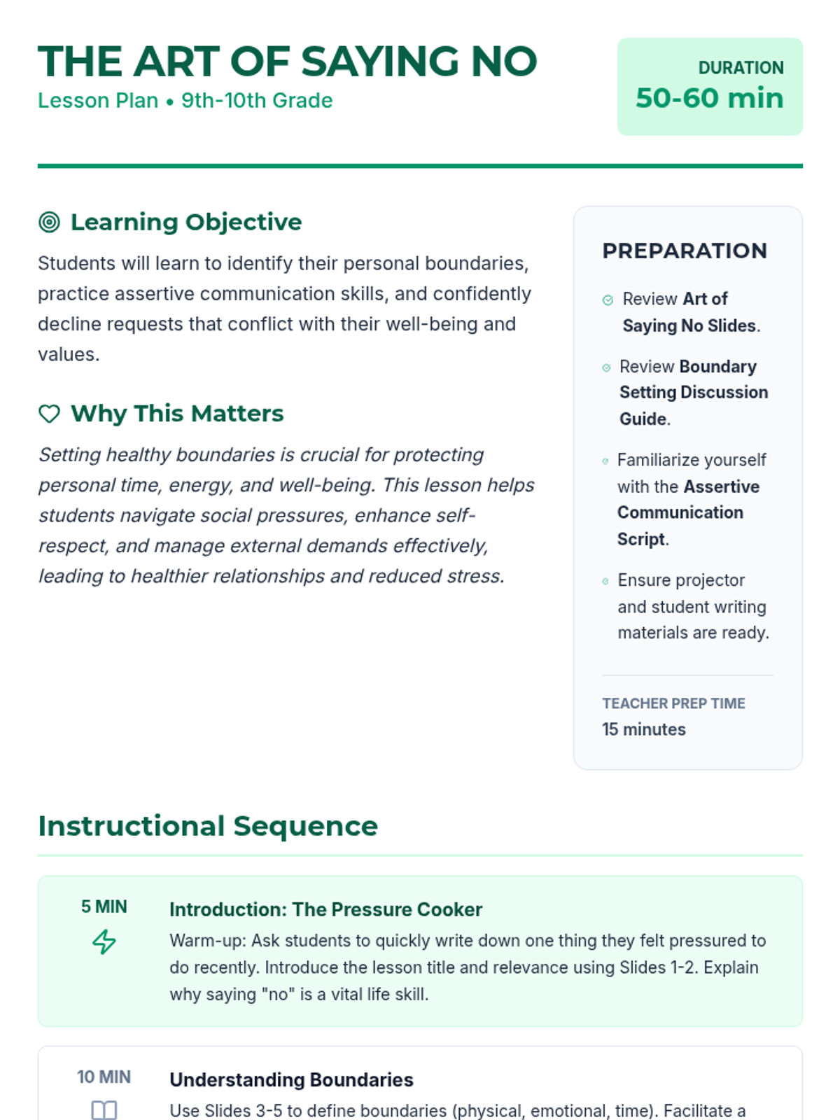 A 50-60 minute lesson for 9th and 10th graders on identifying personal limits, practicing assertive communication, and confidently setting boundaries to manage external pressures and enhance self-respect.