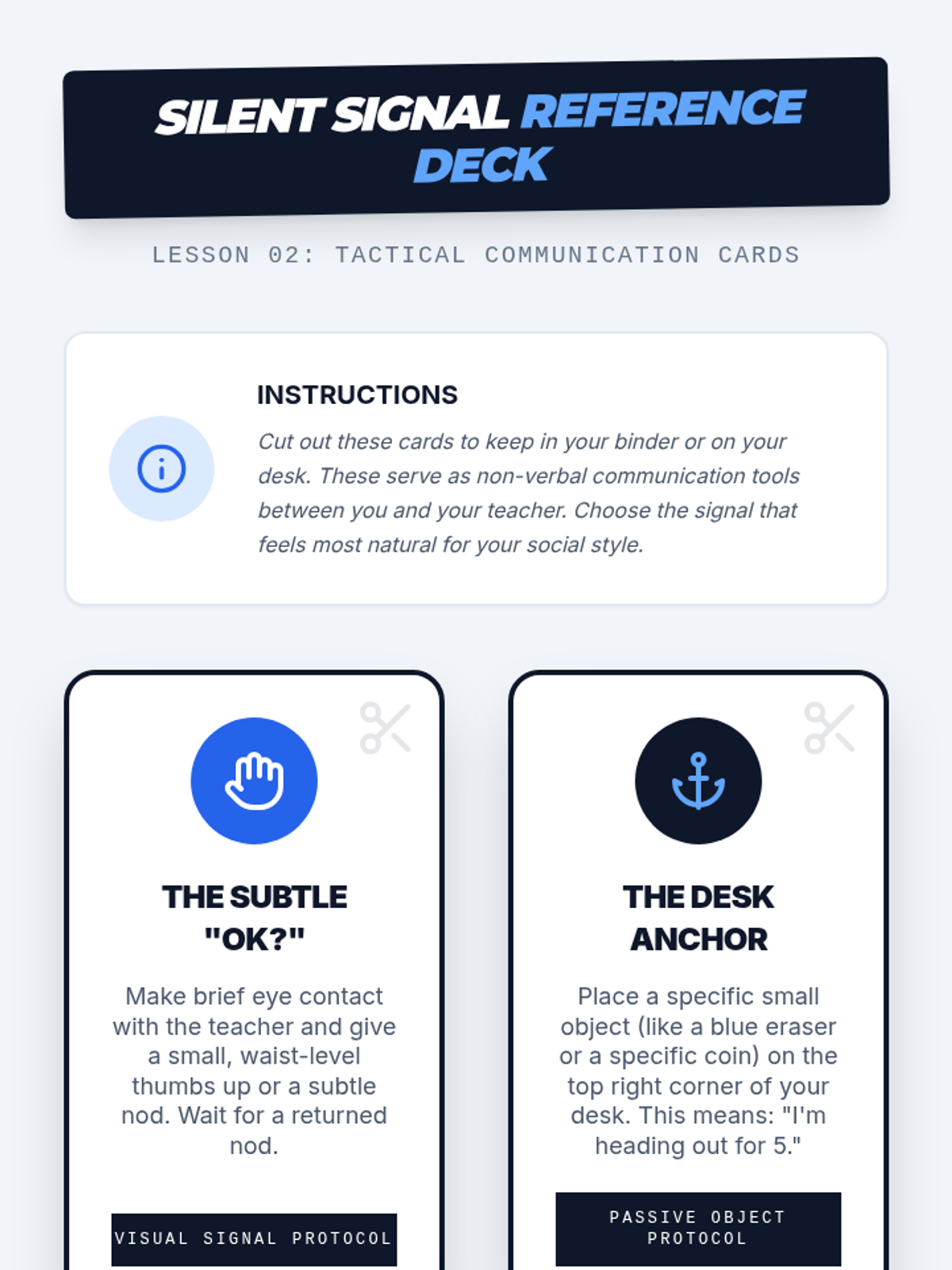 A set of discreet communication cards designed for an 8th-grade student to advocate for their needs during moments of frustration or sensory overwhelm.