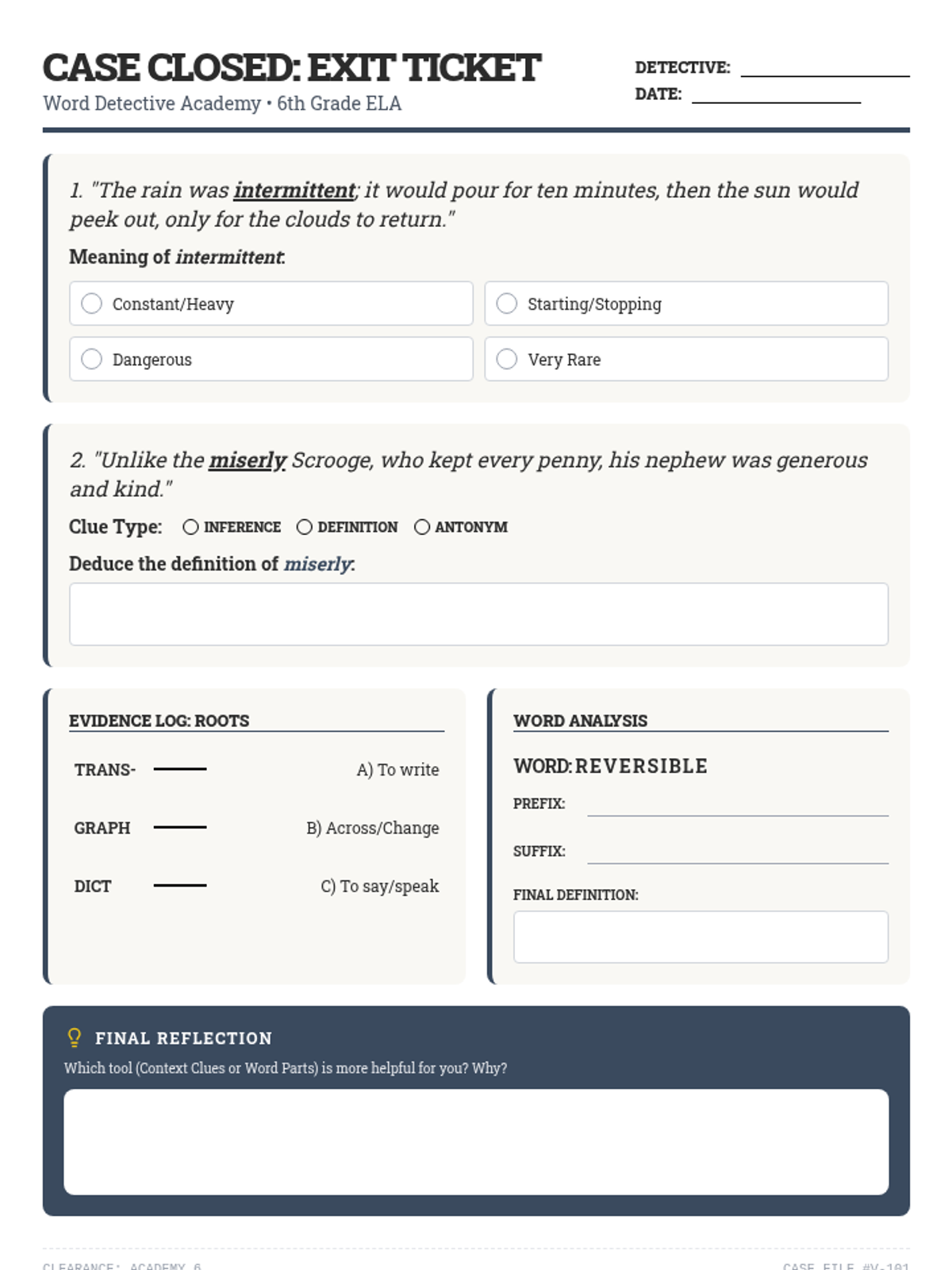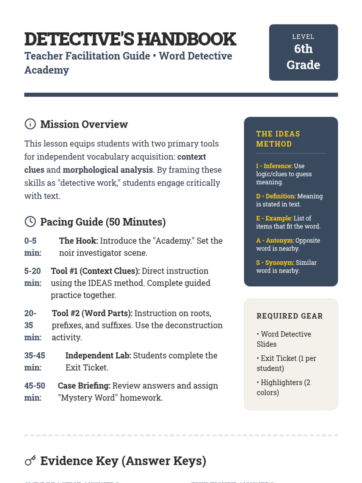 A 6th grade ELA lesson focused on using context clues and morphology (prefixes, suffixes, and roots) to decipher unfamiliar vocabulary. Students act as 'word detectives' to solve linguistic mysteries.