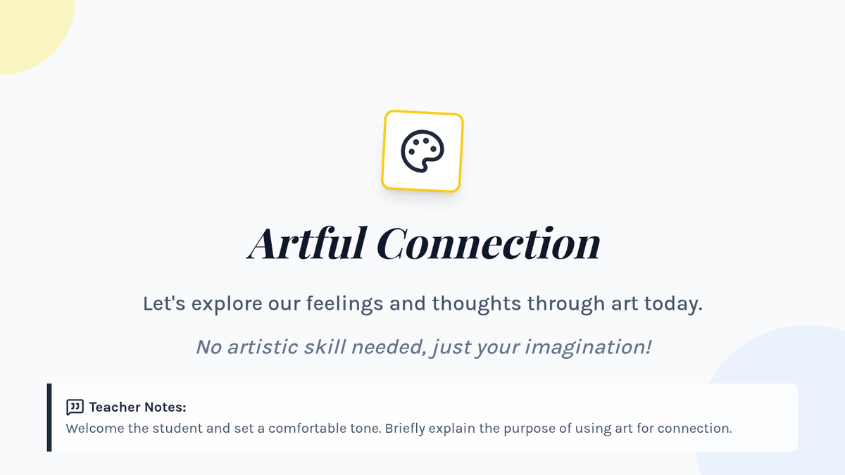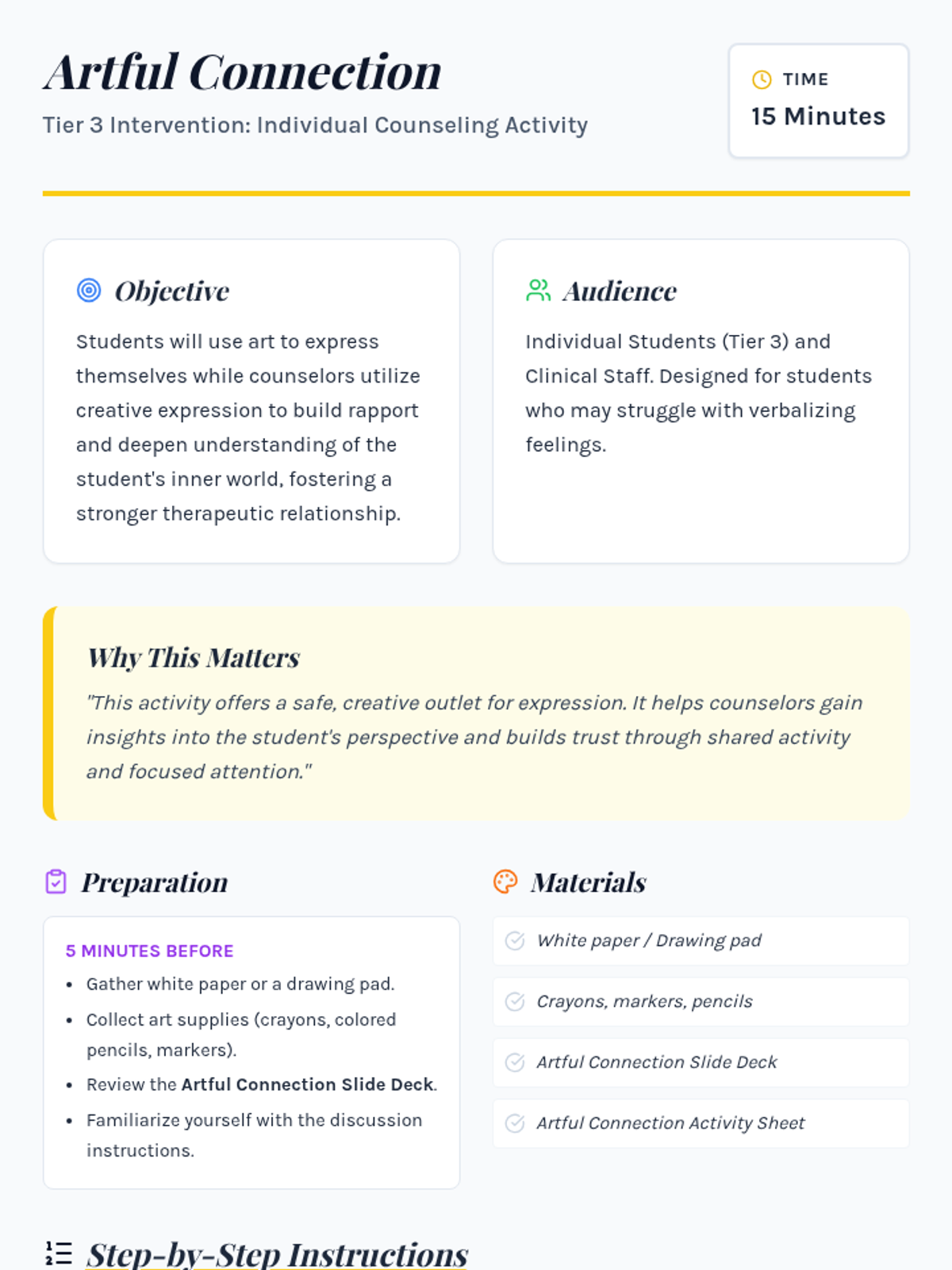 A Tier 3 counseling activity using art to build rapport and facilitate emotional expression between a counselor and an individual student. This 15-minute session focuses on creative communication and deepening the therapeutic relationship.