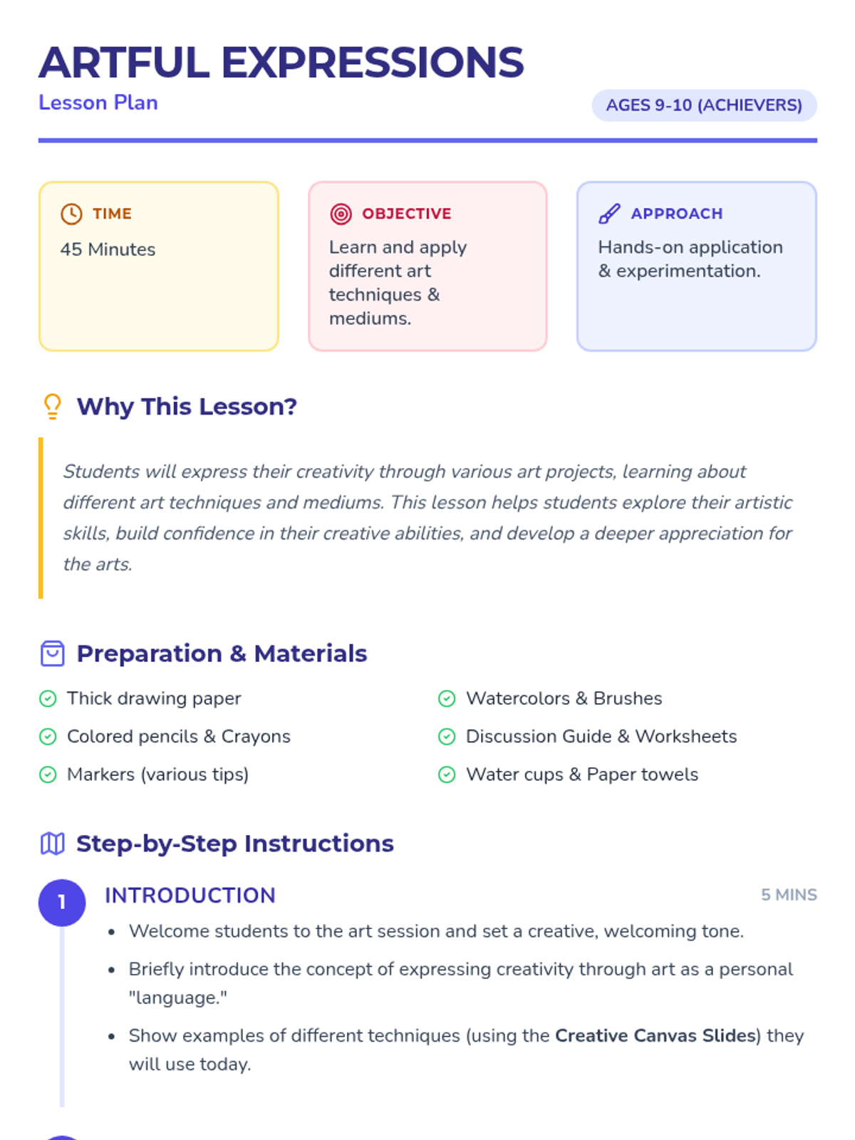 Students will express their creativity through various art projects, learning about different art techniques and mediums. This lesson helps students explore their artistic skills, build confidence, and develop a deeper appreciation for the arts.