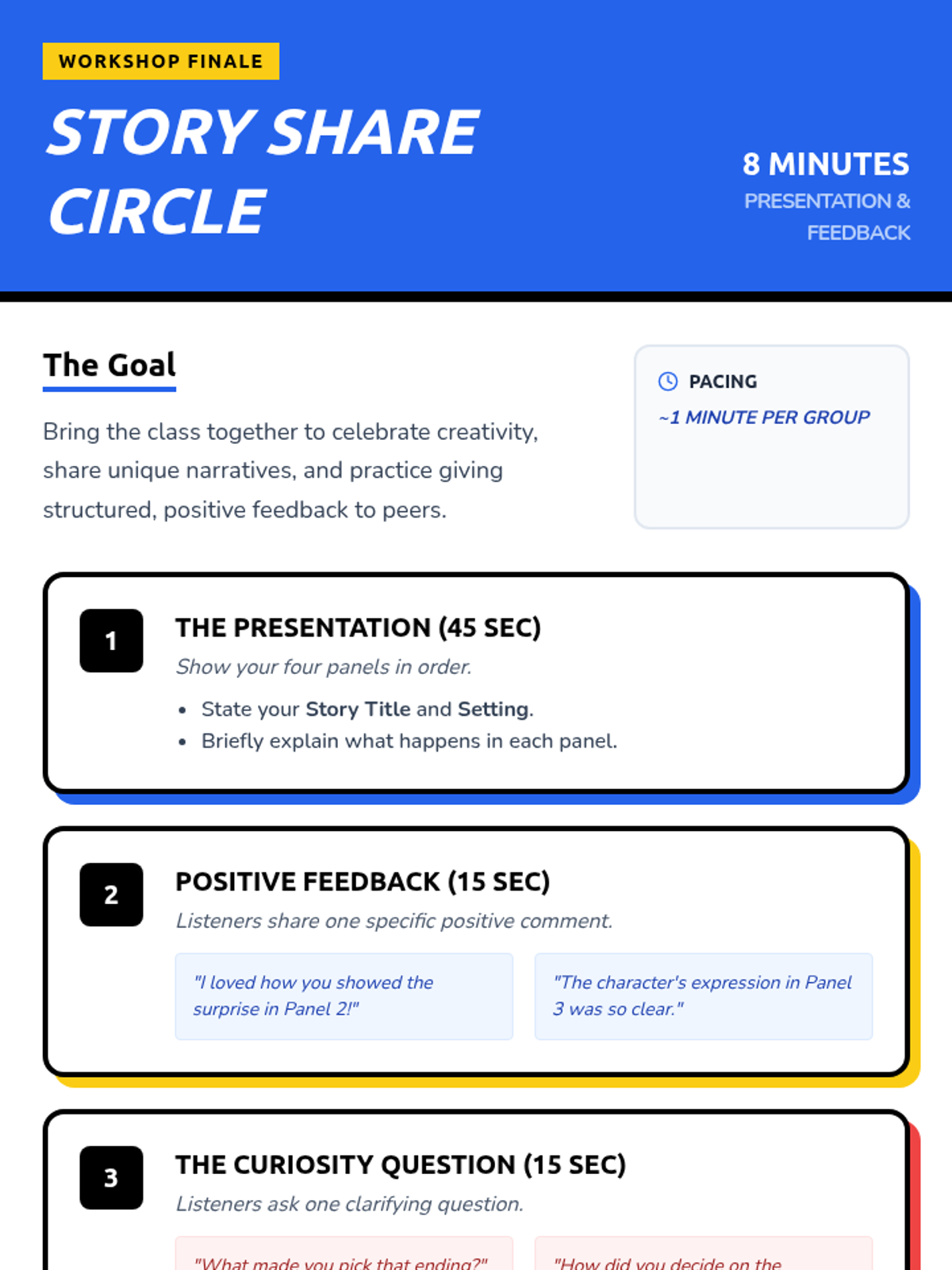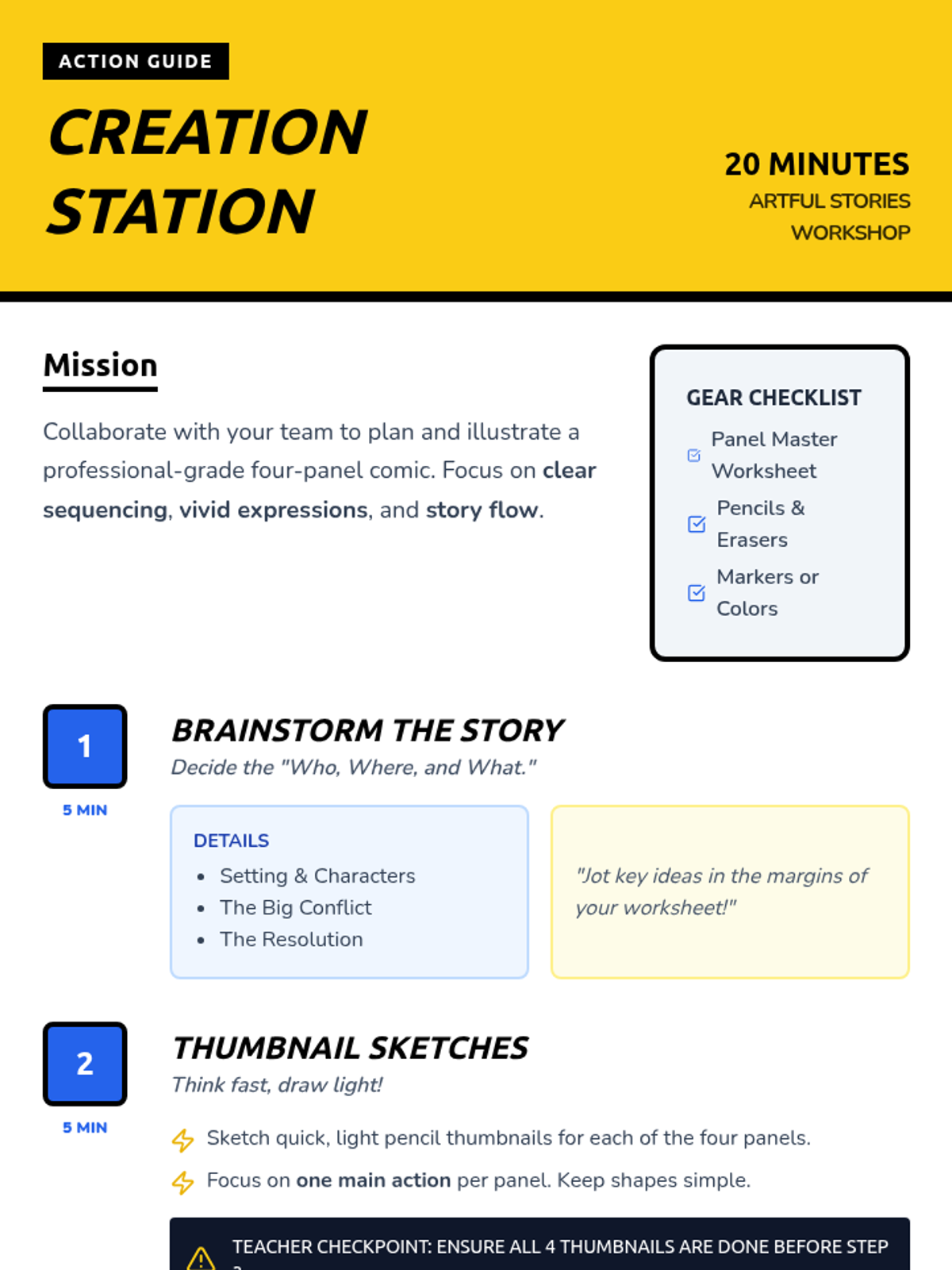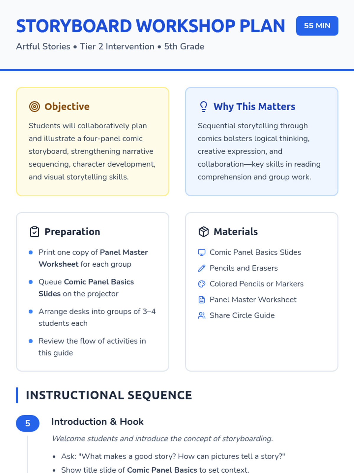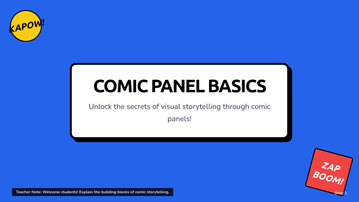 A collaborative 55-minute workshop for 5th graders to master sequential storytelling through comic panel creation. Students learn panel structure, character expression, and narrative flow before illustrating their own four-panel stories.