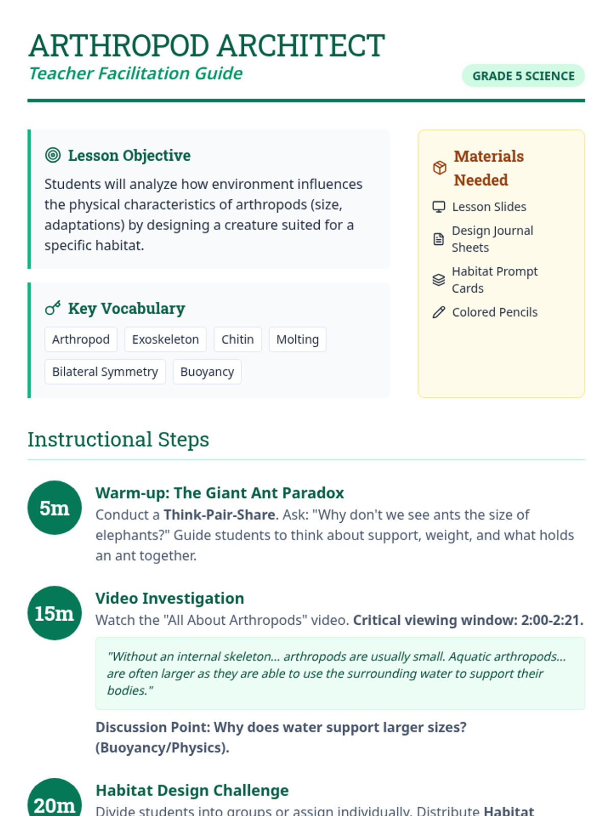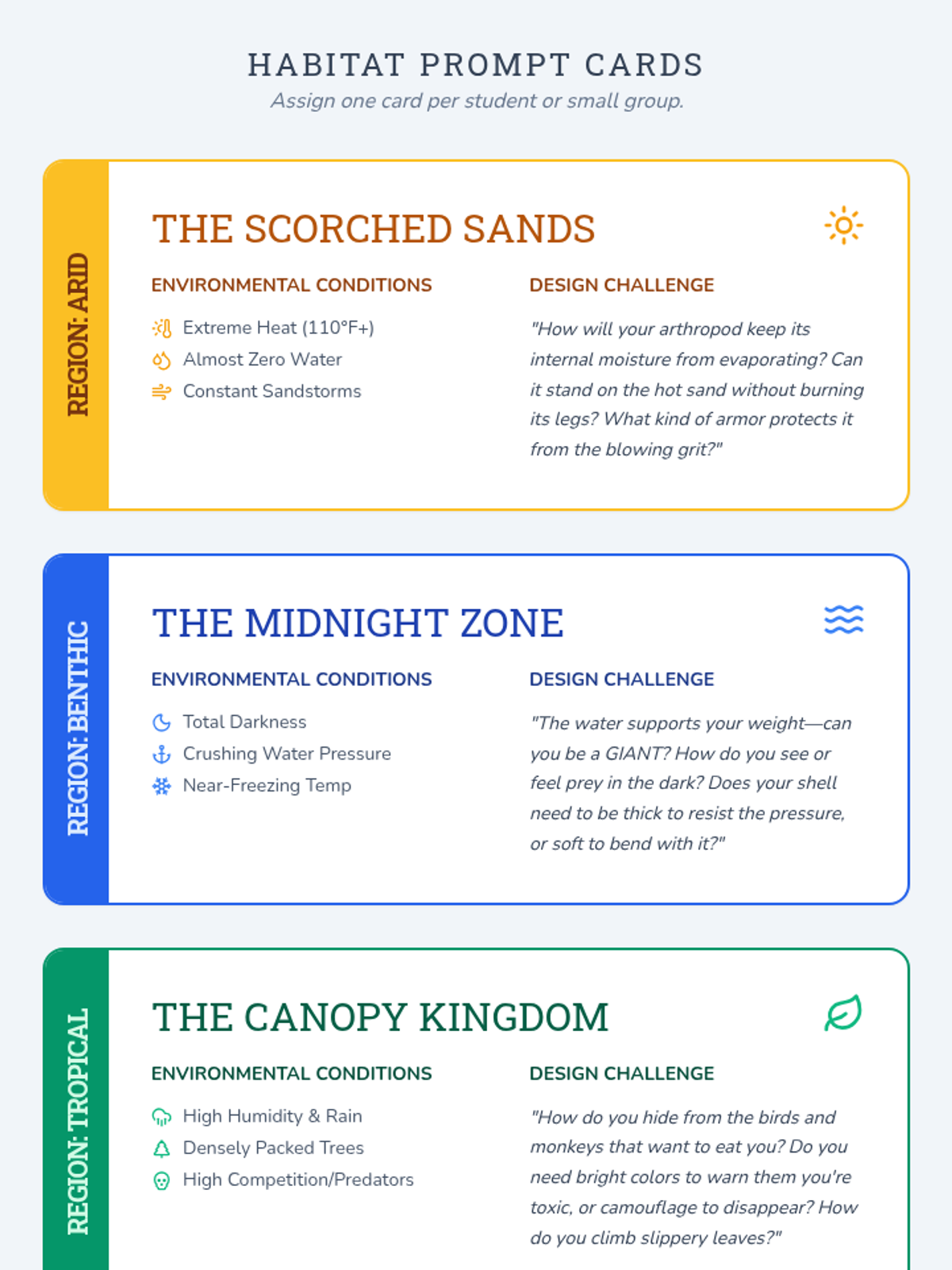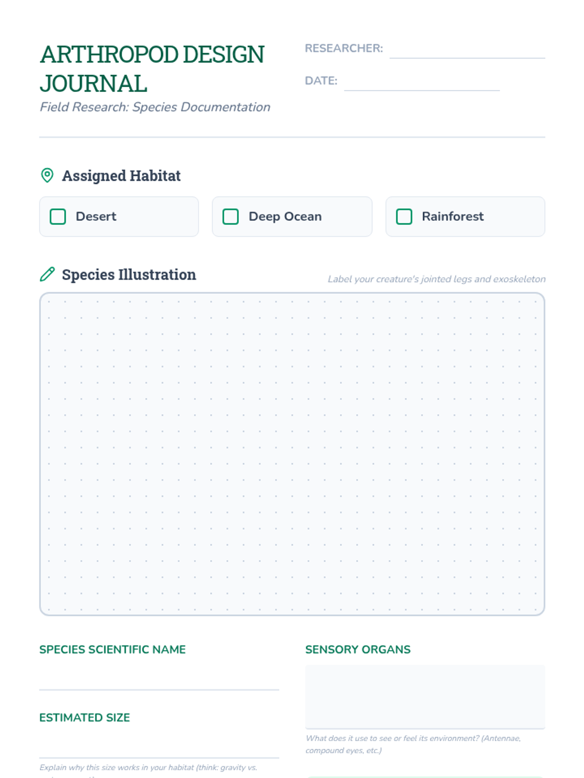 A lesson where students explore how environment and physics dictate the size and adaptations of arthropods, culminating in a creative design challenge.