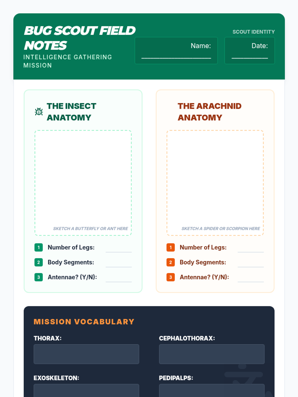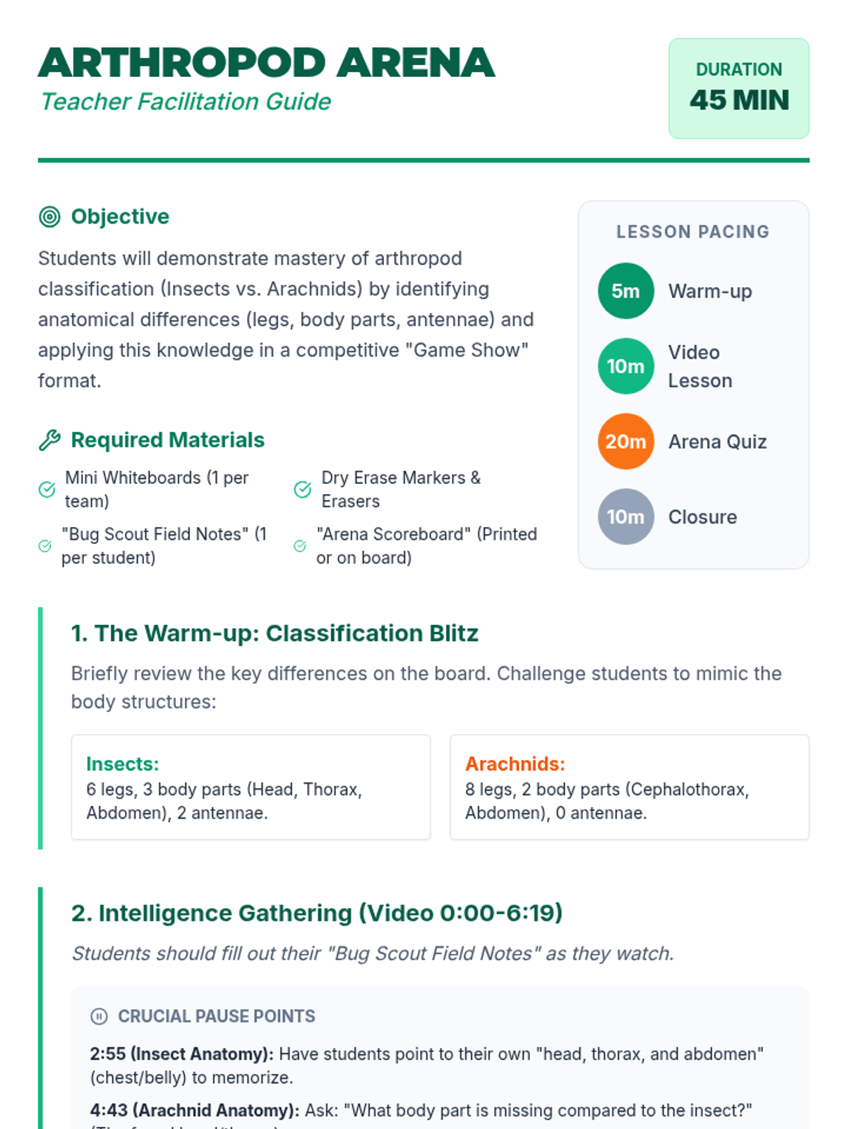 A high-energy, gamified lesson where students master the differences between insects and arachnids through a team-based video quiz and hands-on comparison.