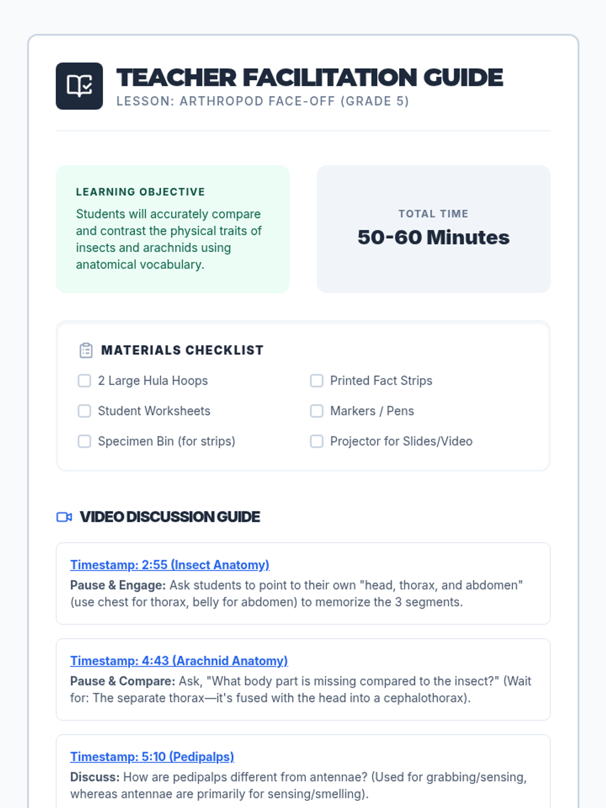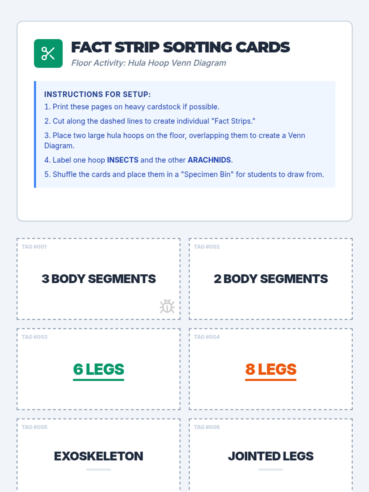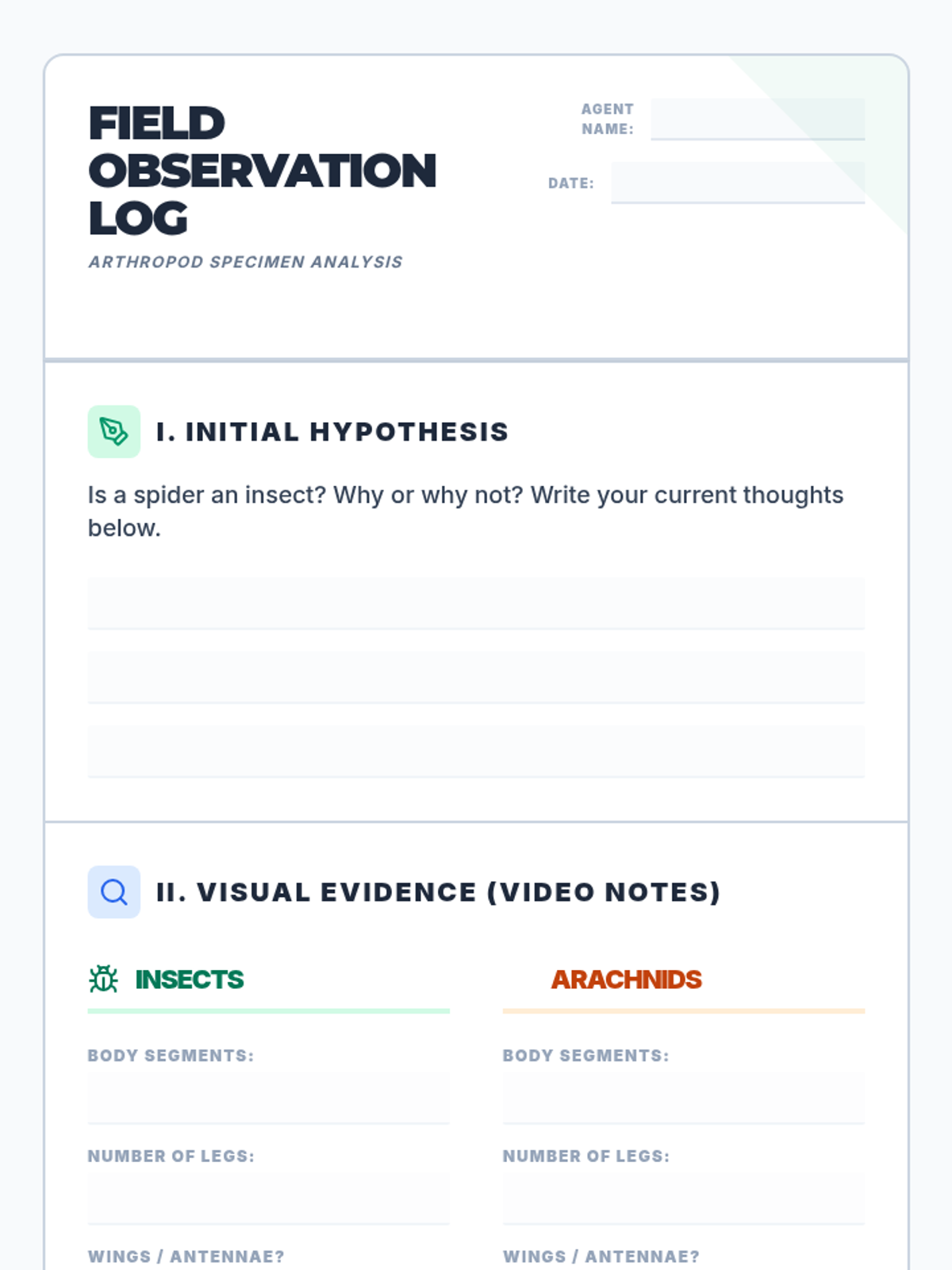 Students will investigate the anatomical differences between insects and arachnids through a deep-dive video, interactive floor Venn diagram, and field-note style classification.