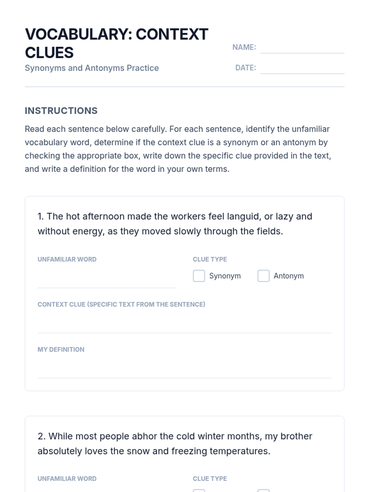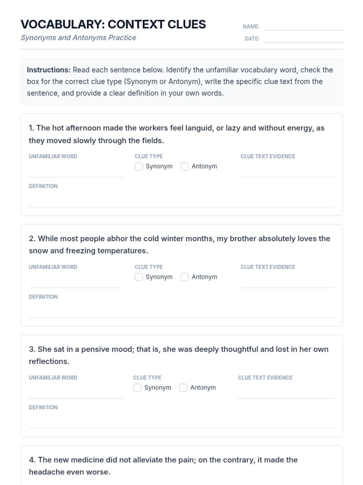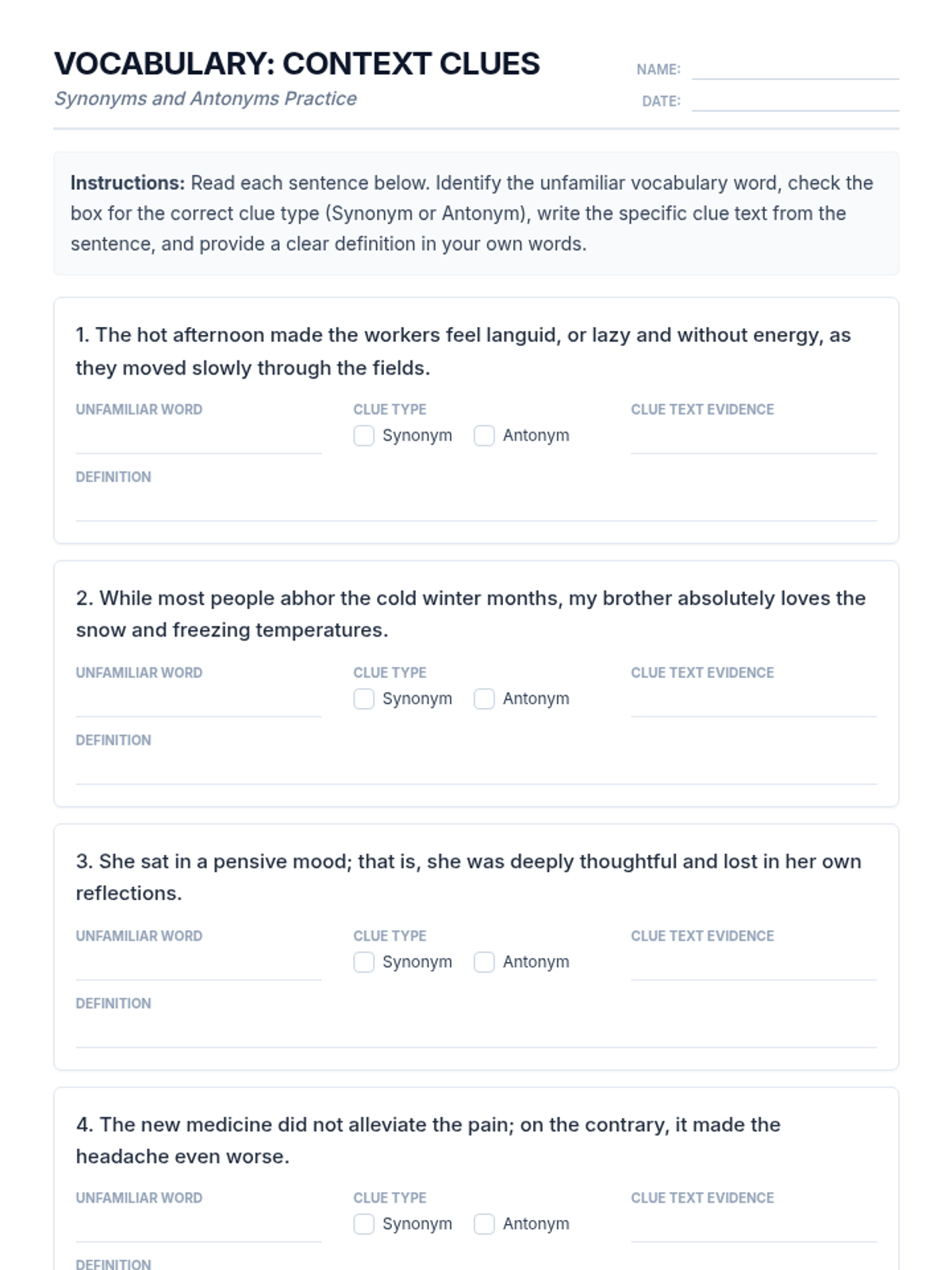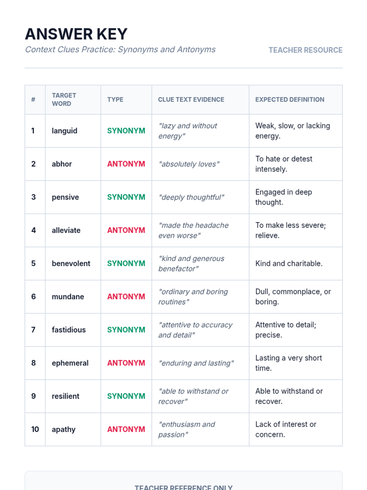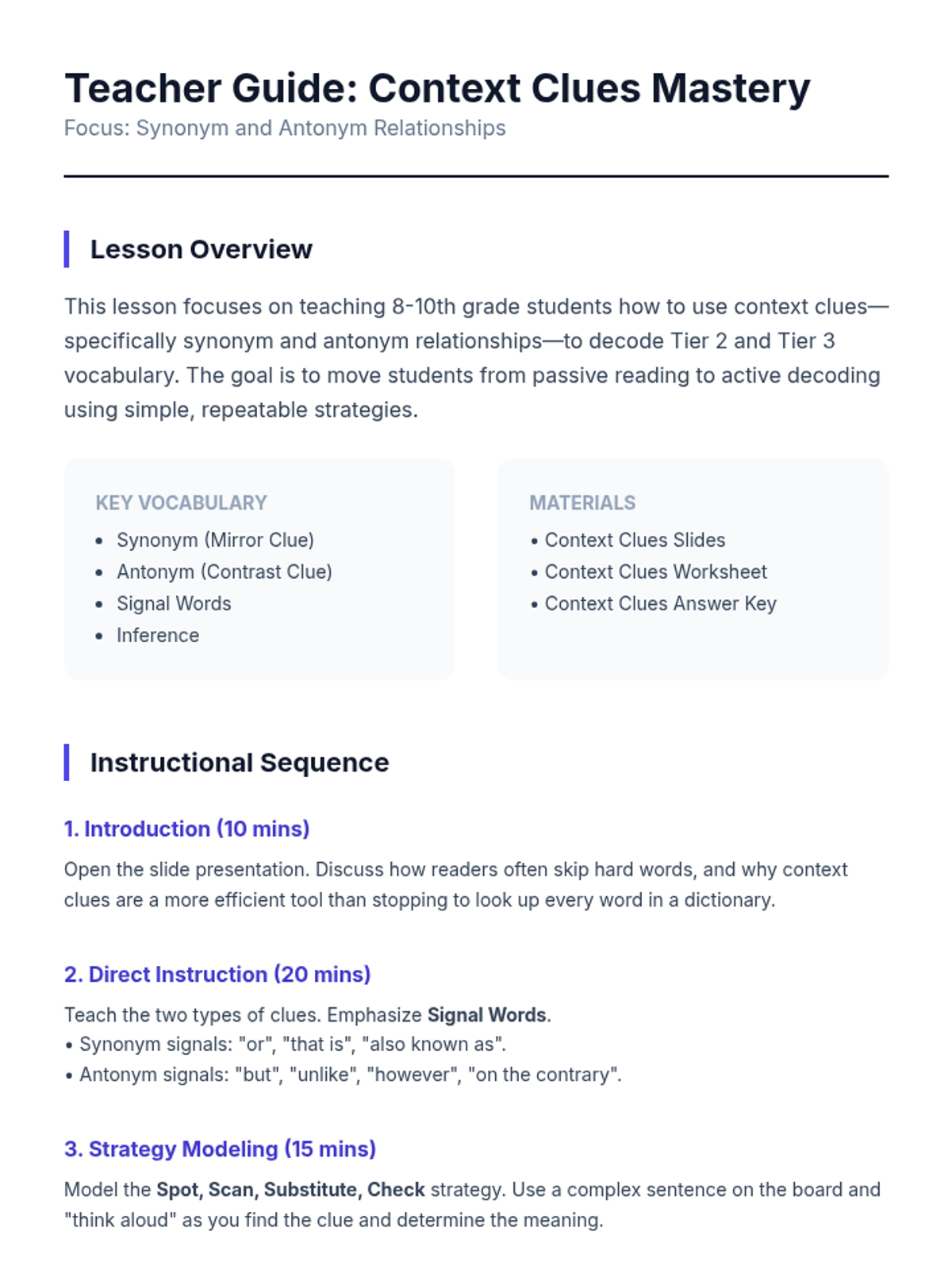 A comprehensive lesson for 8-10th grade students on mastering context clues, specifically focusing on synonym and antonym relationships to unlock challenging vocabulary.