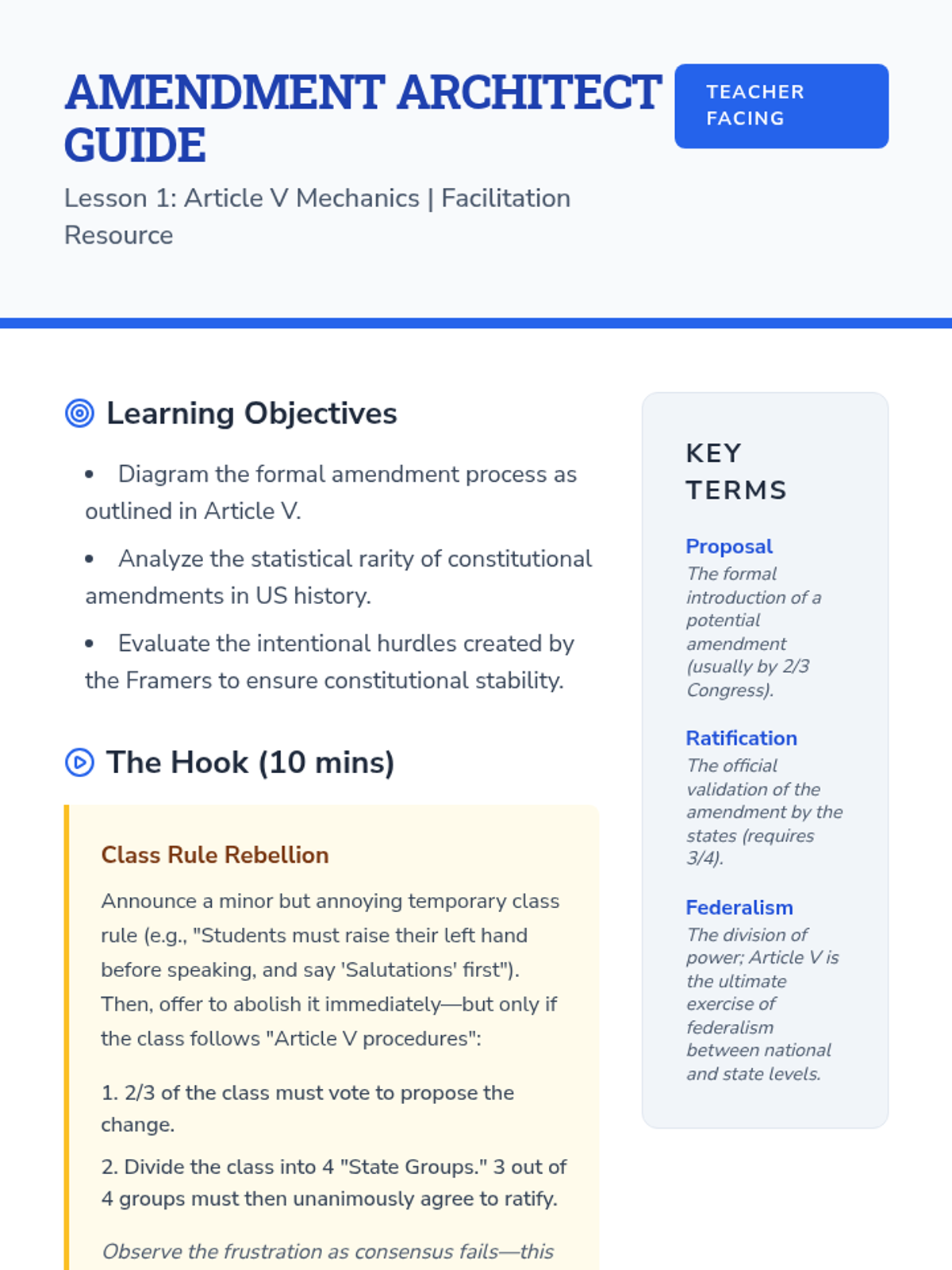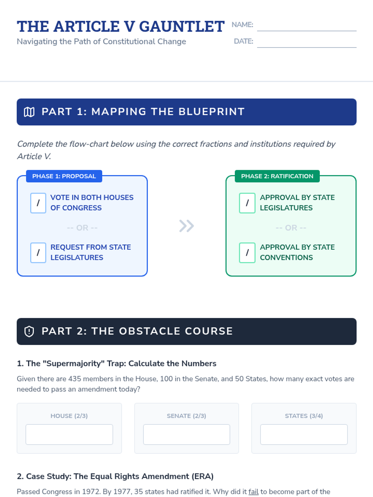 Students explore the formal amendment process of Article V through a simulation game and statistical analysis of why amendments often fail.