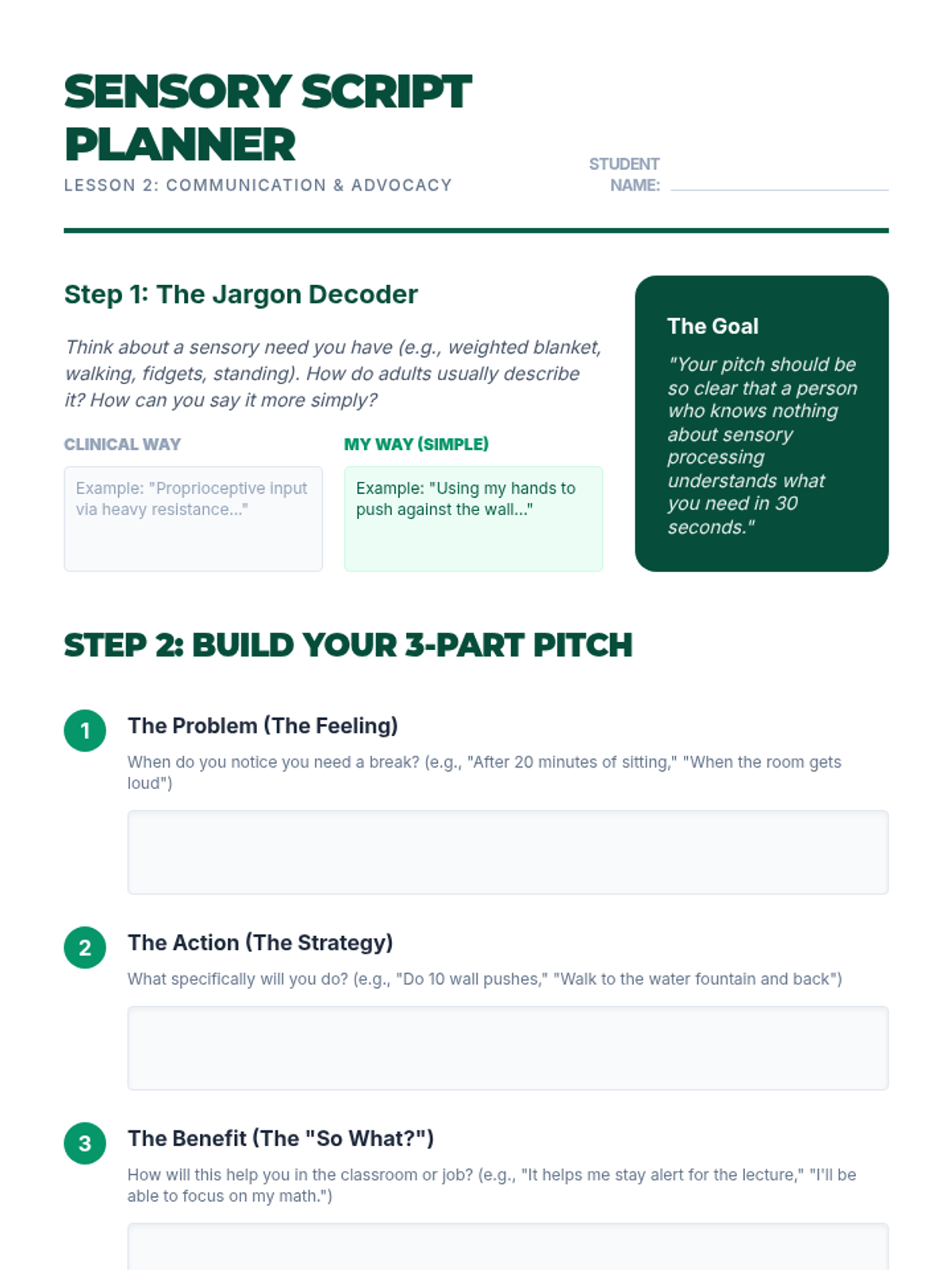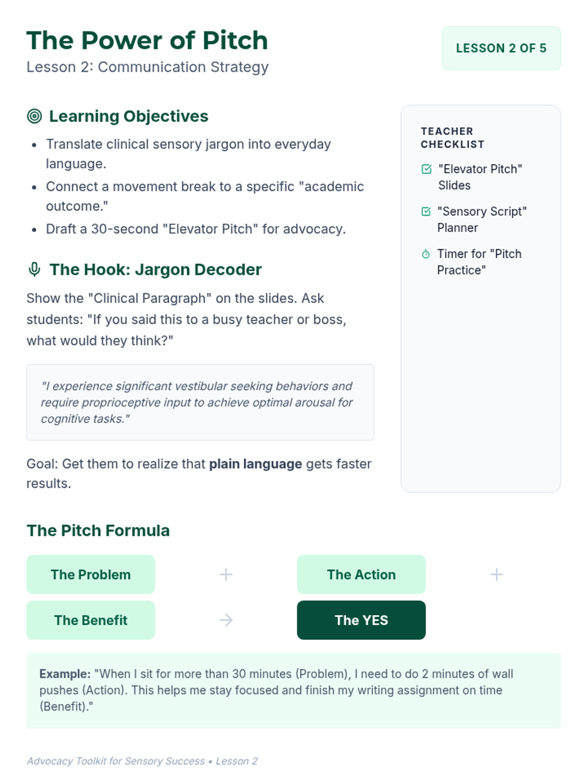 Focuses on crafting clear 'I' statements and an 'elevator pitch' that connects sensory needs to improved academic and functional performance.