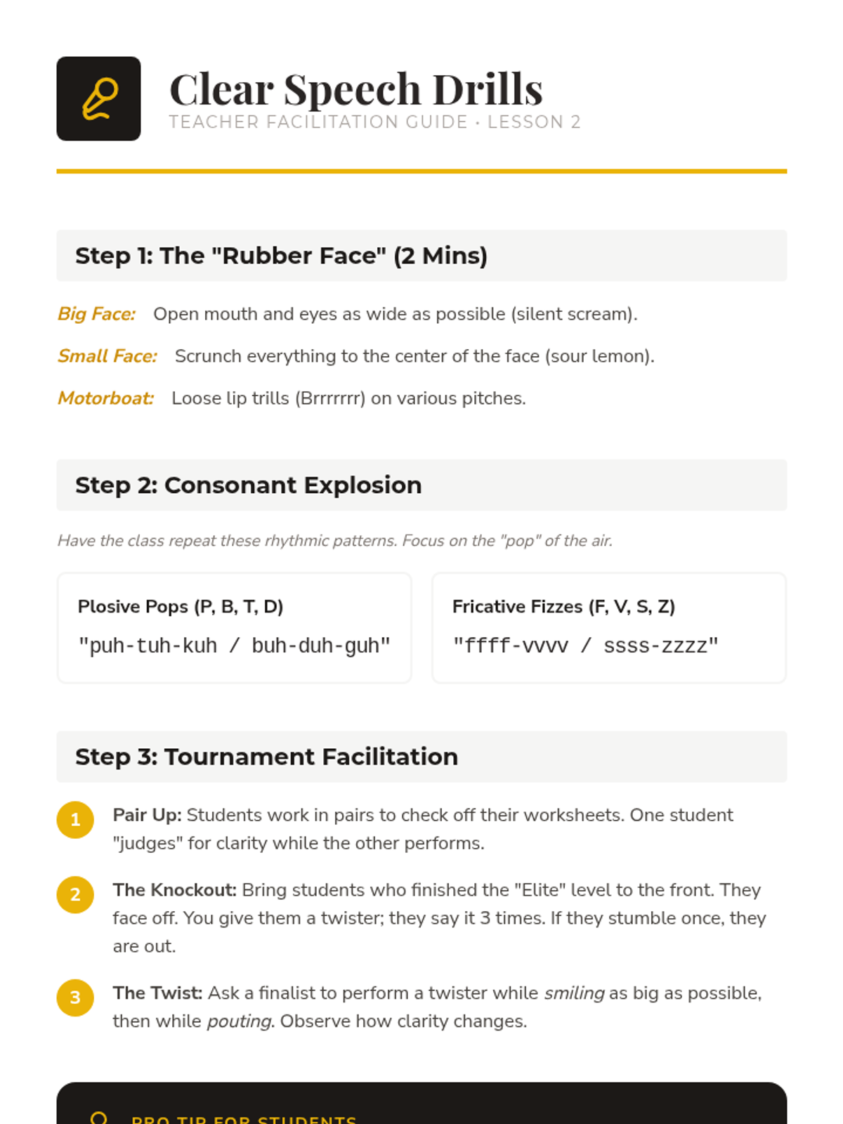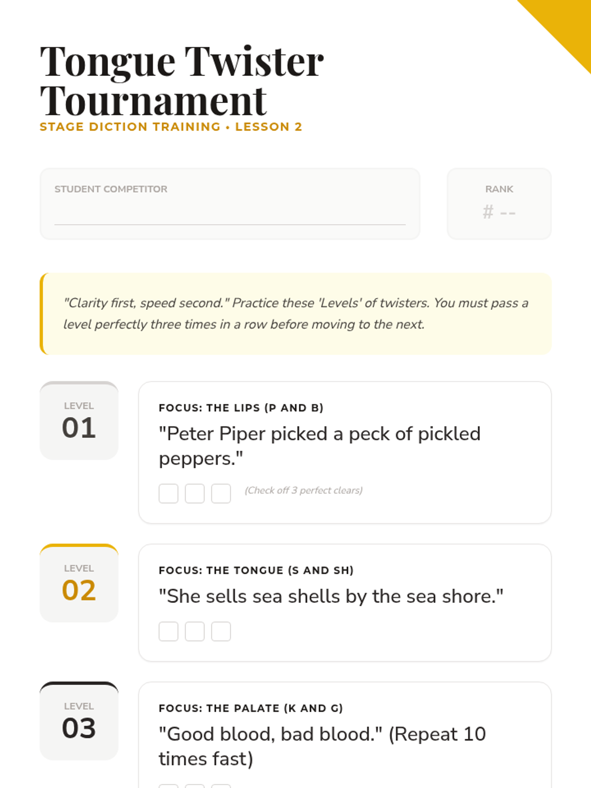 Focusing on clarity, students tackle tongue twisters and consonant drills to sharpen their diction and stage clarity.