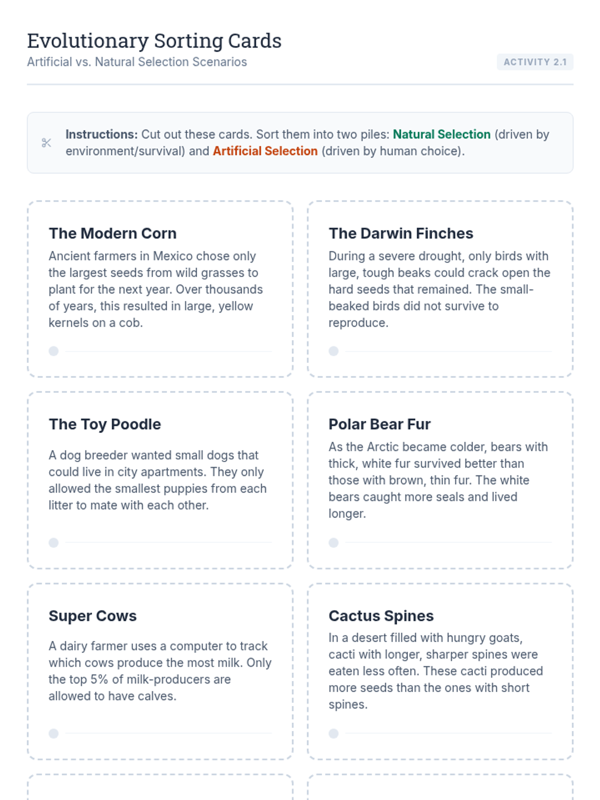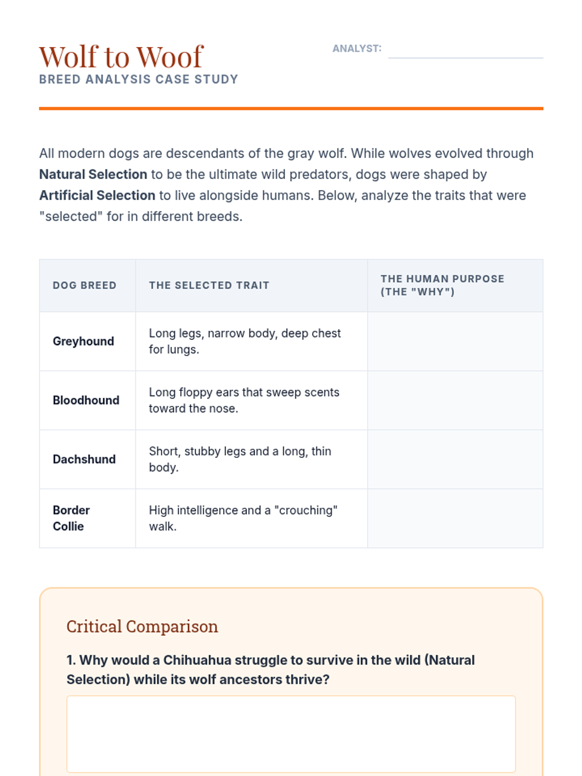 Students compare and contrast human-directed evolution (artificial selection) with nature-driven evolution. They analyze how wolves became dogs and identify human goals in breeding.